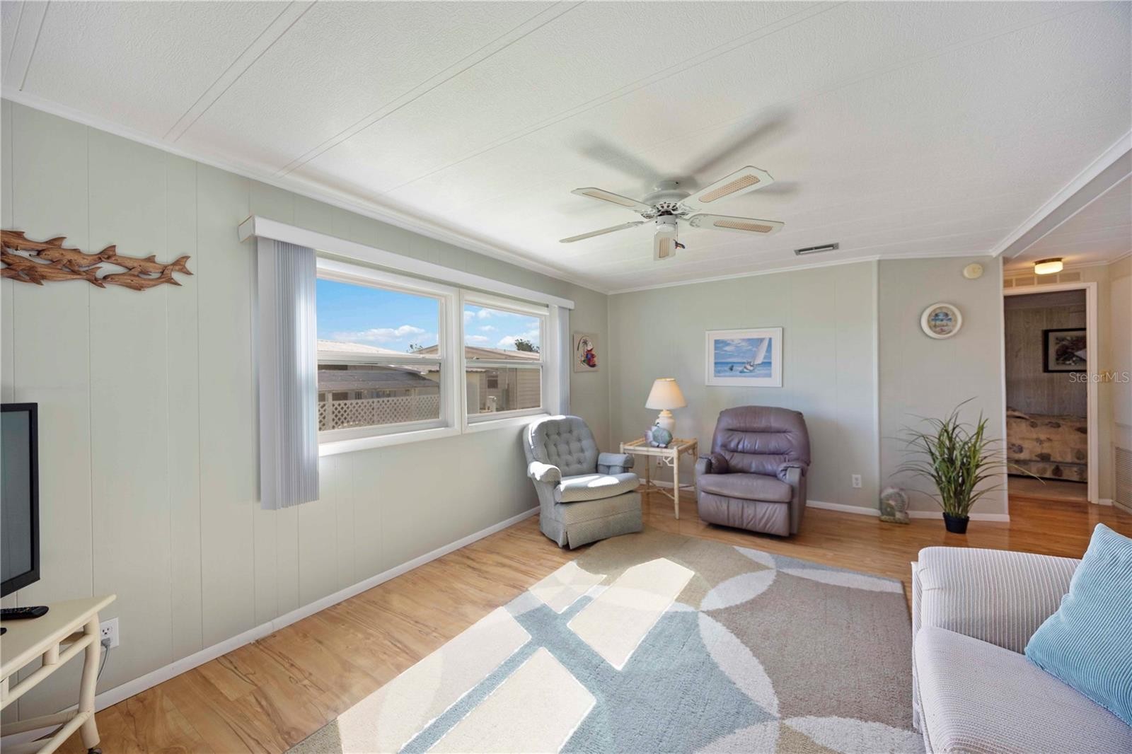 Welcome to Tidevue Estates – A Premier 55+ Land-Owned Community 4511 14th Street East is charming, turnkey furnished home is the perfect choice for year-round living or a sunny winter retreat. Nestled in the heart of Tidevue Estates, this land-owned property (no lot rent!) offers comfort, convenience, and a vibrant lifestyle. Step inside to discover 2 bedrooms, 2 bathrooms, laminate flooring throughout with plush carpet in the bedrooms, creating a cozy yet low-maintenance space. Abundant windows and two skylights fill the home with natural light, enhancing the bright, open feel. To your left, the kitchen features cheerful light green wood cabinetry, ample counter space, and a convenient breakfast bar. Across the way, a dining area with a built-in china cabinet and eating area is ideal for hosting guests and holiday gatherings. Come see what Florida retirement living is all about! The spacious living room is tastefully decorated in soft neutrals, with plenty of room to relax and enjoy your favorite shows on the big-screen TV. Enjoy peaceful mornings in the newly remodeled sunroom, complete with pull-down shades on every window for added privacy—perfect for sipping coffee and watching the world go by. The owner’s suite features a large walk-in closet and an en-suite bathroom, while the spacious guest bedroom is ideal for visitors or a home office. The oversized garage offers a washer and dryer, plus plenty of storage space and room for a workshop or hobby area. Low annual HOA fee of just $600 per year. Tidevue Estates offers resort-style amenities, including:? Solar-heated pool, Updated fitness center, Shuffleboard courts, Expansive library with a wide selection of books, Scenic bike trails and lakefront benches—perfect for evening sunsets Located just off Hwy 301, you’re minutes from top restaurants, shopping, I-75, and the Ellenton Premium Outlet Mall. A short drive takes you to the Gulf beaches, University Town Center Mall, and cultural attractions like the Mote Aquarium, Ringling Museum, and St. Armands Circle. Tidevue is a pet-free community. Tidevue Estates offers the perfect combination of location, lifestyle, and community charm.