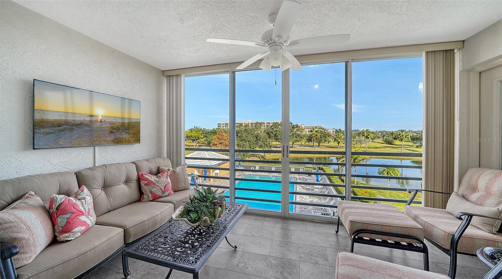 Enjoy sunny, panoramic views across the pool, lakes, and golf course from this beautifully updated two-bedroom, two-bath condo. Meticulously maintained and truly move-in ready, this residence offers an inviting blend of comfort, style, and effortless Florida living. The thoughtfully opened kitchen features a large granite island, designer granite sink, tasteful backsplash, cabinet lighting, updated appliances, and abundant storage, all filled with natural light and complemented by a charming eat-in nook. Updated luxury vinyl plank flooring flows throughout the open dining and living area, which extends seamlessly into the patio room - perfect for relaxing while taking in the long, tranquil views. The split floor plan offers privacy and flexibility, with a spacious primary suite featuring plantation shutters, designer finishes, a massive walk-in closet, and an ensuite bath. The guest bedroom is set apart from the primary and enjoys easy access to the guest bathroom, highlighted by an updated vanity and coastal-inspired finishes. A roomy interior laundry room with full-size washer and dryer provides added convenience and additional storage. Updated windows and a newer roof, maintained by the association, along with a covered assigned parking space, offer added peace of mind for Florida living. From your elevated vantage point, take the elevator - or just a few steps - down to the heated community pool, or enjoy a short stroll to the clubhouse featuring neighborhood activities, a fitness center, game room/library, banquet hall with indoor kitchen, and poolside patio with grill. HOA dues cover all of these amenities, along with building insurance, cable, internet, and water - an exceptional value. Pinebrook Ironwood Golf Club is a fun, pay-as-you-play course located right within the community, with optional memberships available. You’re also conveniently close to dining, shopping, healthcare, and just a short drive to the world-famous Gulf beaches. High-end furnishings are negotiable, making the move to your Florida retreat even easier. Don’t miss the opportunity to experience the serene views and easy lifestyle this welcoming condo has to offer - schedule your showing today!