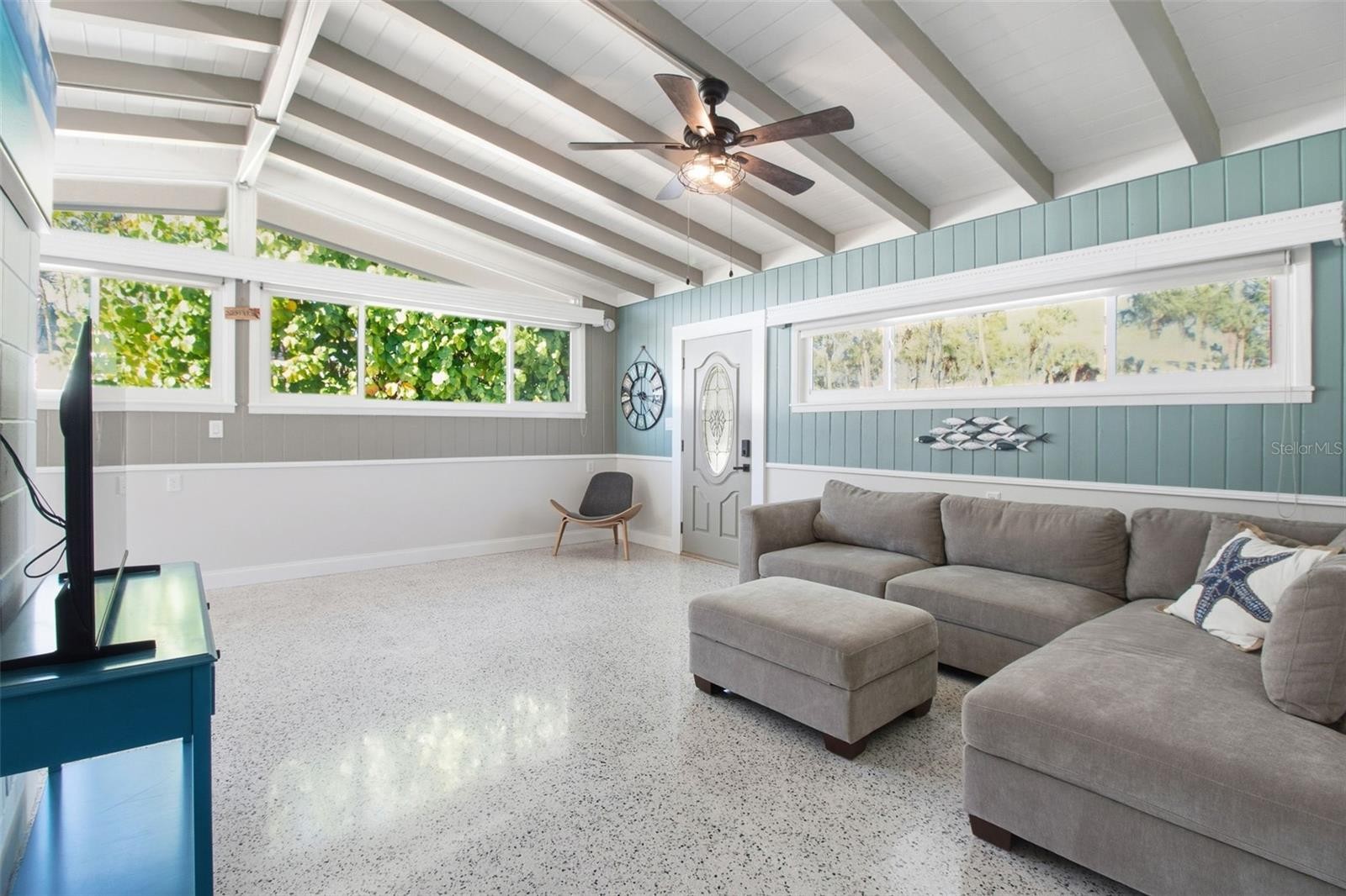 Easy livin’. A perfect blend of old-school cool and 2026 finishes, this mid-century modern bungalow is a true "buy it and move-in tomorrow” type home. Most importantly, no high condo/HOA fees. Polished terrazzo floors, vaulted ceilings, it’s just fun all over. Fully renovated with crisp coastal selections. It has a nice sunroom for a large party gathering or workout room, art studio, play area. Carport equipped with RV hookups and motor court driveway. Plenty of parking space for bikes, scooters, and golf carts. The landscaping is immaculate, professionally designed by the owner including an advanced drainage system helping keep you dry 24/7/365. Not far from the Village, close to the beach, and minutes to North bridge. Clean, affordable, easy beach living.