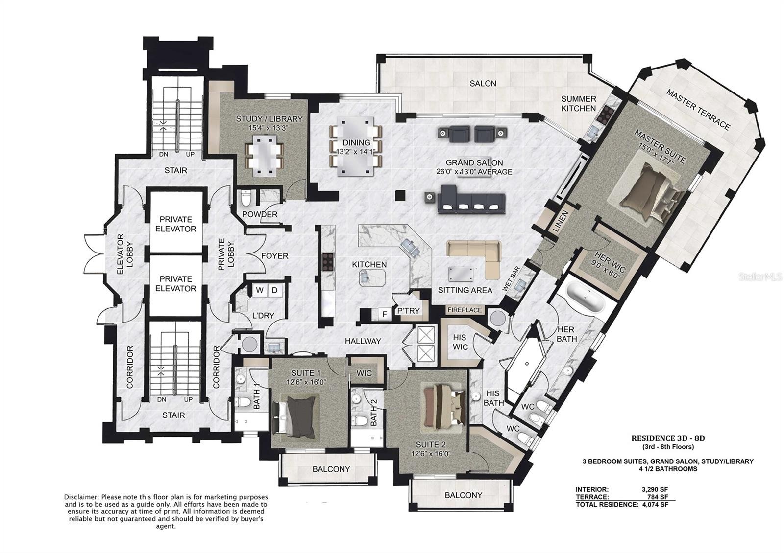 Positioned on the third floor of La Bellasara, this expansive waterfront residence offers refined living on Sarasota Bay with panoramic views of the marina, open water, and the downtown skyline. Spanning approximately 3,290 square feet of interior living space plus several generous terraces, Residence #304 delivers the scale and privacy of a single-family home within one of downtown Sarasota’s most respected boutique enclaves. A private elevator opens directly into the residence, welcoming you into a gracious foyer that leads to the Grand Salon—an impressive living and dining space framed by floor-to-ceiling glass and some 11-foot tray ceilings. Marble flooring, crown molding, gas fireplace, wet bar with wine cooler, and thoughtful architectural detailing create a timeless backdrop for entertaining and daily living, while expansive sliding doors extend the living space onto the large waterfront salon terrace overlooking the bay and marina. The kitchen is designed for both function and style, featuring solid wood cabinetry, stone countertops, a central island with breakfast bar seating, pantry storage, and premium appliances including a gas cooktop, built-in ovens, wine refrigeration, and custom shelving. The open dining room area enjoys water views, making it a natural gathering point throughout the day. The primary suite is a true retreat, offering a dedicated bayfront terrace, dual walk-in closets, and marble his and her bathrooms. Two additional bedroom suites are thoughtfully separated for privacy, each with balconies, walk-in closets and en-suite baths. The study/library (with closet) provides flexible space for a home office, quiet reading room, or fourth bedroom. Desirable conveniences to complement this perfectly placed residence include a private two-car garage, secure storage, and your own dock with lift. La Bellasara residents enjoy a gated setting with on-site management, fitness center, resort-style pool and spa, and many community amenities, all within a ten-minute walk to the heart of Sarasota’s city center. Located on coveted Golden Gate Point, La Bellasara places you moments from downtown Sarasota’s cultural and culinary scene. Enjoy nearby Marina Jack, Selby Gardens, Burns Court, The Bay Park, and the city’s acclaimed theaters, galleries, and waterfront dining. St. Armands Circle and Lido Beach are just minutes away, offering effortless access to shopping, recreation, and Gulf beaches.