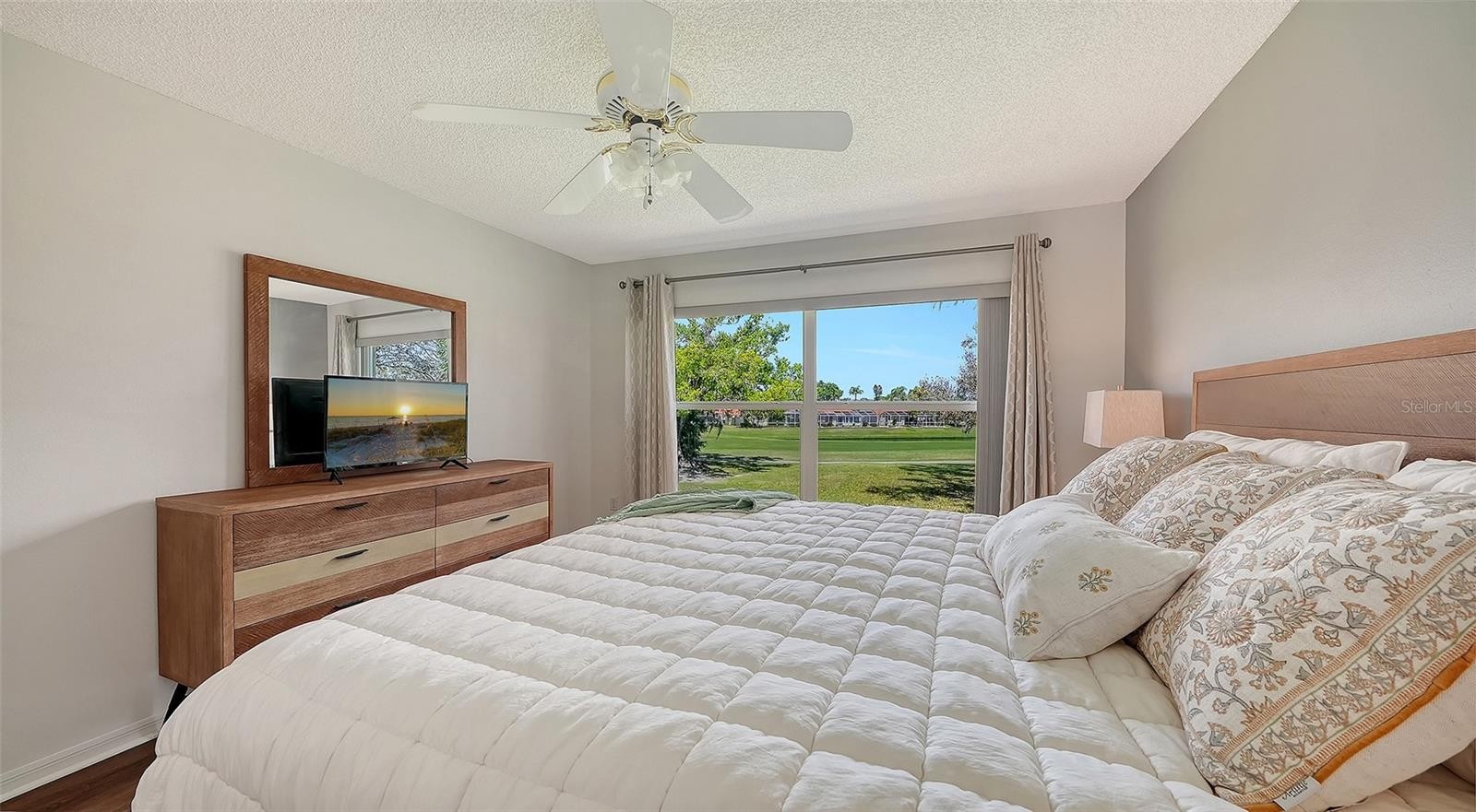 This tastefully updated second-floor 2BR/2BA condo offers sweeping golf course views and an inviting country-club lifestyle. The open living and dining area features vaulted ceilings and flows to a screened balcony enclosed with sliding vinyl panels, creating additional year-round living space while enjoying peaceful fairway views. The kitchen has been updated by the current owner with new cabinetry, quartz countertops, newer appliances, a convenient breakfast bar, and a charming bistro dining area. Luxury vinyl plank flooring runs throughout the great room and both bedrooms for a clean, modern look and easy maintenance. The primary suite also overlooks the golf course and features a bath with a newer vanity and a beautifully updated walk-in shower. The guest bath includes a tub/shower combination. Additional features include a new A/C system installed in 2025 and a 2024 washer & dryer. The detached one-car garage with a private owner’s closet provides valuable extra storage space. For a quick dip, there is a community pool located just steps from the condo. Residents also have a full membership to Peridia Golf & Country Club, featuring an 18-hole golf course, tennis, pickleball, an active social calendar, the popular Terrace on the Green restaurant, and casual poolside dining at the Tiki Bar. Conveniently located just a short drive to shopping, Gulf beaches, downtown Sarasota, I-75, and 50 miles from Tampa. Furnishings negotiable.
