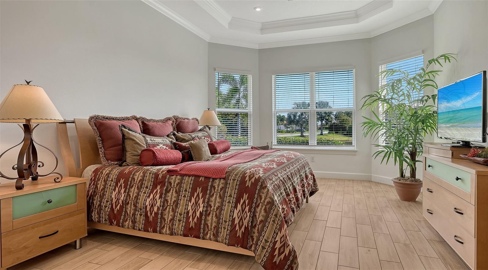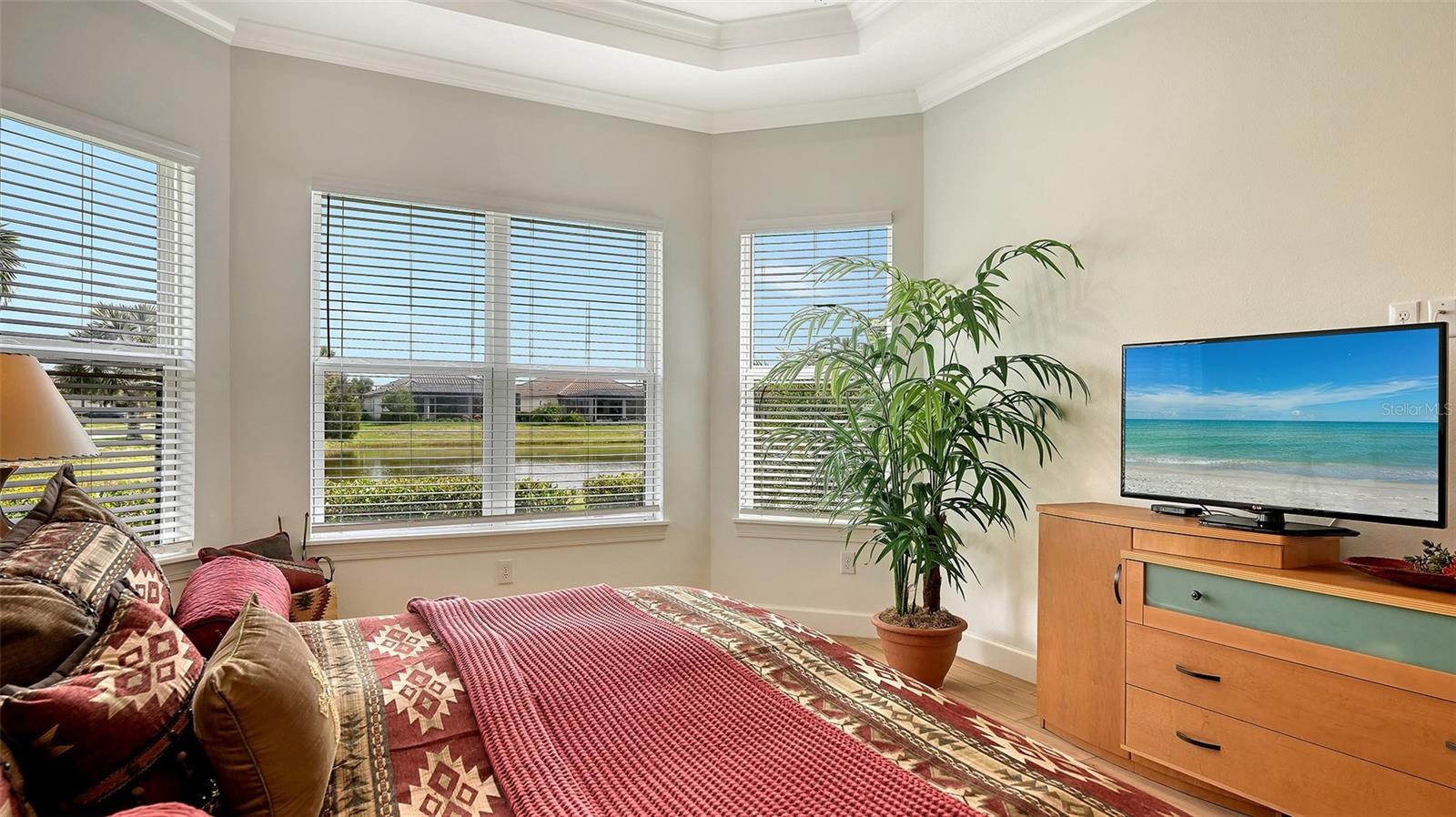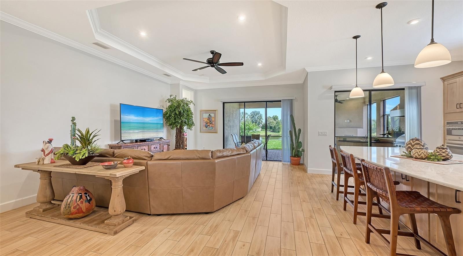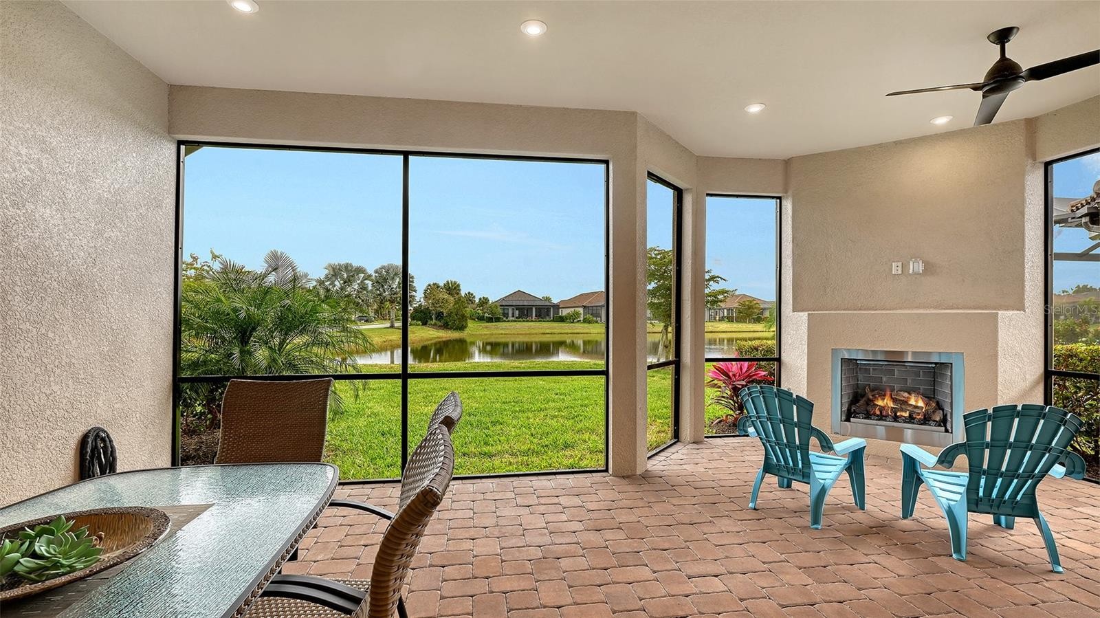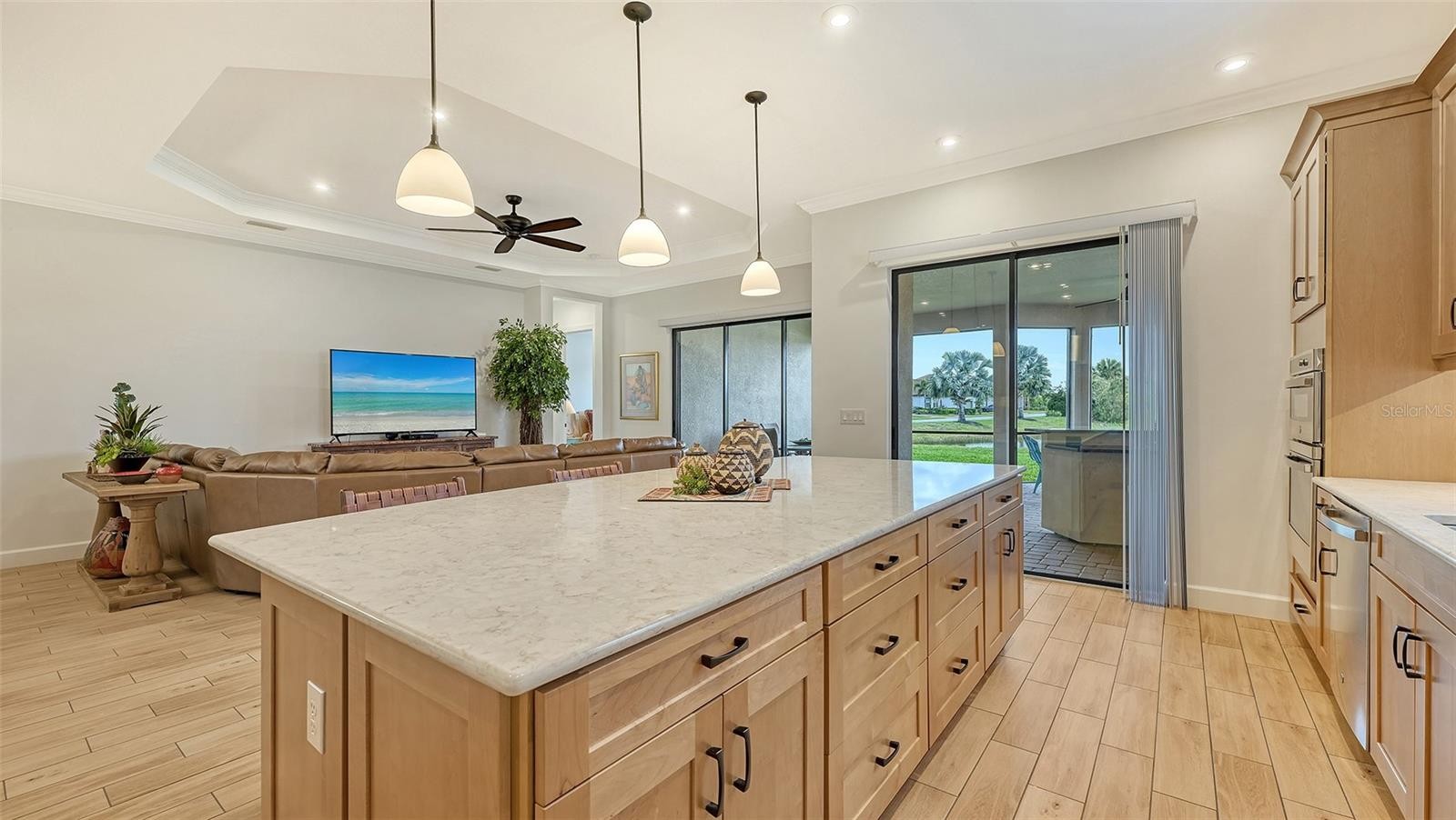 Located in Azario Esplanade, one of Lakewood Ranch’s premier resort-style communities, this impeccably maintained three-bedroom, three-bath residence with a private office offers the thoughtfully designed Lazio open floor plan by Taylor Morrison and is situated on a premium lake homesite. The private office features double French doors, and the second bedroom includes its own en suite bath, offering complete privacy for guests. The kitchen is well-equipped with a large center island, roll-outs in the cabinetry, a walk-in pantry, built-in oven and microwave, and a gas cooktop, while the kitchen, baths, and laundry room showcase solid maple wood cabinetry. The spacious primary suite includes a bay window sitting area, oversized walk-in closet, double vanity, walk-in shower, and private water closet. Two sets of sliding glass doors from the kitchen and great room lead to an extended lanai that seamlessly connects indoor and outdoor living, where peaceful lake views can be enjoyed, complete with a full outdoor kitchen, wrap-around bar, and fireplace for cooler evenings. This home is well-appointed with tray ceilings, crown molding throughout, recessed lighting, ceiling fans, quartz countertops, soft-close cabinetry, and upgraded tile flooring in all rooms. Additional features include an upgraded laundry room with sink and storage cabinetry, a garage with a four-foot extension, epoxy-painted flooring, and overhead storage racks, landscape lighting, maple wood shelving in all closets, and more. This home also benefits from lower HOA fees as it does not include a deeded golf membership, while annual golf passes are available. Residents enjoy access to Azario’s exceptional amenities, including the Culinary Center, championship golf, lagoon-style pool, wellness spa, fitness center, tennis and pickleball courts, and an active social calendar, all conveniently located near Lakewood Ranch Main Street, Waterside Place, University Town Center, downtown Sarasota, I-75, beaches, shopping, dining, schools, and medical facilities. Lakewood Ranch is the number one best-selling, multigenerational community in the country.