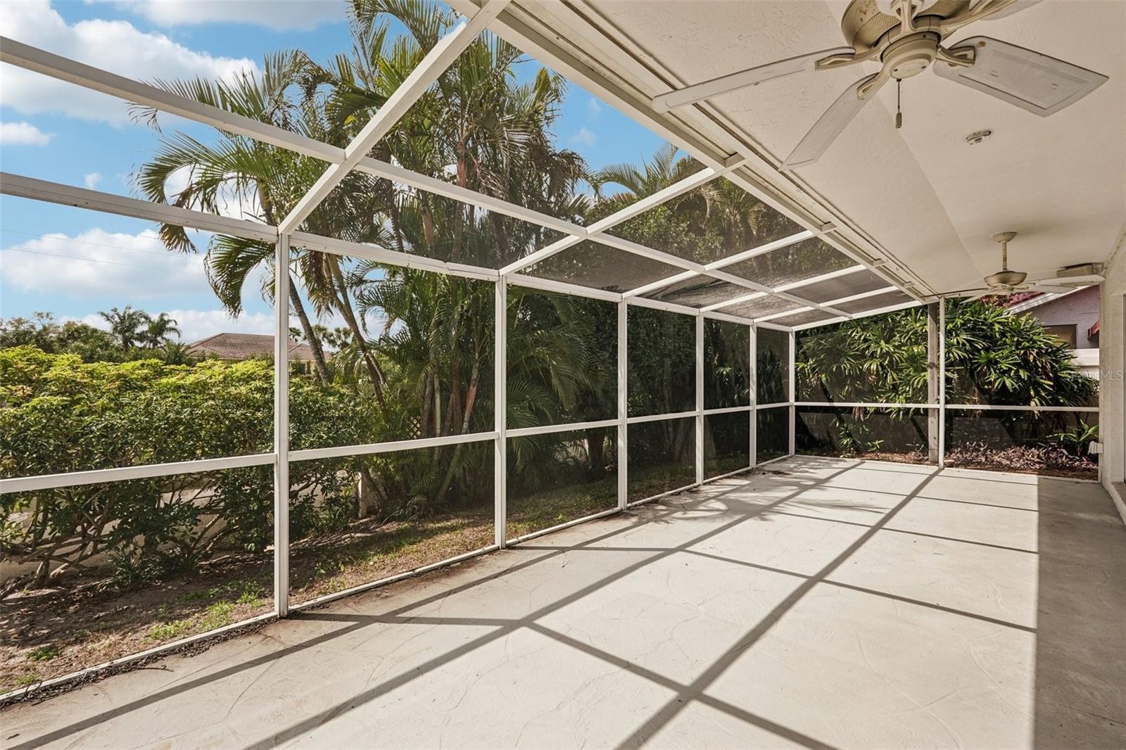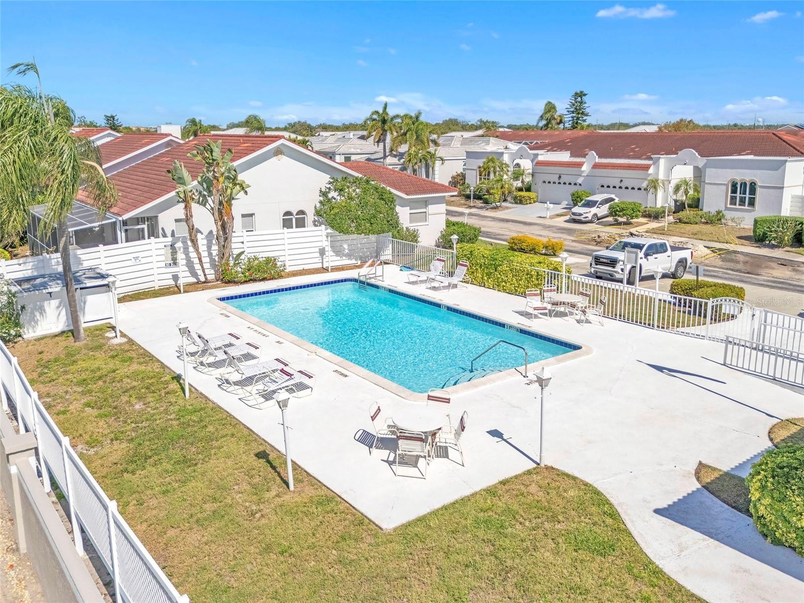 One or more photo(s) has been virtually staged. This exceptional villa offers the ideal combination of space, layout, and location. Just under 8 miles from Anna Maria Island, this 3-bedroom, 2-bath villa with an attached garage is the perfect place to call home. The community pool is next door—just step outside, walk around the corner, and enjoy your tropical poolside retreat. Inside, you’ll love the vaulted ceilings and open living/dining floor plan that flows seamlessly to the spacious screened lanai—perfect for relaxing after a day at the beach or a round of golf. Stunning large-format diagonal tile flooring runs throughout, complementing a wide range of styles and décor. The kitchen features beautifully updated tall cabinetry, easy-care quartz countertops, and breakfast bar. A large vaulted primary bedroom leads into the en suite bath with double sinks, and updated tile shower. Additional updates include a Rheem A/C system installed in 2021, along with plantation shutters and slider blinds added in 2022. The HOA covers cable, internet, garbage and recycling and exterior maintenance (including the roof!) making for easy, low-maintenance paradise living.