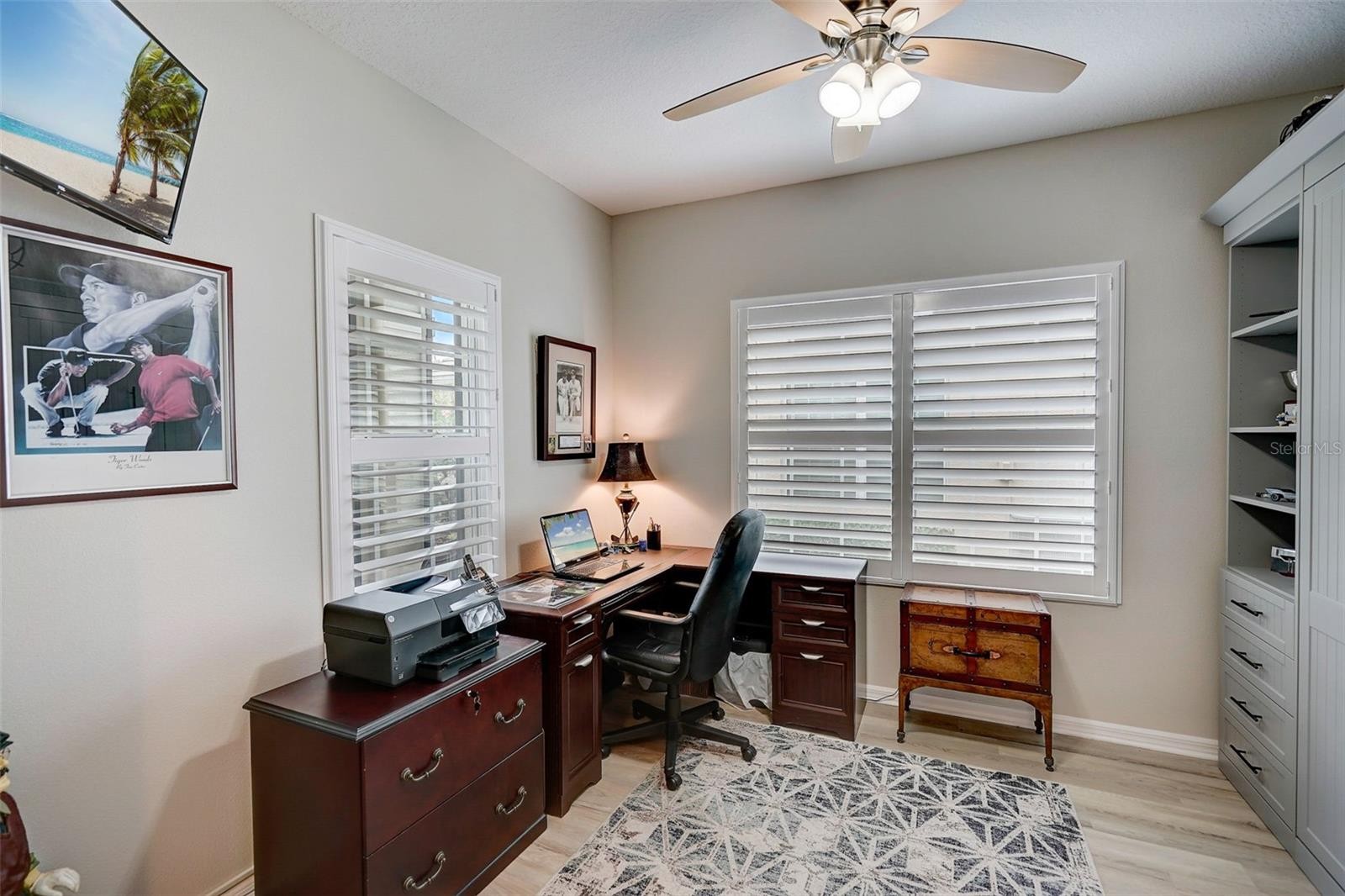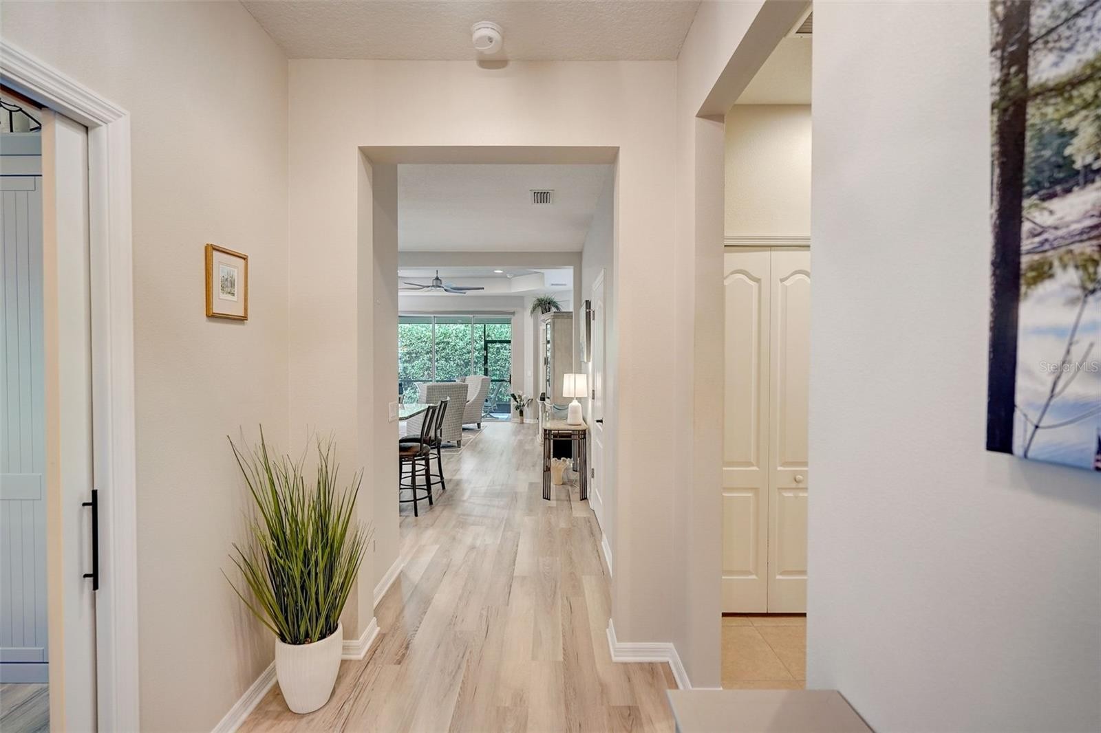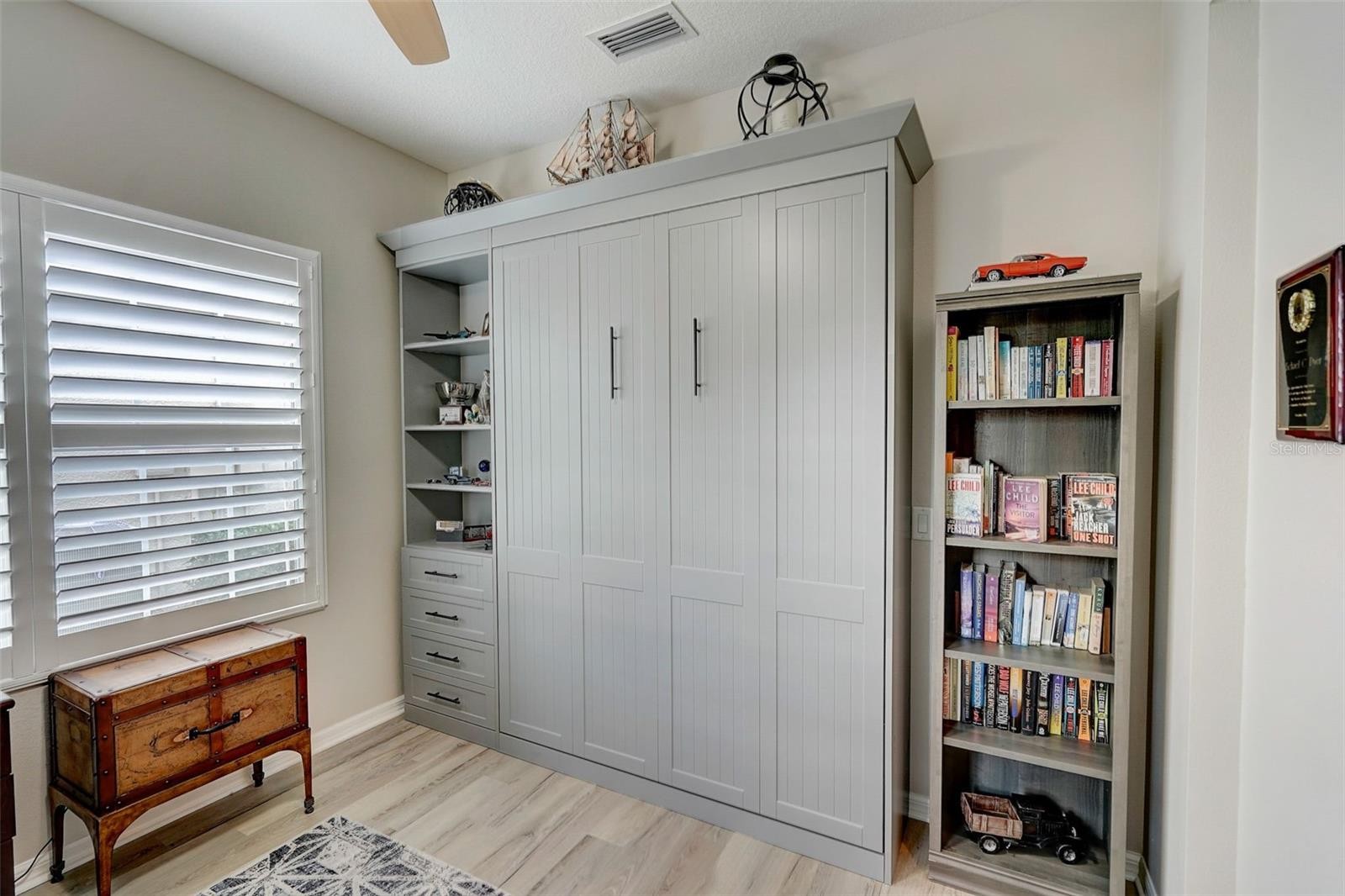 Incredible opportunity to own a wonderfully updated villa in the maintenance-free, gated community of Fairfield with LOW HOA fees. A covered entryway greets you and is a great place to enjoy a morning coffee or chat with neighbors; and is made all the more comfortable by a remote-controlled roll-down screen installed above. Coming inside, you’ll first notice the beautiful high-end luxury vinyl plank flooring installed throughout the common areas. The home interior has been freshly painted with an in-vogue light gray. Nominally a full 2 bed 2 bath, a den space has been updated so it can be closed off and includes a murphy bed, making for a ready-made third sleeping area. This room can easily function as anything that fits your needs, including as a dining room or office. An open kitchen comes outfitted with lovely granite countertops, a GAS stove, and plenty of cabinet space, including a large pantry equipped with pull-out drawers. Tall ceilings allow for plenty of natural light and help accentuate the size of the kitchen/living space. Glass sliders lead out from the spacious living room to a private screened lanai, perfect for entertaining or taking in a beautiful Florida evening. All of the windows are outfitted with charming plantation shutters and the lanai shutter can be closed up with an easy-to-use modern Vertiglide blind. The owner’s suite is a generously-sized room and comes complete with his-and-her closets. The master bath also comes with two vanities and a nice, large walk-in shower with the valve nicely situated right where you step in. Storage is no issue in this home: the laundry closet (equipped with two nice front loading LG units) has extra shelving and across the way the linen closet was expanded to add depth and space. This villa comes with a two-car garage with new shelving and cabinetry for extra storage. Other features of note include the addition of gutters around the house, high-end fan in the living room, and new screen for the front door, allowing for a lovely cross breeze on cooler days. Fairfield is a quiet, friendly neighborhood where one can make use of a massive pool area that includes a jacuzzi and grilling area. A clubhouse and gym are also part of the amenities. The community is conveniently located near I-75, is close to shopping and dining options, and an easy drive to Sarasota’s happening University Town Center. Anna Maria Island and Bradenton beaches are a straight shot down SR70. Being in a gated community where the HOA covers exterior maintenance (including the roof, landscaping, and exterior painting), this wonderful villa is absolutely picture perfect for snowbirds or retirees, or anyone who is looking for their own slice of paradise without the hassle or the worry. It is a fantastic fit for any buyer: move-in ready and with low HOA fees, this is a great opportunity for anyone coming to enjoy the Florida life at an affordable price. Schedule your showing today!