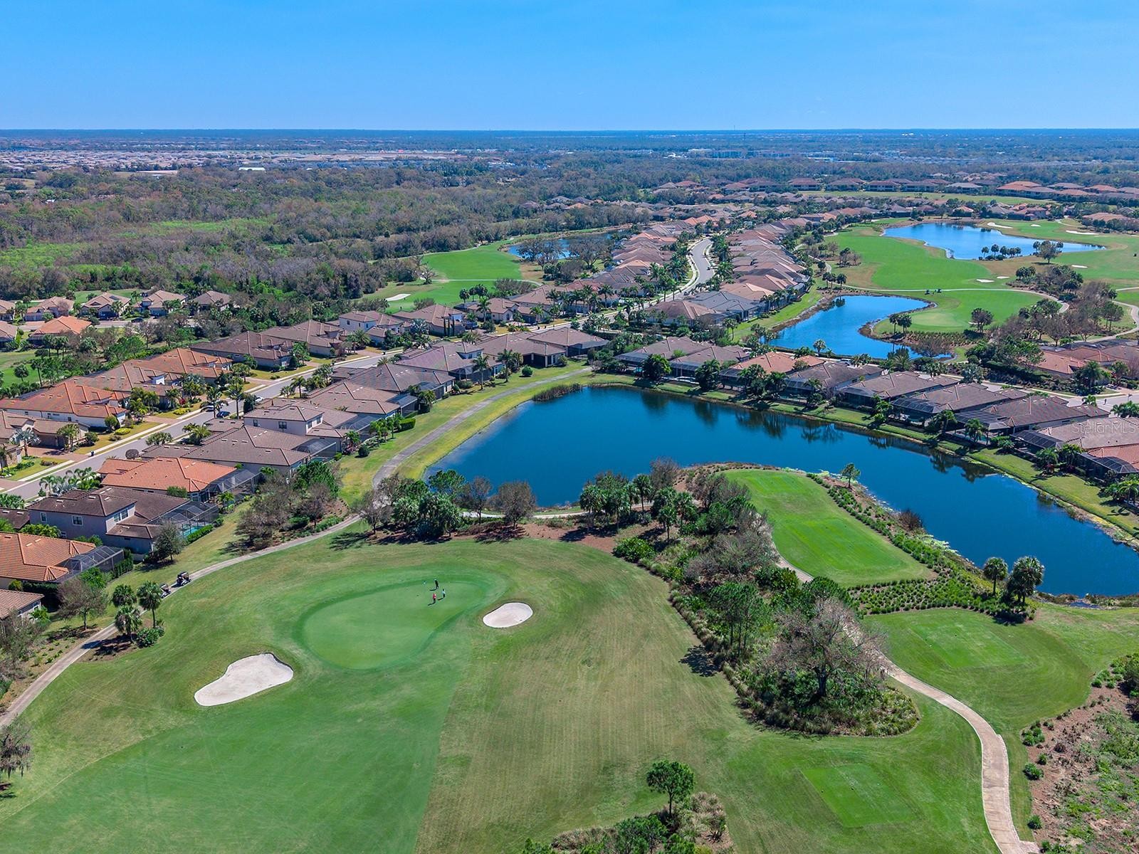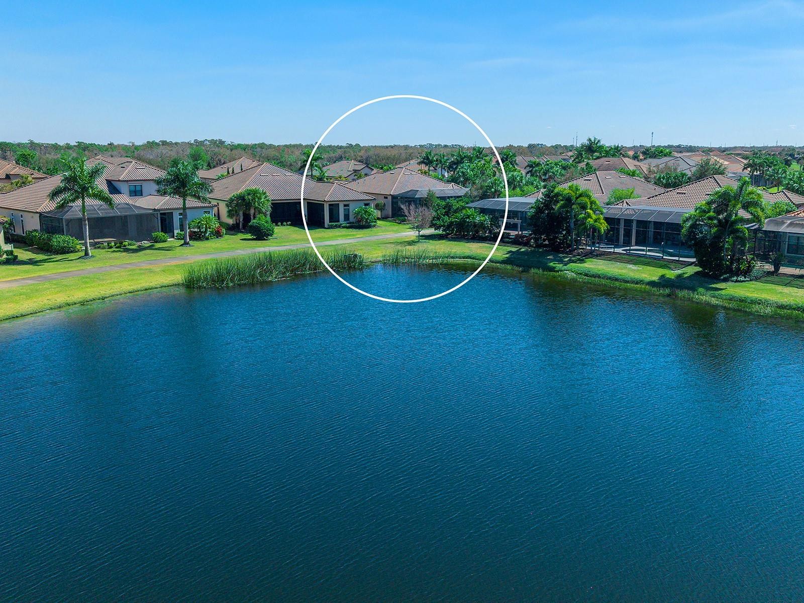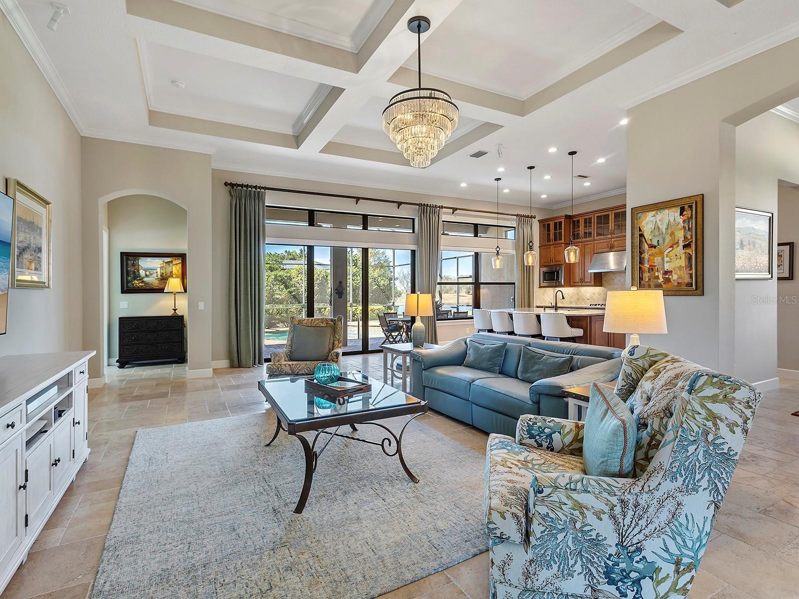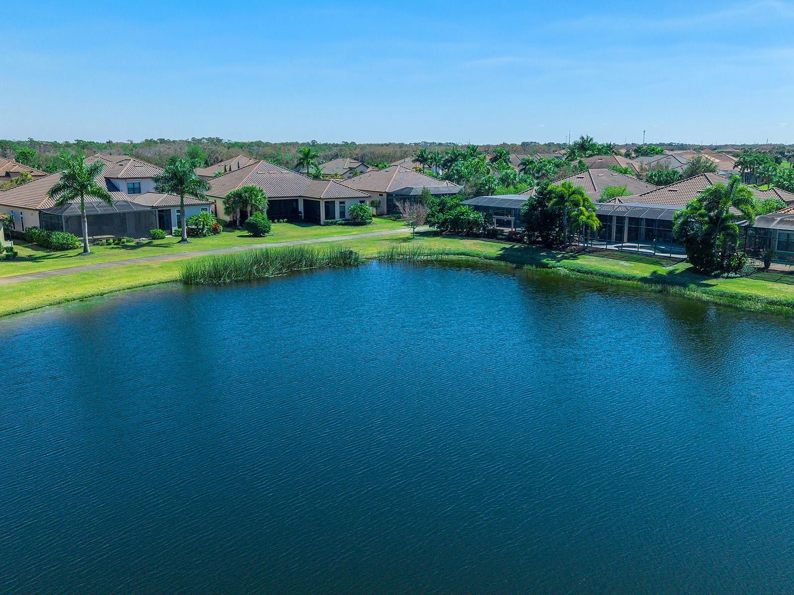 Positioned to capture tranquil lake views with the 18th fairway unfolding beyond, this golf-deeded residence reflects a thoughtful balance of refined detail and everyday livability. The Luca floorplan features 3 bedrooms, with the flexibility of a potential 4th bedroom, and is complemented by 3 full bathrooms and a half bathroom. The home’s presence is defined by a tile roof, coach lights, manicured landscaping, a covered entry porch with columns, and an expansive side yard with no neighboring home to the left, which contribute to the home’s functionality and comfort. Inside, high ceilings, many featuring custom trim and crown molding, highlight the home’s craftsmanship, while travertine flooring extends throughout the main living areas. The foyer makes a welcoming first impression with double front doors inlaid with decorative glass. The great room is filled with natural light, enhanced by transom windows and a full wall of sliding glass doors with remote-controlled blinds. The open layout provides ample space for both everyday living and comfortable entertaining. The kitchen strikes a balance between design and function, centered around a large floating island with pendant lighting and integrated cabinetry. Extensive perimeter cabinetry adds both storage and visual interest, with glass-faced doors accenting the top tier. Tumbled stone backsplash, granite countertops. bronze hardware, a walk-in pantry with wood shelving, and stainless-steel appliances, including double wall ovens, a five-burner gas cooktop, dishwasher, microwave/air fryer, and a wine cooler, reinforce the space’s practicality and organization. The dining area is framed by a picture window with a transom above and designer lighting, creating an ideal setting for gatherings. The dedicated office or flex room features crown molding, double-door entry, built-in workspace and storage, and a closet that allows for easy conversion to a 4th bedroom. Outdoor living extends to a paver lanai with a covered area designed for both living and dining, extending to a heated pool and open living space, all surrounded by lush privacy landscaping. The lanai has plumbing in place for an outdoor kitchen. The generous primary suite boasts numerous windows, a spacious seating area, and an oversized walk-in closet. The primary bath is impressive with an oversized walk-in shower with a bench, grab bar, and tile extending to the ceiling with 3 integrated windows, complete with an expansive vanity with two sinks, a makeup area, and generous storage. Two guest suites offer privacy and comfort, each with high ceilings, numerous windows, and en-suite baths featuring vanities with granite countertops and tile flooring, one with an oversized walk-in shower, the other with a tub/shower combo. A well-appointed laundry room with built-in cabinetry and a utility sink is conveniently located near the three-car side-load garage, which features epoxy floors and ceiling-mounted storage. The home is also equipped with impact-rated glass and a tankless water heater. Set within Esplanade Golf and Country Club, residents have access to a beach-entry resort pool and spa, Bahama Bar poolside dining, fitness and exercise facilities, tennis and pickleball courts, championship golf, a Day Spa, and The Barrel House Restaurant and Bar. The location is a short drive to UTC, Main Street, Waterside, Sarasota Polo Club, MOTE Aquarium, and great schools, reinforcing both lifestyle appeal and day-to-day practicality.