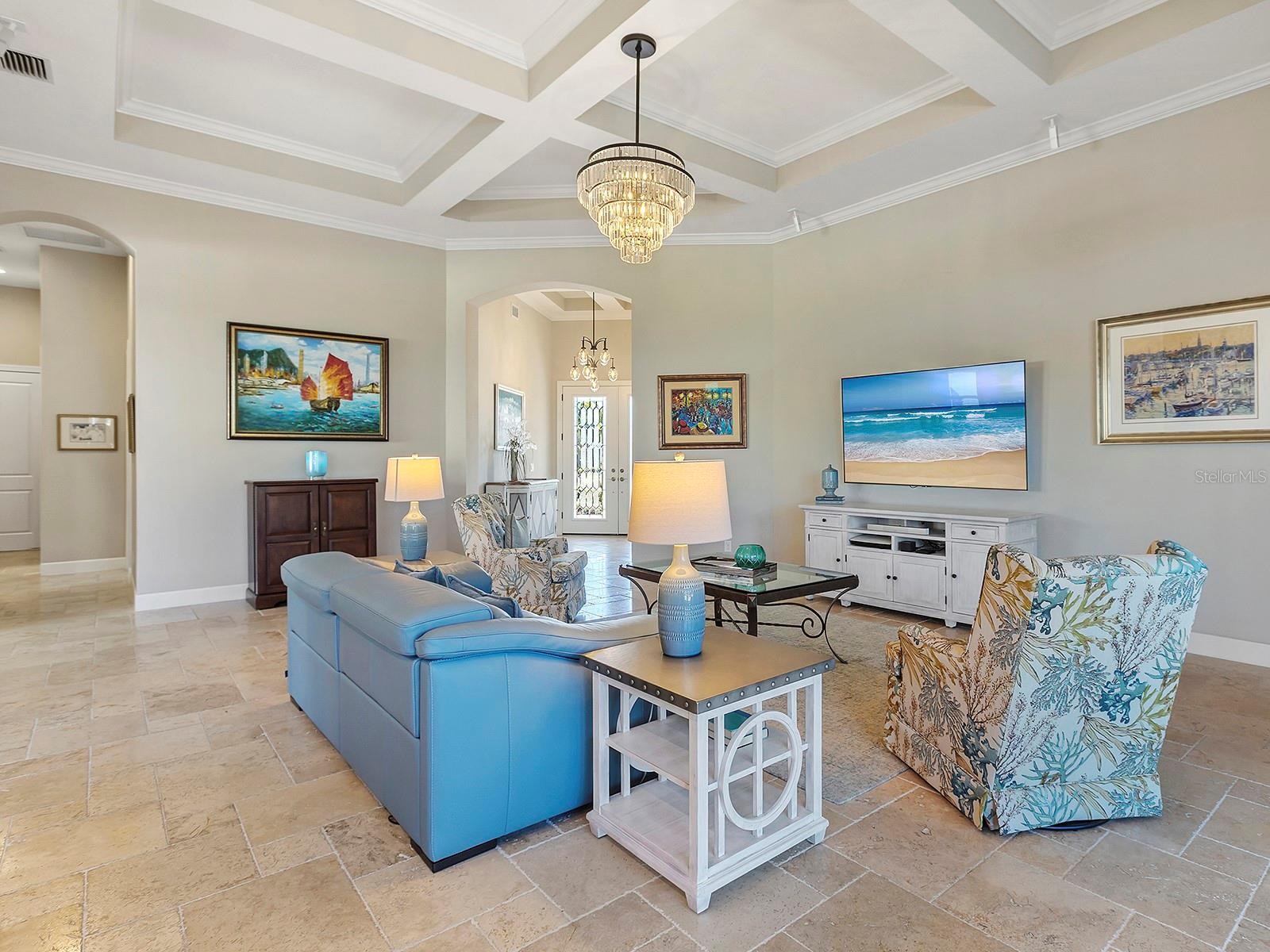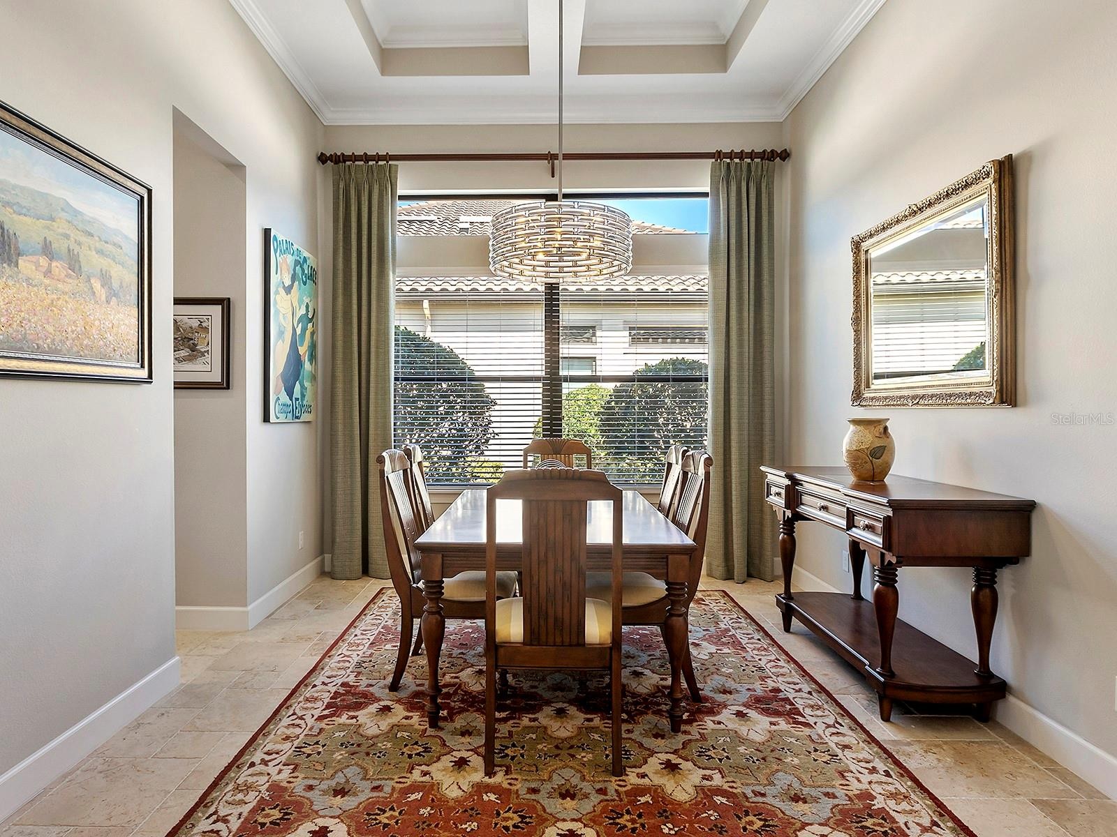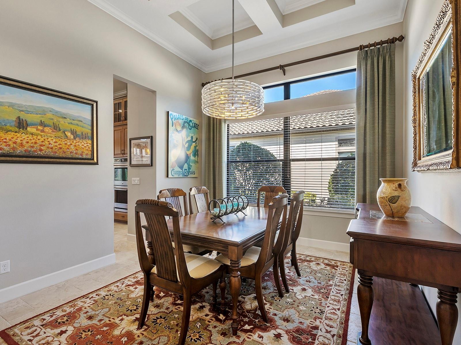 Positioned to capture tranquil lake views with the 18th fairway unfolding beyond, this golf-deeded residence reflects a thoughtful balance of refined detail and everyday livability. The Luca floorplan features 3 bedrooms, with the flexibility of a potential 4th bedroom, and is complemented by 3 full bathrooms and a half bathroom. The home’s presence is defined by a tile roof, coach lights, manicured landscaping, a covered entry porch with columns, and an expansive side yard with no neighboring home to the left, which contribute to the home’s functionality and comfort. Inside, high ceilings, many featuring custom trim and crown molding, highlight the home’s craftsmanship, while travertine flooring extends throughout the main living areas. The foyer makes a welcoming first impression with double front doors inlaid with decorative glass. The great room is filled with natural light, enhanced by transom windows and a full wall of sliding glass doors with remote-controlled blinds. The open layout provides ample space for both everyday living and comfortable entertaining. The kitchen strikes a balance between design and function, centered around a large floating island with pendant lighting and integrated cabinetry. Extensive perimeter cabinetry adds both storage and visual interest, with glass-faced doors accenting the top tier. Tumbled stone backsplash, granite countertops. bronze hardware, a walk-in pantry with wood shelving, and stainless-steel appliances, including double wall ovens, a five-burner gas cooktop, dishwasher, microwave/air fryer, and a wine cooler, reinforce the space’s practicality and organization. The dining area is framed by a picture window with a transom above and designer lighting, creating an ideal setting for gatherings. The dedicated office or flex room features crown molding, double-door entry, built-in workspace and storage, and a closet that allows for easy conversion to a 4th bedroom. Outdoor living extends to a paver lanai with a covered area designed for both living and dining, extending to a heated pool and open living space, all surrounded by lush privacy landscaping. The lanai has plumbing in place for an outdoor kitchen. The generous primary suite boasts numerous windows, a spacious seating area, and an oversized walk-in closet. The primary bath is impressive with an oversized walk-in shower with a bench, grab bar, and tile extending to the ceiling with 3 integrated windows, complete with an expansive vanity with two sinks, a makeup area, and generous storage. Two guest suites offer privacy and comfort, each with high ceilings, numerous windows, and en-suite baths featuring vanities with granite countertops and tile flooring, one with an oversized walk-in shower, the other with a tub/shower combo. A well-appointed laundry room with built-in cabinetry and a utility sink is conveniently located near the three-car side-load garage, which features epoxy floors and ceiling-mounted storage. The home is also equipped with impact-rated glass and a tankless water heater. Set within Esplanade Golf and Country Club, residents have access to a beach-entry resort pool and spa, Bahama Bar poolside dining, fitness and exercise facilities, tennis and pickleball courts, championship golf, a Day Spa, and The Barrel House Restaurant and Bar. The location is a short drive to UTC, Main Street, Waterside, Sarasota Polo Club, MOTE Aquarium, and great schools, reinforcing both lifestyle appeal and day-to-day practicality.