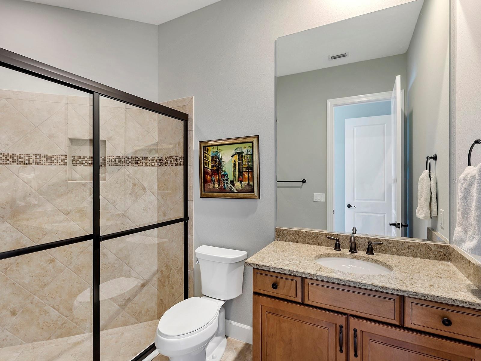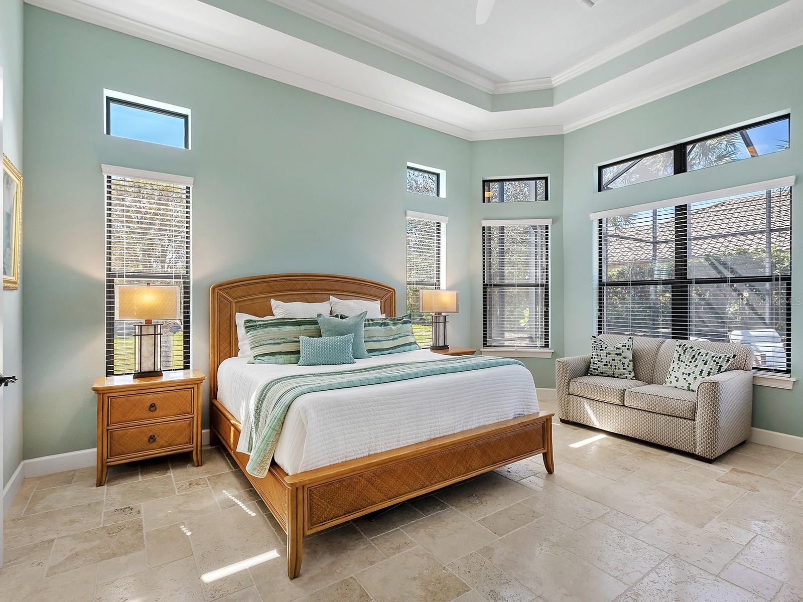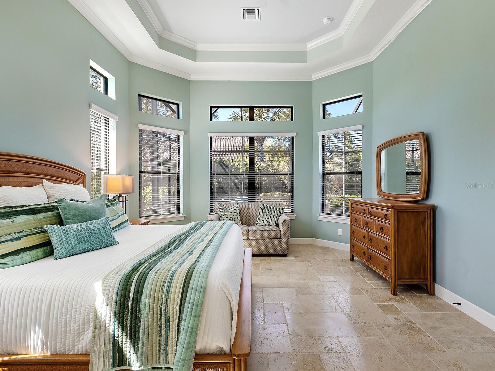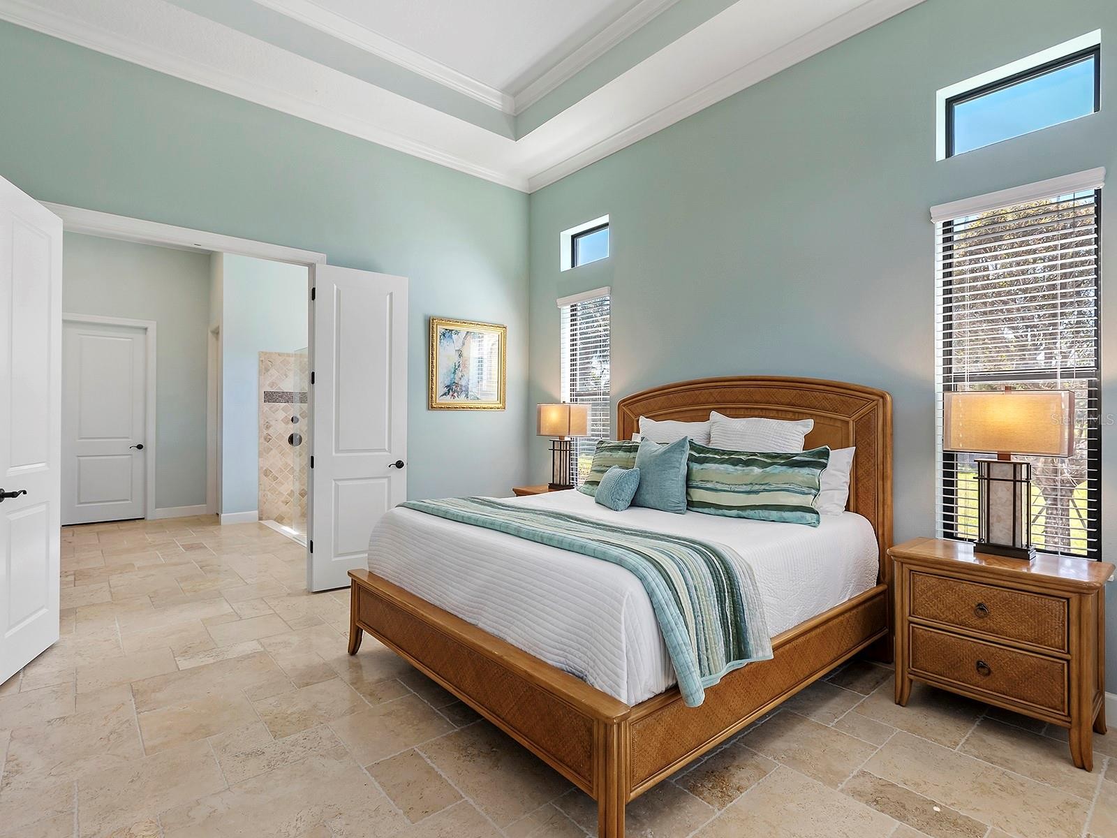 Positioned to capture tranquil lake views with the 18th fairway unfolding beyond, this golf-deeded residence reflects a thoughtful balance of refined detail and everyday livability. The Luca floorplan features 3 bedrooms, with the flexibility of a potential 4th bedroom, and is complemented by 3 full bathrooms and a half bathroom. The home’s presence is defined by a tile roof, coach lights, manicured landscaping, a covered entry porch with columns, and an expansive side yard with no neighboring home to the left, which contribute to the home’s functionality and comfort. Inside, high ceilings, many featuring custom trim and crown molding, highlight the home’s craftsmanship, while travertine flooring extends throughout the main living areas. The foyer makes a welcoming first impression with double front doors inlaid with decorative glass. The great room is filled with natural light, enhanced by transom windows and a full wall of sliding glass doors with remote-controlled blinds. The open layout provides ample space for both everyday living and comfortable entertaining. The kitchen strikes a balance between design and function, centered around a large floating island with pendant lighting and integrated cabinetry. Extensive perimeter cabinetry adds both storage and visual interest, with glass-faced doors accenting the top tier. Tumbled stone backsplash, granite countertops. bronze hardware, a walk-in pantry with wood shelving, and stainless-steel appliances, including double wall ovens, a five-burner gas cooktop, dishwasher, microwave/air fryer, and a wine cooler, reinforce the space’s practicality and organization. The dining area is framed by a picture window with a transom above and designer lighting, creating an ideal setting for gatherings. The dedicated office or flex room features crown molding, double-door entry, built-in workspace and storage, and a closet that allows for easy conversion to a 4th bedroom. Outdoor living extends to a paver lanai with a covered area designed for both living and dining, extending to a heated pool and open living space, all surrounded by lush privacy landscaping. The lanai has plumbing in place for an outdoor kitchen. The generous primary suite boasts numerous windows, a spacious seating area, and an oversized walk-in closet. The primary bath is impressive with an oversized walk-in shower with a bench, grab bar, and tile extending to the ceiling with 3 integrated windows, complete with an expansive vanity with two sinks, a makeup area, and generous storage. Two guest suites offer privacy and comfort, each with high ceilings, numerous windows, and en-suite baths featuring vanities with granite countertops and tile flooring, one with an oversized walk-in shower, the other with a tub/shower combo. A well-appointed laundry room with built-in cabinetry and a utility sink is conveniently located near the three-car side-load garage, which features epoxy floors and ceiling-mounted storage. The home is also equipped with impact-rated glass and a tankless water heater. Set within Esplanade Golf and Country Club, residents have access to a beach-entry resort pool and spa, Bahama Bar poolside dining, fitness and exercise facilities, tennis and pickleball courts, championship golf, a Day Spa, and The Barrel House Restaurant and Bar. The location is a short drive to UTC, Main Street, Waterside, Sarasota Polo Club, MOTE Aquarium, and great schools, reinforcing both lifestyle appeal and day-to-day practicality.