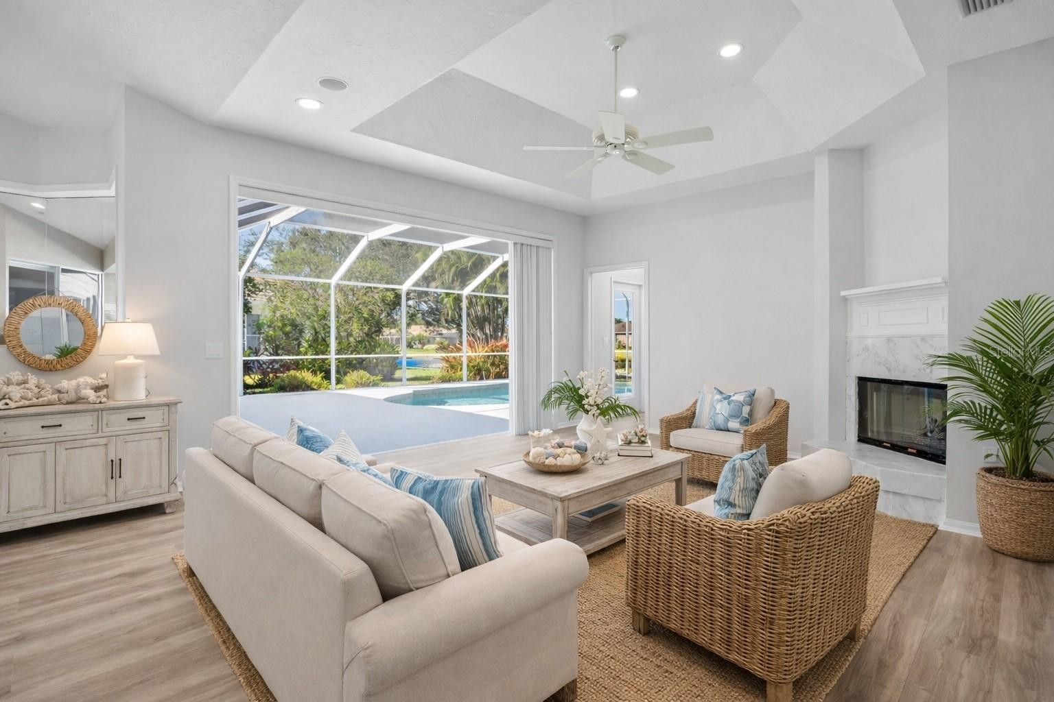 One or more photo(s) has been virtually staged. The definition of “move-in ready” has just been elevated with this beautifully updated and elegant Todd Johntson–built WATERFRONT home, ideally located behind the gates of the highly desirable Turtle Rock community in Palmer Ranch, known for its miles of scenic walking and biking trails. Offering just under 2,600 square feet of comfortable living space, this exceptional residence features 4 bedrooms and 3 bathrooms, with the fourth bedroom perfectly suited as an office or flexible living space. Extensively refreshed and meticulously maintained, this home is truly ready for its next fortunate owners. Recent upgrades include a complete interior and exterior repaint in today’s modern color palette, luxury vinyl flooring throughout, and a FULLY RENOVATED KITCHEN showcasing brand-new shaker-style cabinetry, quartz countertops with a matching backsplash, and a farmhouse sink with an elegant faucet. The kitchen is further enhanced by stainless steel appliances, including a natural gas range (Turtle Rock is a natural gas community), dishwasher, microwave, a side-by-side refrigerator with drawer, and an additional refrigerator in the laundry room for added convenience. The house has been completely repipped for peace of mind. Both the primary and guest bathrooms have also been tastefully updated. Additional improvements include a freshly painted garage and a newly finished garage floor. Other notable features are a roof replaced in 2015, an energy-efficient air-conditioning system for economical climate control, and an oversized primary suite with custom built-ins in the spacious walk-in closet. High ceilings, spacious rooms, multiple sliding glass doors, and an aquarium window in the kitchen nook fill the home with abundant natural light while highlighting the beautiful surrounding scenery., LED lighting throughout for more of the updated look and aditional energy savings. The open and airy kitchen sits at the heart of the home and flows seamlessly to the covered lanai and expansive, fully screened outdoor living area. A generously sized pool and tranquil lake views provide the perfect backdrop for family gatherings and year-round entertaining. Residents of Turtle Rock enjoy an optional active social calendar, a community center, heated pool, and tennis courts basket and pickleball courts . Ideally located just minutes from shopping, dining, world-class entertainment, the Legacy Trail, and the world-famous Siesta Key Beach. Schedule your private showing today—this exceptional home will not last.