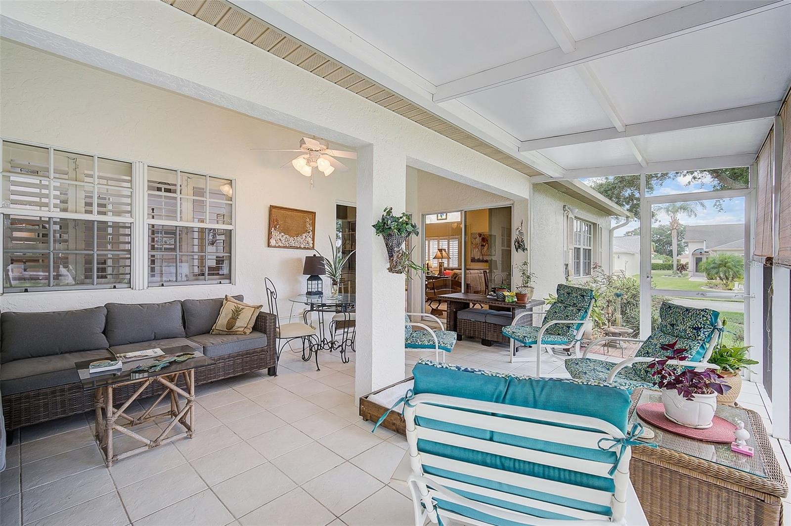 Stylish, low-maintenance living awaits in this beautifully maintained 1,756 sq. ft. Patio Home featuring 2 bedrooms, 2 bathrooms, and a flexible den—perfect for a home office, guest room, or creative space. Situated on a desirable corner lot, the home greets you with a stylish glass entry door and opens into a bright, inviting interior with high ceilings, plantation shutters, and abundant natural light. The updated kitchen features granite countertops, tall cabinetry, track lighting, and a spacious pantry, flowing seamlessly into the open living and dining areas—ideal for both everyday living and entertaining. The primary suite includes a walk-in closet and en-suite bath with dual sinks and a large walk-in shower. Step outside to enjoy peaceful mornings or relaxing evenings on the oversized screened lanai. New roof 2022 and new A/C 2020. Residents of Peridia Golf & Country Club enjoy a vibrant lifestyle with access to an 18-hole executive golf course, tennis and pickleball courts, on-site dining, live music, social events, and more. Conveniently located near shopping, restaurants, Gulf beaches, and SRQ airport. Fees: One-time capital reserve of $4,000, quarterly yard maintenance $329, quarterly master association $877, annual food & beverage minimum $450, and a one-time application fee of $200.