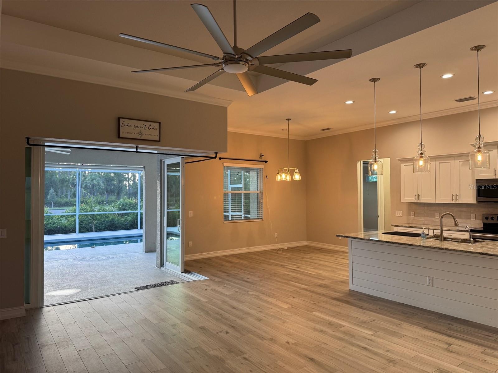 Looking for Privacy, are you a RV Owner, have trailer(s) with easy access to the I-75 Interstate Highway, then this home and property is for you! Come enjoy the endless sunsets from your lanai with no homes behind you with 1940 sq/ft, 3 Bed, 2 bath, salt pool home situated on THREE 82.9' x125' LOTS with buffers of trees on both ends and yet there is still more room for parking a Class A RV on a crushed gravel driveway w/concrete apron, with a 30 amp outlet and water faucet nearby, boats, toy trailers, sheds, you name it...NO HOA! This home also has No Carpet! Porcelain Tile Floors throughout, Crown molding and high ceilings in the living, dining and kitchen and primary bedroom. Ceiling fans in Living, bedrooms, and office/den controlled by remotes, with lights and dimmers. Other dimmers control bathrooms, dining table and kitchen as well. You will find Tray Ceilings located in the living area and Primary Bedroom. Zero corner glass sliders in the living area opens up to the lanai (pre-plumbed for an outdoor kitchen) and 10x20 pool that features a Badu Water Jet, for walking and swimming resistance. All windows have white, faux wood blinds, except for the transom windows. Yard is kept in shape with a well irrigation system using a 5-zone Rainbird controller. EXTRA FEATURES include SOLAR PANELS, XFINITY Alarm System, Gutters with LeafFilters installed to keep them clean and flowing. Indoor Laundry Room has a sink with plenty of above and below storage. What are you waiting for? Come see this house and see what it offers you! *Over $128,645 in improvements have been made (see attachments)