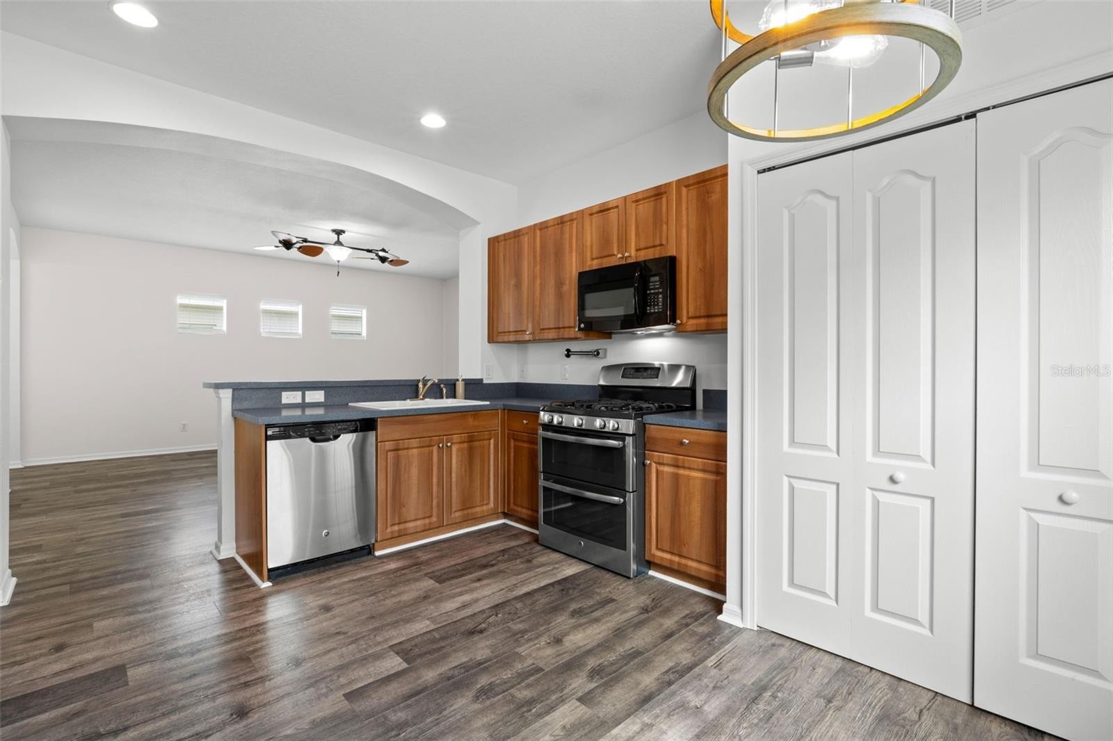 One or more photo(s) has been virtually staged. Located in desirable Central Park at Lakewood Ranch, this thoughtfully designed 2-bedroom + office home offers a bright, open-concept layout ideal for everyday living and entertaining. The split-bedroom floor plan provides privacy, while the dedicated office with French doors creates the perfect work-from-home space. The kitchen is well-appointed with stainless steel appliances, a gas range, breakfast bar, pantry, decorative lighting, and convenient washer and dryer closet. Natural light flows throughout the home highlighting the luxury vinyl flooring in the main living areas and arched architectural details. The spacious primary suite features a walk-in closet, stand-up shower and separate water closet. Additional interior features include ceiling fans, recessed kitchen lighting, ample storage, and a whole-house water filtration system. Outside you’ll find an oversized screened lanai designed for Florida living, complete with a BBQ grill and dedicated gas line perfect for hosting gatherings. The landscaped yard is enhanced with irrigation, gutters, and mature Areca palms for added privacy. Additional highlights include hurricane shutters, a two-car garage, and close proximity to community amenities including parks, playgrounds, and tennis courts. Enjoy the best of Lakewood Ranch living in this move-in ready home with comfort, functionality, and style.