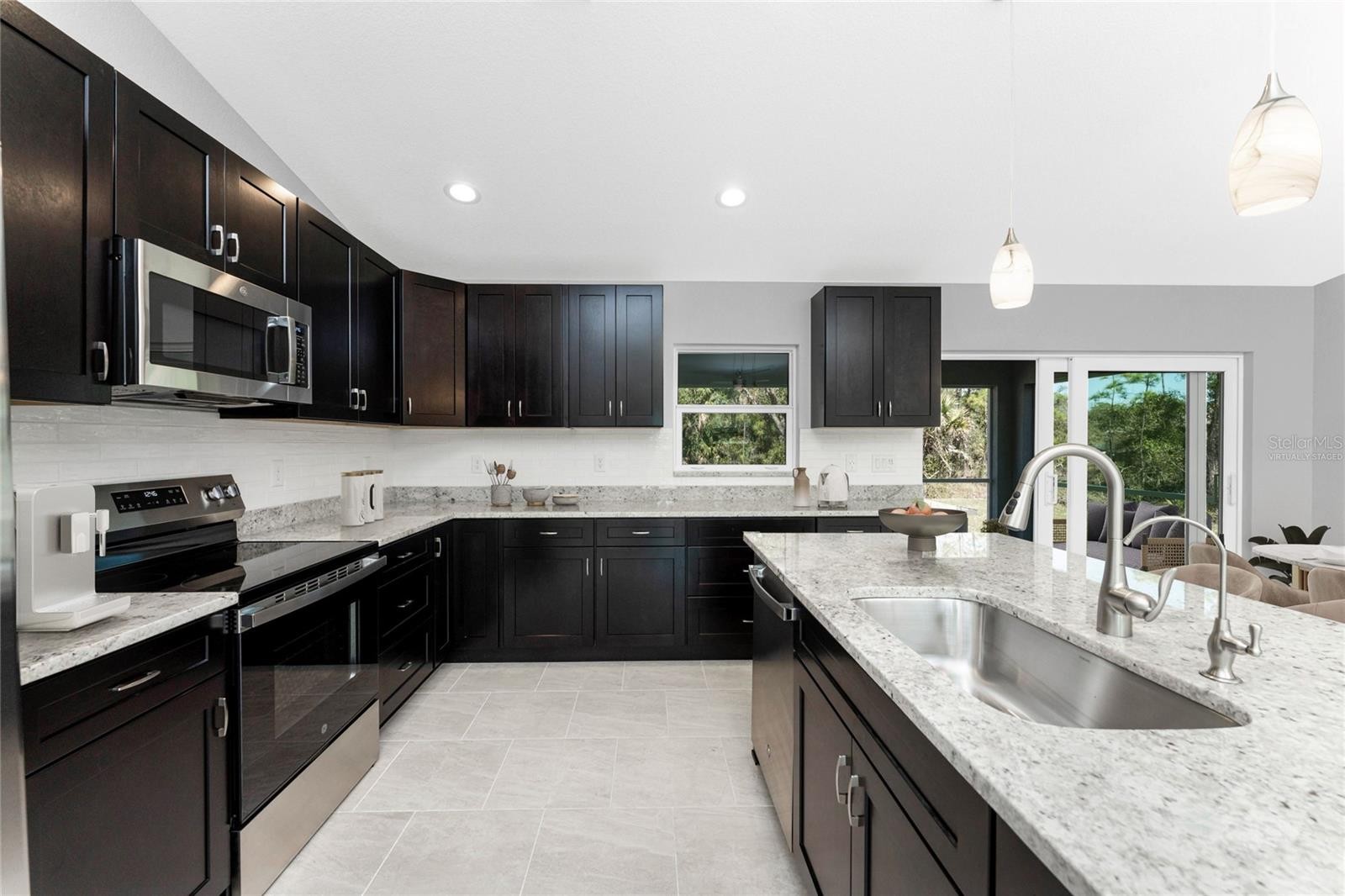One or more photo(s) has been virtually staged. Beautiful New Construction Home Available Now! Everything is Included and Everything is Upgraded! Starting with an open, split floor plan with vaulted ceilings, this home has Hurricane Impact, insulated, low e windows, full overlay cabinets, stainless steel kitchen appliances, quality stone countertops and window sills, porcelain tile throughout, 30-year shingles, 3 zone sprinkler system, screened lanai, brand name plumbing and electrical fixtures, fully sodded and landscaped. This home has been built to keep insurance, maintenance and utility costs low. Preferred lender is offering up to $1,500 in closing cost assistance! Take a tour through one of our Beautiful Homes: https://youtu.be/SFsL-Aell24