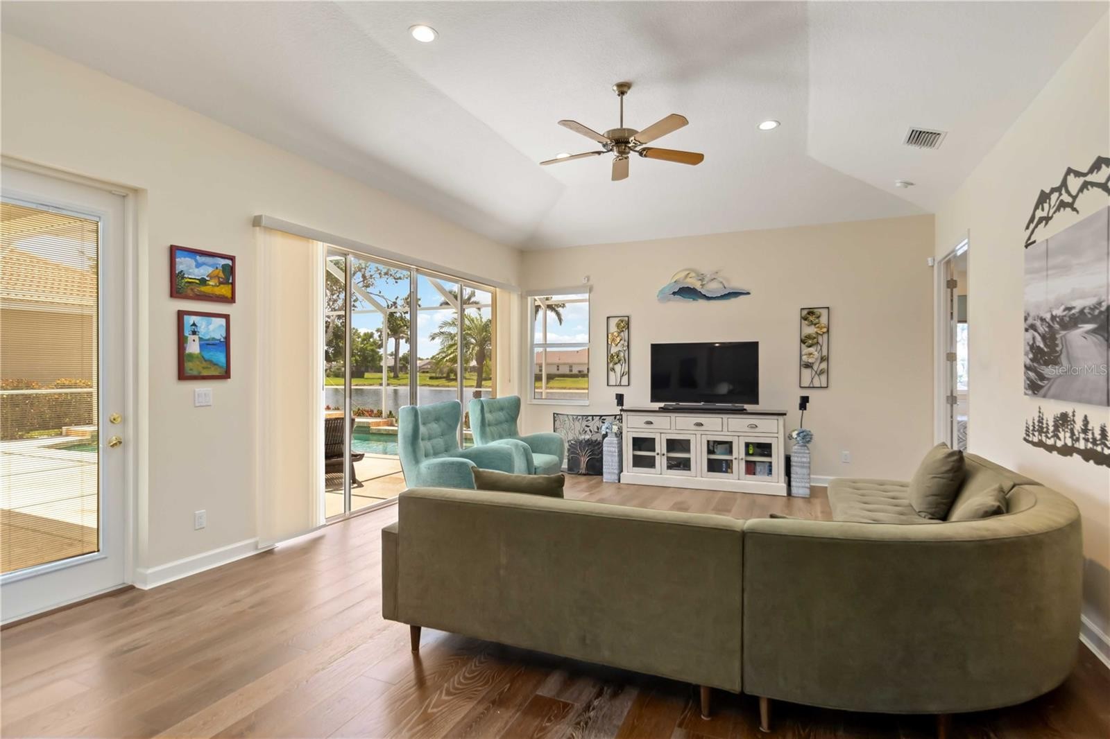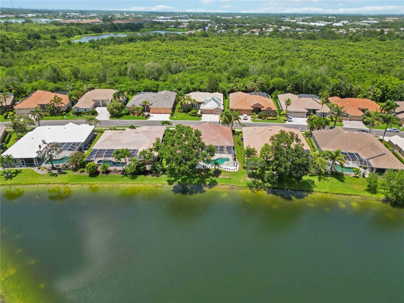 New 2025 tile roof with 25-year transferable warranty. Discover West Hampton on Palmer Ranch, a quiet and gated enclave surrounded by nature. Minutes to Siesta Key beach, top schools, and all the services an active household would need. This south-facing, 3022 sq. ft. home has a panoramic lake view framed by majestic royal palms across its lake. Model condition, move-in ready, and meticulously maintained. Split plan 4 bedrooms, den, 3 baths, heated pool, and must-have 3-car garage. French wire brushed professionally installed, glued down wide plank floors in all the active living areas. The primary suite occupies one side of the home for privacy with front-entry den. The primary suite has a spa-like updated bath, mosaic marble floor, Italian porcelain tile walls, a walk-in shower, large separate tub, twin vanities, and dressing table. The owner’s suite has two custom fitted closets with a luggage shelf. Double 8’ door entry opens to the formal dining and living room with lanai, pool, and lake views. Your island show kitchen has a café dining space with an aquarium glass window view of the lanai, pool, and lake. The kitchen combines casual family room—all under a high vaulted ceiling—with a full view of the lanai and pool. The kitchen has a convenient correspondence/tech center built-in desk matching the kitchen cabinets. Kitchen cabinets are fine raised panel wood cabinets; upper cabinets are 42” and fitted with under-cabinet lighting. Your kitchen has a generous amount of 3cm rich granite countertops with an undermount Blanco Silgranite 30/70 sink. The kitchen has a 2024 Bosch Convection microwave-oven combo. The KitchenAid cooktop is electric but has a natural gas hook-up should you wish to change. The Zephyr hood vents out of the house. The flexible fourth bedroom is 14.5’ x 19’use as a second main bedroom or bonus room/guest suit and is en suite to 3rd bath with door to lanai. You will love its large picture window lake view framed by majestic Royal Palms. Guest bedrooms 2 & 3 are ample in size, and bedroom 2 has a large walk-in closet. A 9’ x 6’ laundry room with utility sink, closet, and upper cabinets. Added features: kitchen tankless RO water filter 2022; new whole house salt-free water filter 2022 maintained annually, new pool heat pump 2023. Two 2016 a/c units keep the home cool and easily balanced: hot water tank replaced in 2023. The 20’ x 30’ garage has a high ceiling and attic pull-down stairs for some storage. Palmer Ranch is an expertly engineered 10,000-acre planned unit development, minutes to Siesta Key beach, unhurried parkways, excellent schools, new public library, shopping, restaurants, state of the art fitness center, parks, and 18.5-mile expanding Legacy bike trail.