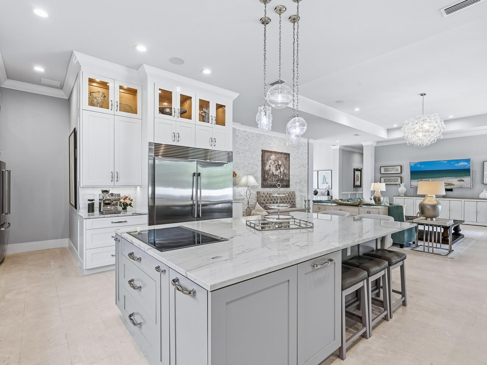 This stunning coastal-designed residence is perfectly situated just 0.5 miles from the exclusive Nokomis Beach, nestled in a small, gated enclave of only seven homes. The property offers a quintessential nautical lifestyle, complete with a 30-foot dock that provides direct access to the Intracoastal Waterway and the Gulf, perfect for those who enjoy fishing or simply soaking in the serene surroundings. Built in 2020, this custom residence is a masterpiece of modern design, featuring a spacious open floor plan centered around a great room that seamlessly integrates with an exceptionally designed kitchen. The kitchen is a chef's dream, boasting abundant cabinetry with deep drawers, striking hardware, and a massive island topped with luxurious quartzite slabs. This home includes 3 bedrooms and 3 baths, along with a versatile bonus/media room, providing ample space for family and guests. The owner’s retreat is particularly impressive, featuring its own dedicated laundry area, designer closets, and a luxurious spa-like bathroom. Natural light floods the interior through state-of-the-art, luxury PGT storm-rated windows and doors, complemented by transom details. The entrance is grand, featuring a remarkable 10-foot pivot front door that enhances the home's curb appeal. Every detail has been meticulously crafted, including a custom wet bar for entertaining. The exquisite shellstone flooring flows throughout the residence, adding a touch of elegance. Outdoor living is a highlight, with pocketing sliders that open to an expansive deck and pool/spa area, offering over 1,000 square feet of covered lanai space, complete with a built-in outdoor grill and sink—perfect for alfresco dining and entertaining. Additional features include a 3-car tandem garage with a separate side entrance for golf carts. This exquisite home truly embodies the essence of Florida living, inviting you to explore and enjoy all that this beautiful coastal community has to offer. Minutes to culturally rich downtown Sarasota and charming Venice, top-rated schools, dining and shopping.
