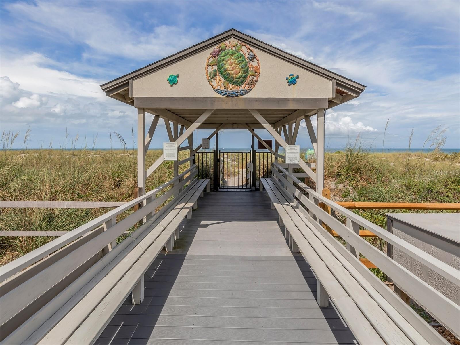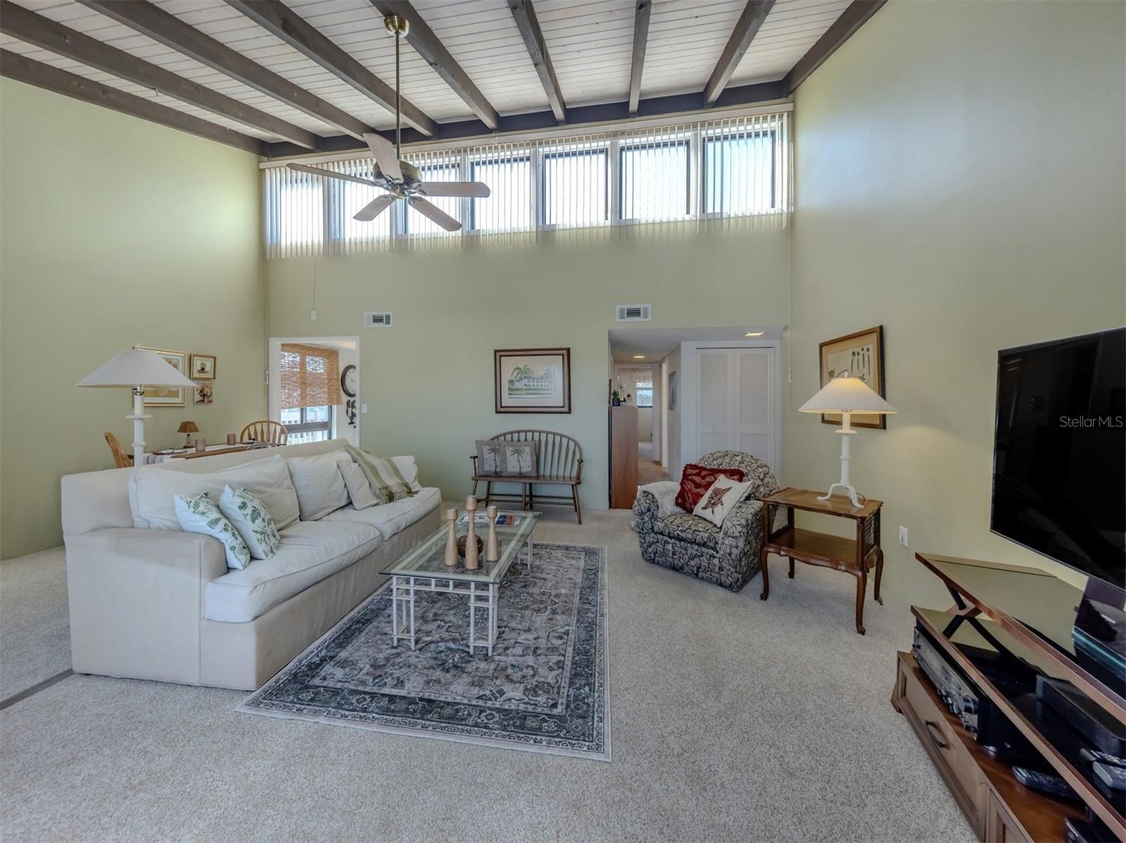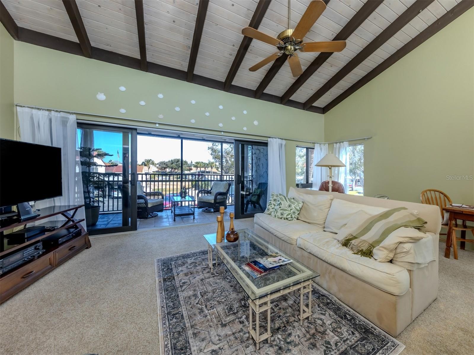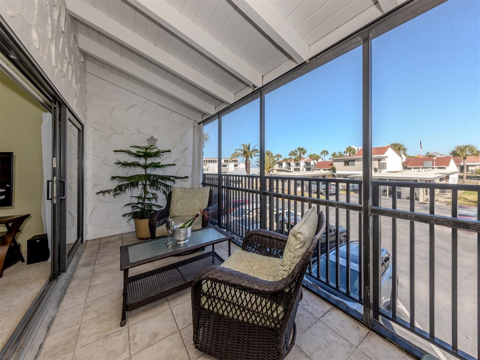 Welcome to the best of coastal living in this well-named condo community, Aldea Mar, The Village by the Sea. This charming 2-bed, 2-bath retreat offers over 1200 square feet of living space, all of which sustained no damage from the hurricanes. This second-floor unit is sunny and spacious with vaulted wood beam ceilings, transom windows and a wall of sliding glass doors and windows that exude a sense of spaciousness and character. The combined living and dining area opens to an oversized screened lanai with a partial view of the Gulf. Just the place to relax after a day at the beach, which is steps away. The primary bedroom features two spacious closets, an en-suite bath with updated vanity and granite countertop, brand new carpet and a separate owner’s closet. The guest room has ample space to sleep two comfortably, new carpet, and a bathroom with a walk-in shower. This condo has excellent rental potential with minimum lease periods of one month. Aldea Mar is the largest Gulf front complex located on the Island of Venice with eleven acres of pristine Gulf front and amenities galore. Enjoy a large, heated swimming pool, putting green, shuffleboard and a community clubhouse. The complex is just 1 mile from the vibrant downtown Venice Island with its gourmet restaurants, art shops, and boutiques. Whether you're seeking a permanent residence or a vacation getaway, this home offers the perfect blend of comfort and tranquility. Don't miss out on the opportunity to experience the laid-back coastal lifestyle that Aldea Mar has to offer. Schedule a showing today and discover why this community and its residents provide an ambiance that lifts the spirits.