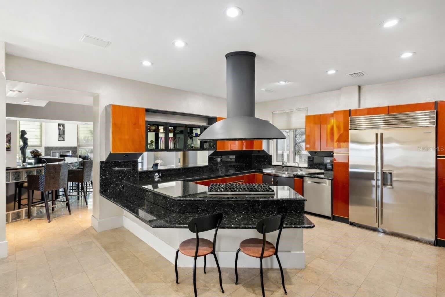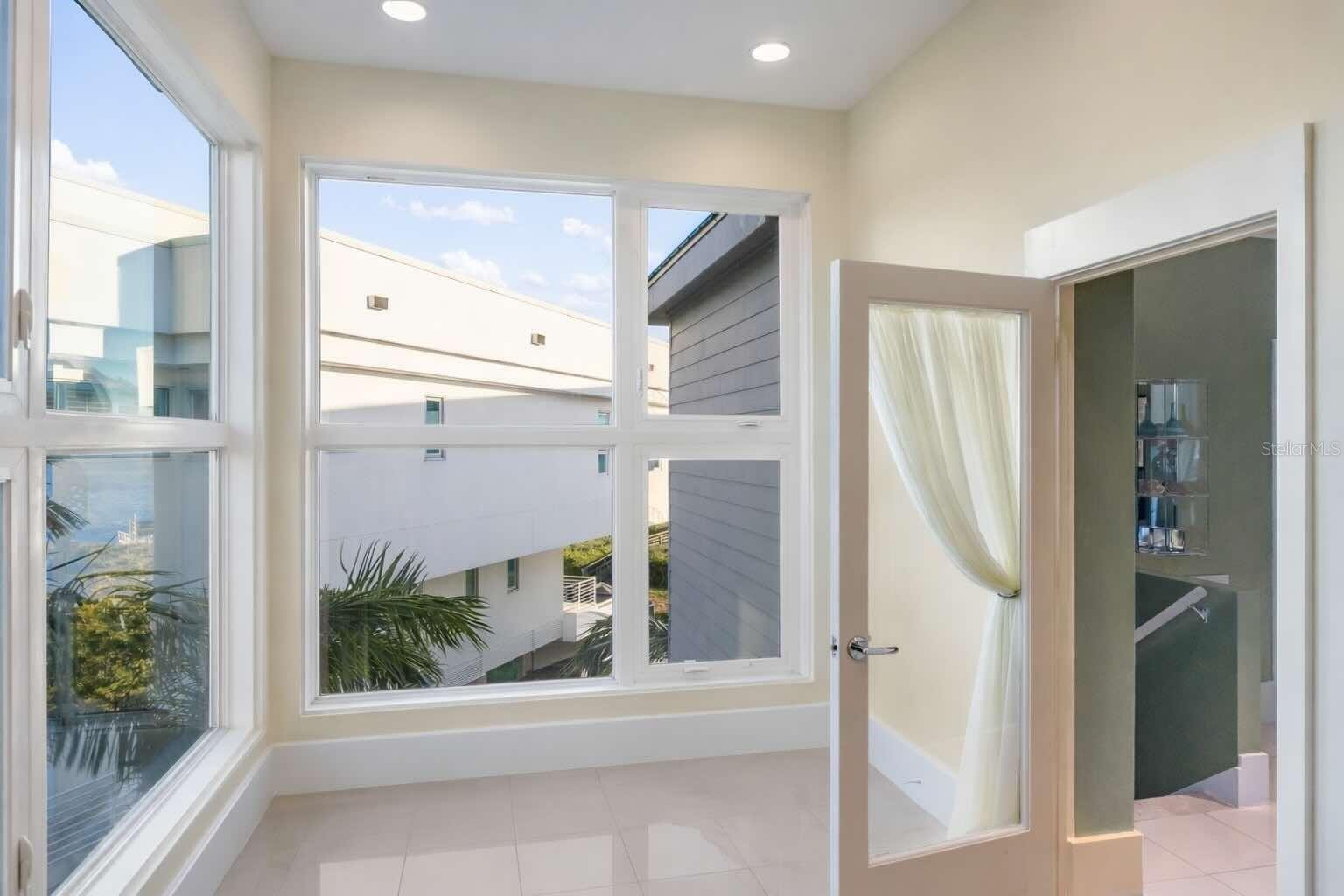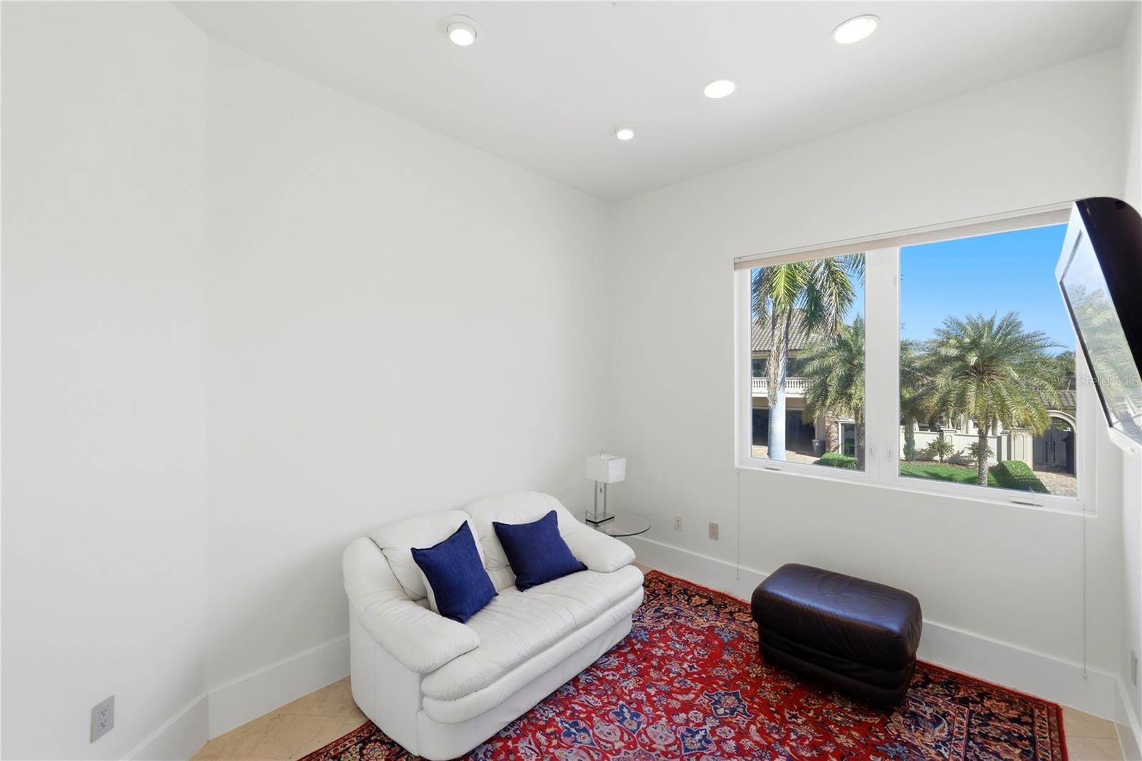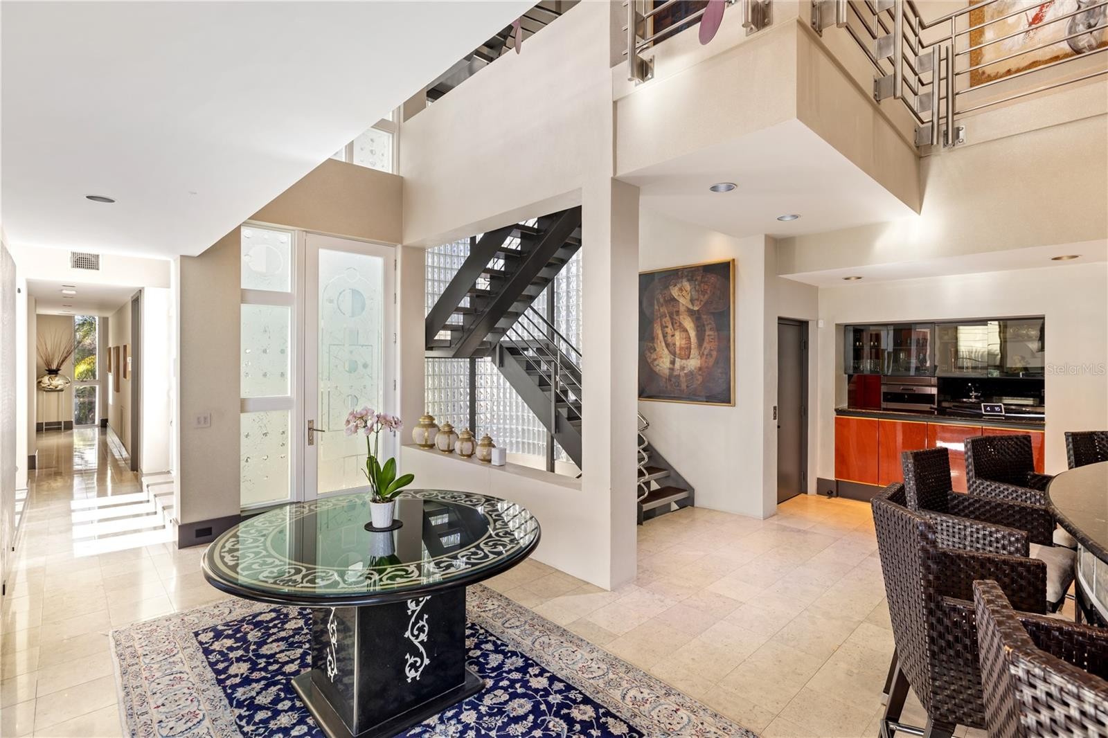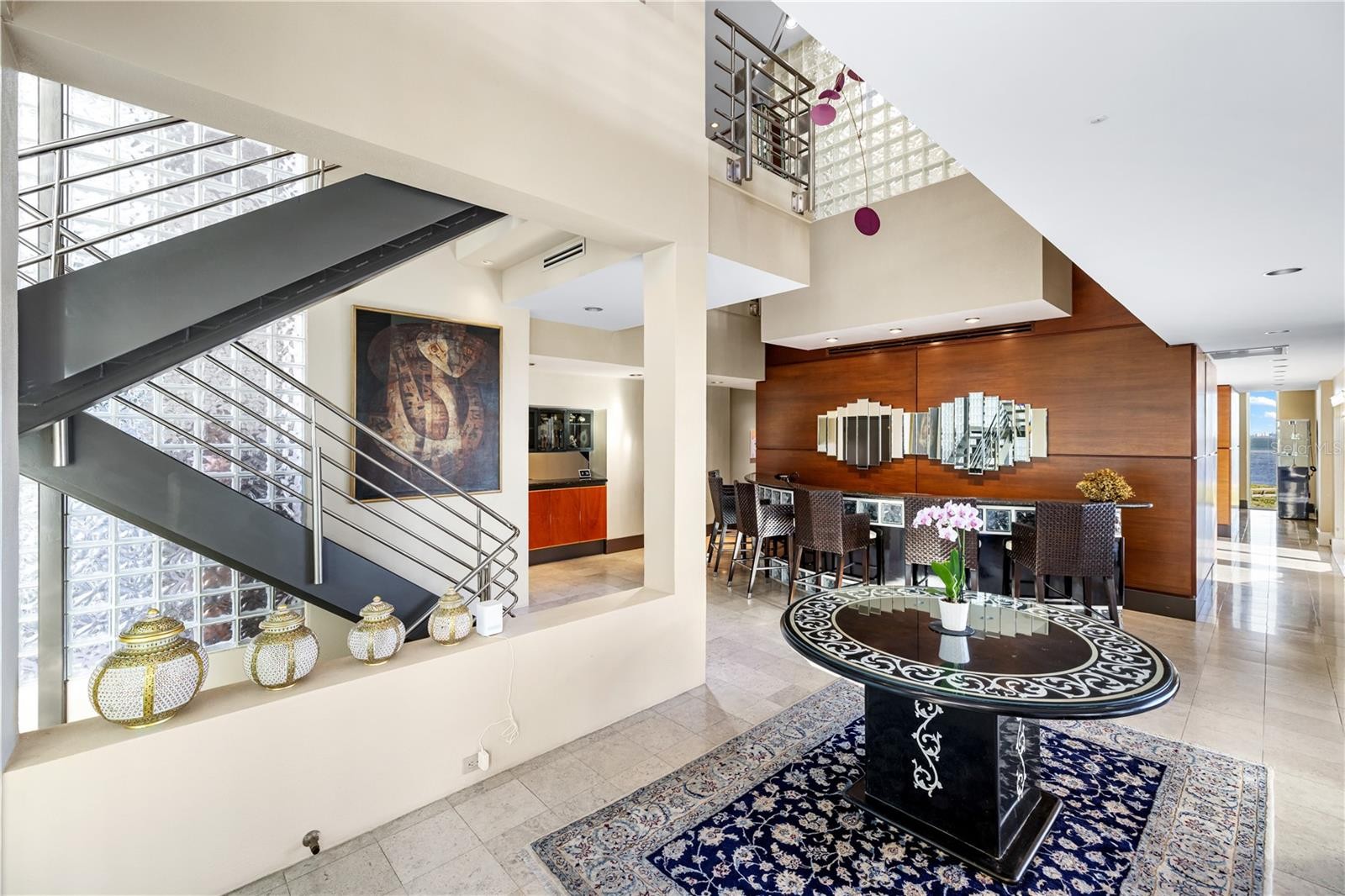 One or more photo(s) has been virtually staged. A truly one-of-a-kind Sarasota Bay waterfront estate set within the private gated enclave of Esplanade on the Bay, offering rare scale, architectural distinction, and 100 feet of direct Sarasota Bay frontage. Encompassing 7,862 square feet under air and 12,088 total square feet, the residence showcases a striking architectural presence shaped by its waterfront setting. Originally featured in a regional architectural publication for its innovative “Tri-Plexity” concept—uniting three distinct architectural ideas into one cohesive waterfront composition—the home reflects a forward-thinking approach to form, vertical volume, and the intentional framing of Sarasota Bay from nearly every room. Upon entering the main living level, sweeping views of Sarasota Bay unfold through expansive walls of glass as the living room rises to 18-foot ceilings and features a fireplace, while floor-to-ceiling windows frame the water and fill the interior with natural light, creating a dramatic yet welcoming atmosphere. From the living room, the home unfolds into surrounding living spaces with the gourmet kitchen positioned at the center of the layout. It features a large center island, professional gas cooktop, premium appliances, and extensive cabinetry arranged to connect seamlessly with the surrounding areas while maintaining views toward Sarasota Bay. Adjacent to the kitchen, a light-filled casual dining space overlooks the bay and opens to a private balcony, creating a beautiful setting for morning coffee or relaxed meals. Beyond the kitchen, a formal dining room provides an elegant setting for gatherings and special occasions and opens to a spacious balcony overlooking Sarasota Bay, complete with a spiral staircase leading to the ground level. Just past the dining room, a seating area with views of Sarasota Bay offers a relaxed place to enjoy the waterfront setting while remaining connected to the surrounding living spaces. This level also includes a private study, a full bathroom, and an additional bedroom. A guest bedroom is positioned in its own wing near the laundry and features a private full bathroom, sitting area, and a separate exterior entrance, creating a private and welcoming guest suite for visitors. The upper level features the expansive primary suite with fireplace and private balcony overlooking Sarasota Bay, ideal for enjoying tranquil water views and spectacular sunsets. Also located on this level are two additional bedrooms, each with its own en-suite bathroom, along with a spacious media room with its own bathroom. A private elevator connects the ground, main living, and primary suite levels. The ground level includes a large fitness area, lounge space, and bathroom, along with two attached garages accommodating up to seven vehicles. Outdoor living features a heated saltwater pool and spa within a screened terrace, designed for relaxation and entertaining, with space for outdoor dining and the potential for an outdoor kitchen. A private dock extends from the property’s Sarasota Bay frontage, providing convenient access to the water for kayaking, paddleboarding, or simply enjoying the waterfront lifestyle. Located minutes from IMG Academy, Sarasota-Bradenton International Airport, shopping, dining, and the beaches of Anna Maria Island and Longboat Key, this extraordinary residence stands as a distinctive architectural waterfront home along Sarasota Bay.