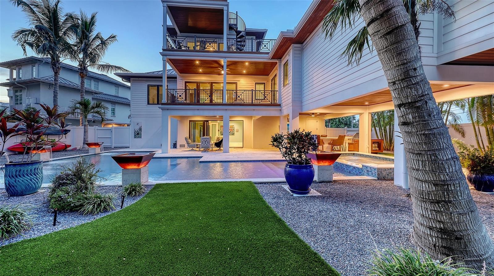 The Quintessence of Coastal Living: A British West Indies Masterpiece on Longboat Key - Where Architecture Meets Paradise. Offered turn-key, this exquisite 4,000+ sq. ft., 4-bedroom, 4.5-bath residence in Longboat Key’s prestigious Bonaire subdivision is a rare union of refined British West Indies architecture and the serene beauty of Florida’s Gulf Coast. Every inch of this home has been thoughtfully crafted to evoke a sense of effortless luxury—where sun-kissed days and gentle Gulf breezes blur the line between indoors and out. From the moment you step through the grand entrance, you’re embraced by light, texture, and tranquility. Creamy finishes, warm woods, and bespoke millwork elevate every space, while expansive windows and French doors invite in the turquoise glow of the Gulf and the soothing rhythm of coastal life. Main Level Elegance - The heart of the home features an open-concept chef’s kitchen with top-of-the-line appliances: a Wolf 6-burner gas range with custom vent hood, dual Asko dishwashers, Sub-Zero refrigerator/freezer, Wolf convection/microwave, and a 50-bottle wine captain. Quartz countertops, artisan pendant lighting, and a massive island with farmhouse sink make this space as beautiful as it is functional. The adjoining dining and great room flow effortlessly to an expansive balcony - perfect for indoor-outdoor entertaining. The main-floor Primary Suite offers tray ceilings, shiplap accents, dual walk-in closets, and a spa-inspired bath with soaking tub, double-entry stone shower, and sparkling stone vanities. Two additional ensuite guest rooms on this level echo the home’s airy, coastal elegance, and exceptional quality. Upper-Level Retreat - Ascend to a private owner’s sanctuary with dual custom closets and a lavish bath adorned with blue calcite counters, glass mosaic tile, and a freestanding tub. This level includes a substantial private balcony with access to the upper-level viewing balcony. The Observation Deck - Crowning the home is the ultimate vantage point—a “crow’s nest” with panoramic Gulf and Sarasota Bay views. It’s here you’ll end each day watching sunsets paint the horizon in unforgettable color. Resort-Style Outdoor Living - The pool retreat is an absolute showstopper - pocketing sliding doors reveal coral stone terraces, a resort-style pool with sun shelf and tiled cocktail table, a 10-person spa, and a fully equipped outdoor kitchen with seating for eight. The entire area is lined with an automatic insect elimination system to ensure you can enjoy the outdoors all year long. Optical lighting enhances the overflowing water features which seem to dance in the glow of firelight, creating the perfect setting for stargazing or nightcaps. The community provides private beach access and is close to world-class golf, tennis, fine dining, and the largest deep-water marina on the Gulf coast. This is more than a home - it’s a sanctuary, a work of art, and a lifestyle. Delivered exactly as you see it, fully furnished and ready to enjoy, this British West Indies masterpiece awaits the one discerning buyer ready to claim the very best of Longboat Key coastal living.