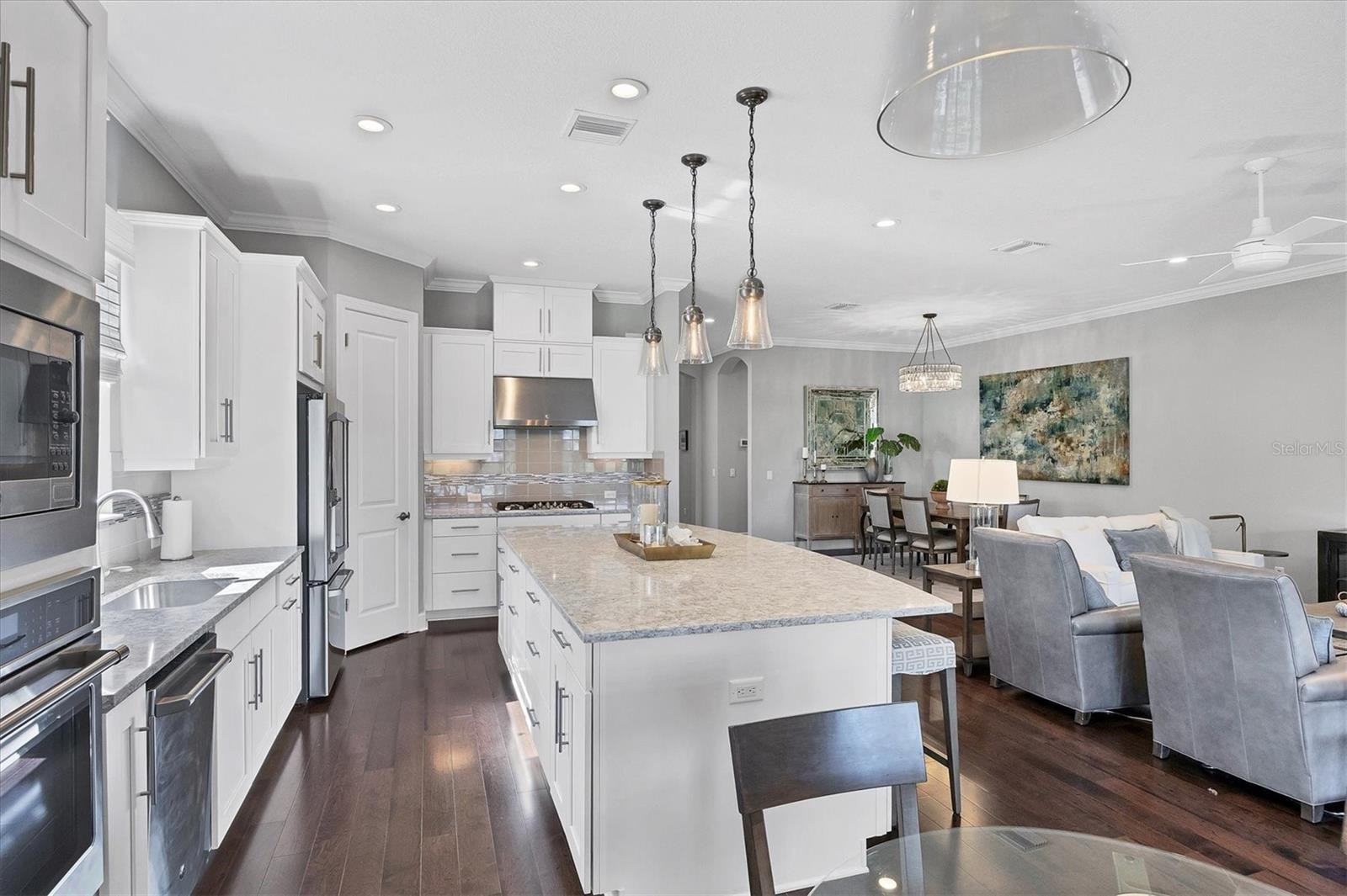 This beautiful home is a must see! Located along the second fairway of the Esplanade Golf and Country Club, this three-bedroom, three- full bath Taylor Morrison extended Lazio model residence offers a spacious layout and an atmosphere of refined comfort. Engineered hardwood floors flow throughout the main living areas, while crown molding and plantation shutters enhance the home’s architectural detail and provide privacy. A soft, neutral palette creates a timeless backdrop for a variety of personal design styles. Meticulous maintenance and pride of ownership are evident throughout. The HVAC system has been recently updated, and the home’s exterior was professionally repainted in 2025. Each bedroom features a full bath and professionally designed closets with built-in storage. The primary suite serves as a serene retreat with a well-appointed bath. Glass French doors enclose the den, offering flexibility as a private office or guest space. The kitchen centers around a large quartz island with a valued breakfast area, and features GE Café Series appliances for a polished culinary experience. A deeded- golf membership comes with the property. Expansive fairway rear views and an eastern exposure provide bright and picturesque mornings and shaded afternoons on the spacious lanai. Furnishings are available for purchase under a separate agreement. Residents of Esplanade Golf and Country Club enjoy an array of resort-style amenities, including pickleball and tennis, fitness classes, dance and art classes, health lectures, card and book clubs, as well as numerous social and philanthropic opportunities. Meet up with friends at the Bahama Bar or the popular Culinary Center dining options. Esplanade is located within 30 minutes of downtown Sarasota and all its cultural offerings, and less than an hour from the famous Gulf Coast beaches. Take this opportunity to enjoy the Florida lifestyle!