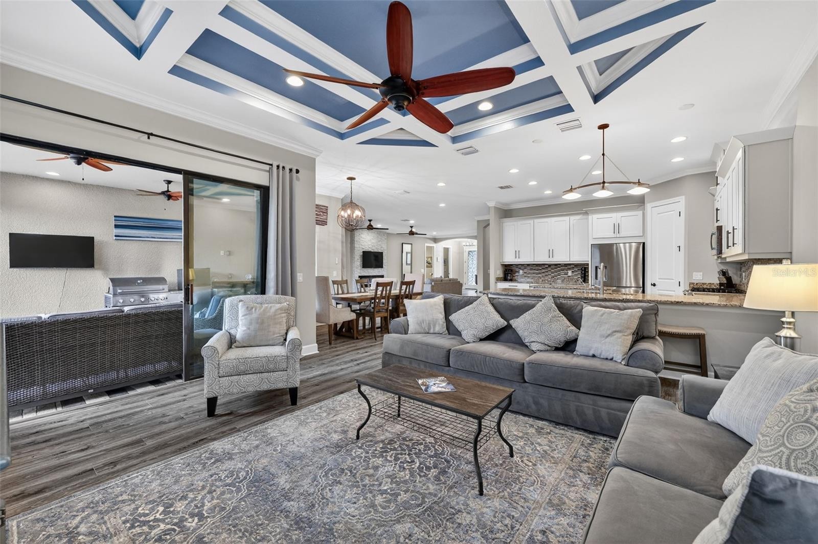 THIS IS A GOLF DEEDED HOME! Welcome to 5010 Tivoli Run, an elegant 3-bedroom, 3 full bathroom and half bath single family home with a den, offering nearly 3,000 square feet of thoughtfully designed living space. From the moment you enter, you are greeted by 10 ft ceilings, 8 ft doors, coffered ceilings, and crown molding that create a sense of openness and sophistication throughout. The home features multiple living spaces including a formal living area, family room, and dining room, ideal for both entertaining and everyday living. The living room showcases a striking stone accent wall with a fireplace, while the family room mirrors this design with its own stone feature wall, adding warmth and visual continuity. The main living areas are finished with wood laminate flooring, complemented by tile in the bathrooms and plush carpet in the bedrooms. Custom closets provide enhanced organization and storage solutions throughout. The primary suite offers a refined retreat with wood laminate flooring and a spacious ensuite bath featuring dual sinks with a built in make-up vanity, a relaxing garden tub, and a separate shower. Step outside to a spacious screened lanai complete with an outdoor kitchen, perfect for hosting gatherings or enjoying quiet evenings. One side of the lanai is fenced, offering additional flexibility for privacy or pets. This 3-bedroom single family home at 5010 Tivoli Run combines elegant design elements, functional living spaces, and inviting outdoor features to create a refined and comfortable lifestyle. Esplanade offers a wide array of amenities and activities such as an 18-hole championship golf course, two resort pools, hot tubs, resistance pool, pickleball, tennis, bocce ball, two fitness centers, exercise classes, two dog parks, firepit, spa/salon, an on-site lifestyle director, social events, and various clubs plus a Tiki bar. The state-of-the-art Culinary Center offers residents several dining options such as the Barrel House as well as wine tastings, and special events.