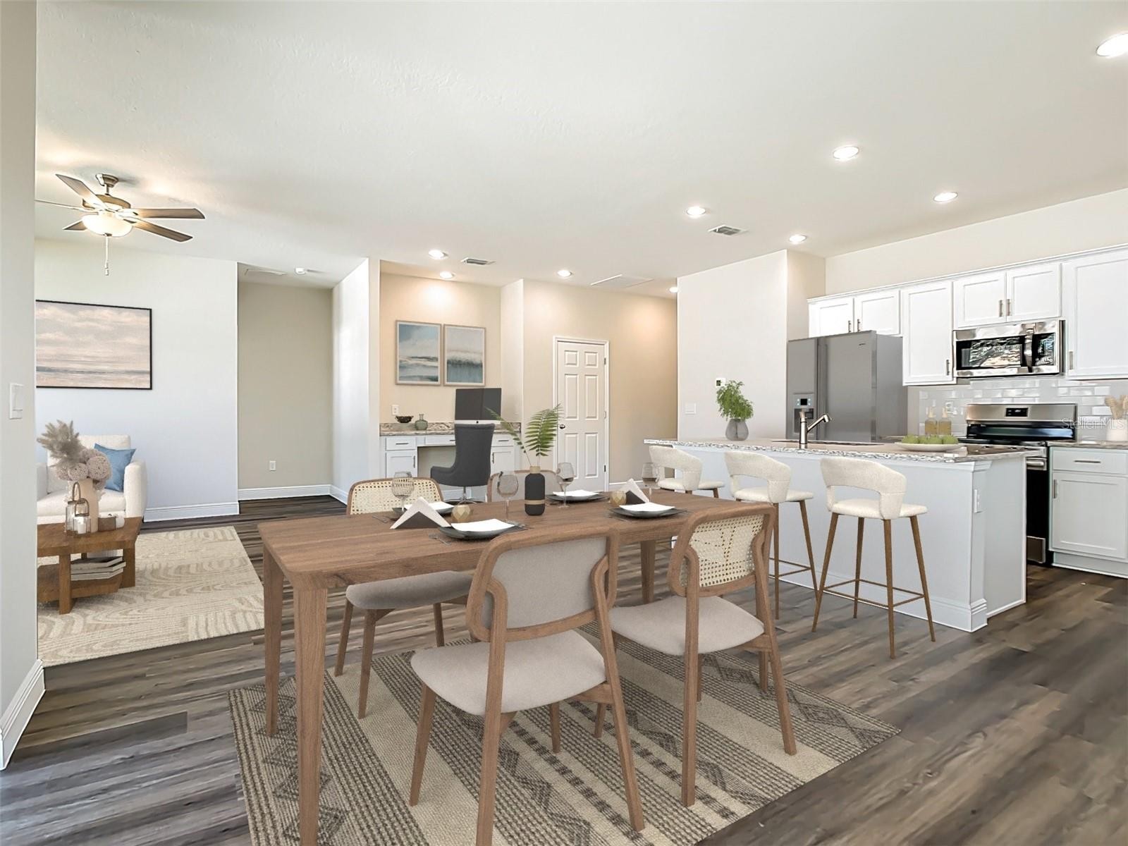 One or more photo(s) has been virtually staged. One or more photo(s) has been virtually staged. Under Construction. Resibuilt Home-Buy a home for the holidays! A brand new construction home with city water and septic in North Port and no HOA! This affordable new home is almost ready for you and is just what you've been looking for, and with city water! This open floor plan has a large main living area with the kitchen, dining area, and living room all open to each other, with large windows and sliding glass doors providing plenty of natural light. The kitchen space is open with a desk area and another area for a dining table. The dining area is spacious and has access to a sliding glass door to the covered back porch and the living room features multiple LED lights giving the home bright lighting. With almost 1600 square feet of living area, this floor plan is larger than you might imagine with 3 bedrooms, 2 full bathrooms, and a 2-car garage. The front of the home offers a large covered front porch that leads you into a spacious foyer where you will have the open living area. The home will allow you to enjoy the Florida lifestyle with the outdoor living area on the front porch and more seating on the covered back porch. The master bedroom is spacious with large windows bringing in natural light, and features an en-suite bathroom with a tiled shower with glass enclosure, double vanity with granite countertops, and a large walk-in closet. The two guest bedrooms share a full bathroom with the same beautiful cabinetry and granite countertops. The home includes luxury vinyl plank flooring in the main living area and wet areas for durability and comfort. You'll love them as they are easy to maintain and a trending design element in new homes. The spacious kitchen features stainless steel appliances, Shaker-style cabinets with 36" upper cabinets, crown molding and hardware, and beautiful granite countertops. It also boasts a large island with additional seating. The Shaker-style cabinets and granite extend into the guest bathroom. Other features include 5" baseboards, gutters throughout the house, a garage door opener with remote control, R38 insulation, 16 SEER air conditioning, LED lighting, and more. Take advantage of the seller's incentive when you purchase this home or inquire about any of our other homes under construction. We have a variety of locations and color palettes to choose from, so give us a call for a complete list.