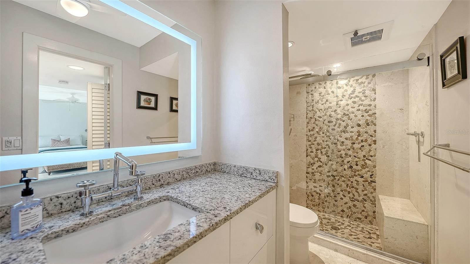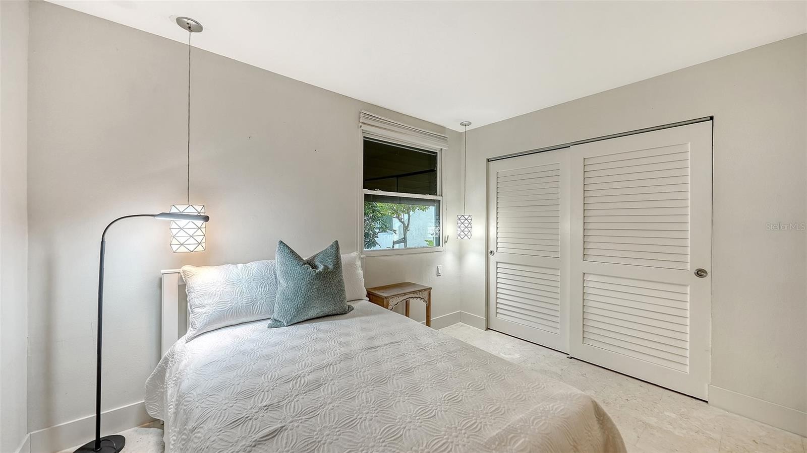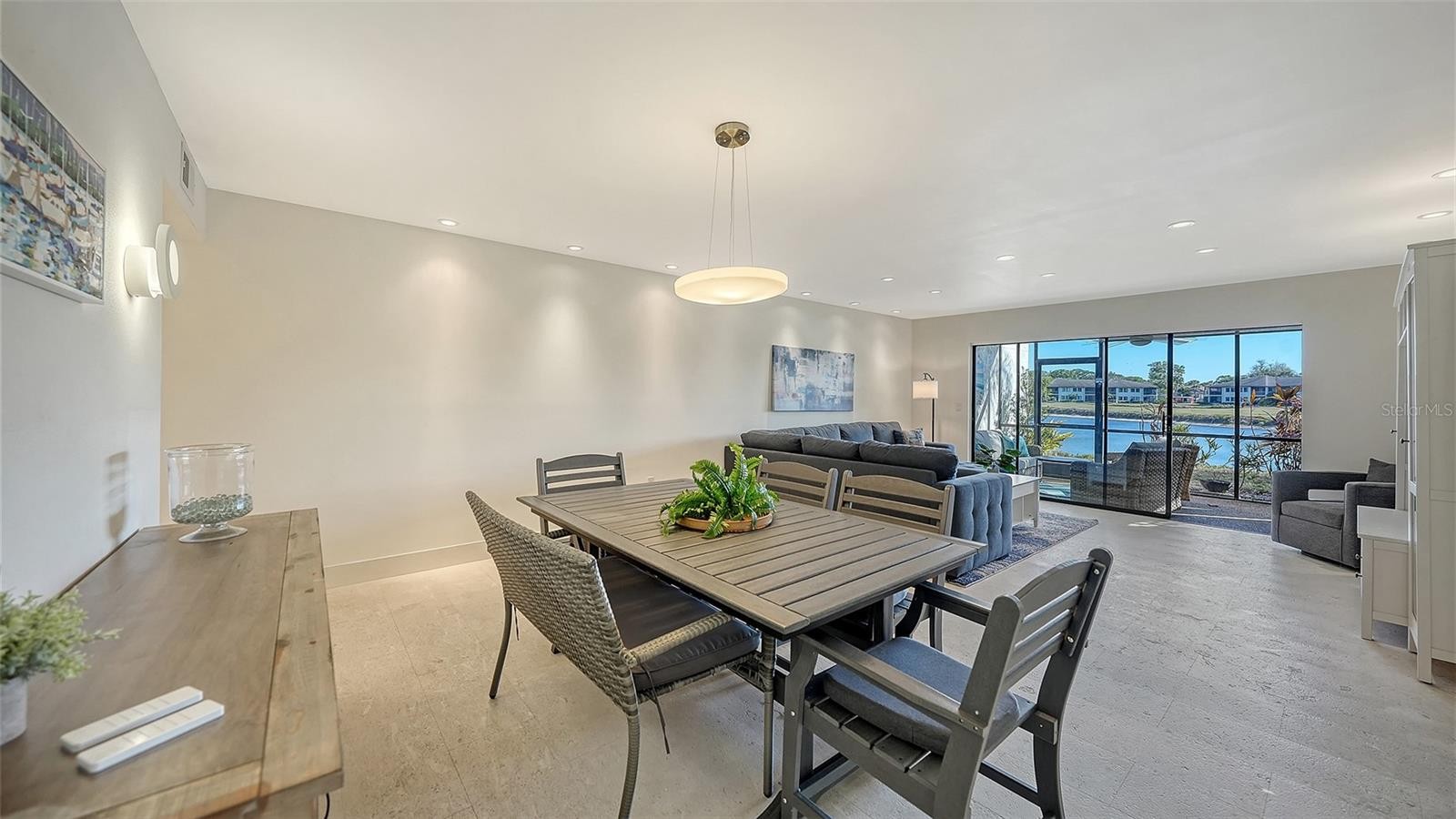 This beautifully reimagined first floor end-unit condominium in The Meadows offers serene lake and golf course views and a thoughtfully designed layout that lives like a private retreat. With two bedrooms, a den, and a carport, the residence is filled with natural light and enhanced by multiple outdoor spaces, including a screened lanai overlooking open vistas, a charming courtyard ideal for gardening or pets, and a paver patio accessible from the primary suite. The interior has been fully renovated with a clean, modern aesthetic and exceptional attention to detail. Cool, smooth crushed-shell flooring runs throughout, complemented by custom cabinetry, white quartz countertops, under-mount sinks with touch-activated faucets, and a suite of stainless steel appliances, including an induction/convection range. Subtle luxury touches such as re-surfaced smooth ceiling texture, recessed lighting, electronic shades, and dimmer switches add both comfort and convenience. Both bathrooms are finished to spa standards, featuring elegant European-style design, a rain shower, and refined fixtures. The primary bedroom is bright and welcoming, with a generously sized walk-in closet. The kitchen is supported by an oversized walk-in pantry that also houses a stackable front-load washer and dryer and the water heater. Major system updates include a full repipe in 2014, water heater in 2014, air conditioning in 2020, and new community roofs completed in 2022. The Heronmere condo community has its own pool that is included in the condo fee. Residents can also enjoy access to The Meadows Golf Course, the newly enhanced Fitness and Wellness Center, personal training, Junior Olympic lap pool, tennis, and pickleball with flexible membership options and a la carte pricing. Located just steps from The Meadows Village Center with shopping and dining, this home is part of a vibrant resort-style community known for mature Oaks and lush greenery, a picturesque setting, and miles of walking trails, yet only minutes from downtown, UTC Mall, Benderson Park, and year-round outdoor activities. Furnishings negotiable.