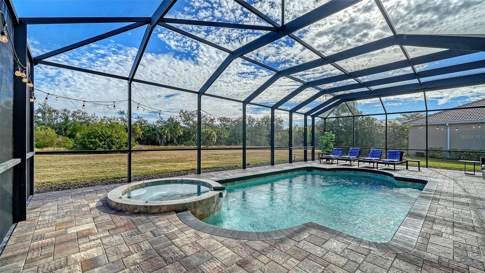 Experience River Strand Country Club, a premier Arthur Hills–designed championship golf community where luxury and resort-style amenities combine to set the tone for inspired everyday living. Where can you find FULL GOLF MEMBERSHIP with fees as reasonable as these? Located on a quiet cul-de-sac, this expansive two-story, 5-bedroom, 3 full and 1 half bath home offers an impressive 2,603 sqft of updated living space, delivering exceptional value at this price point. Recent upgrades include $72,000 in hurricane-impact windows and sliders, renovated kitchen, new exterior paint, new lanai pavers and stylish luxury vinyl flooring throughout the first floor. Soaring 20-foot ceilings and abundant natural light create an open, airy feel upon entry. The dining area is ideal for gatherings and holidays, while the adjacent flexible space easily serves as a home office, playroom, or formal living area—perfect for today’s lifestyles. At the heart of the home is the 2024 renovated GOURMET KITCHEN, featuring crisp white cabinetry, Quartz countertops, a large center island, new appliances, pot filler, designer blue tile backsplash, and abundant storage with full sized pantry. The kitchen flows seamlessly into the living area, creating an inviting space for everyday living and entertaining—all with beautiful views of the quite large heated pool and spa. Step onto the spacious covered lanai and enjoy peaceful preserve views and spectacular sunrises, with frequent wildlife sightings including deer, owls, and native birds—offering a rare sense of privacy and serenity. It is truly magical and sets this home apart from the others. The first floor includes a private guest bedroom, full bath, half bath, and a separate laundry room—ideal for visitors or multigenerational living. Upstairs, the primary suite is a true retreat with a generous walk-in closet and en suite bath, with separate shower and soaking tub. Three additional bedrooms share a full bath. Plush carpeting upstairs adds comfort, and the 2-car garage with epoxy flooring completes the home. Grand Preserve residents enjoy an unmatched lifestyle with a 27-hole championship golf course, tennis and pickleball courts, fitness center and classes, resort-style pools, and a vibrant social calendar. Casual dining and cocktails are available at the Shank Shack and Tiki Bar, with an $8.5 million clubhouse restaurant renovation underway—further elevating the community experience. With modern upgrades, generous square footage, tranquil preserve views, and world-class amenities, this move-in-ready home offers a rare opportunity to enjoy the best of River Strand living—where every day feels like a vacation.