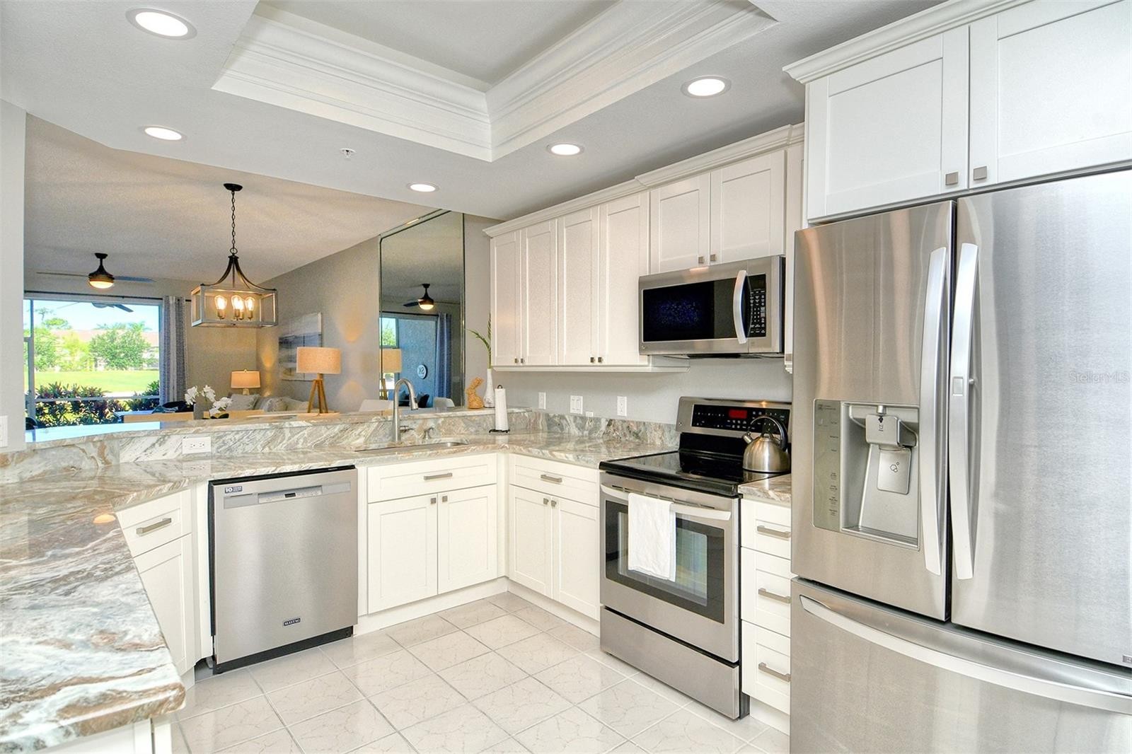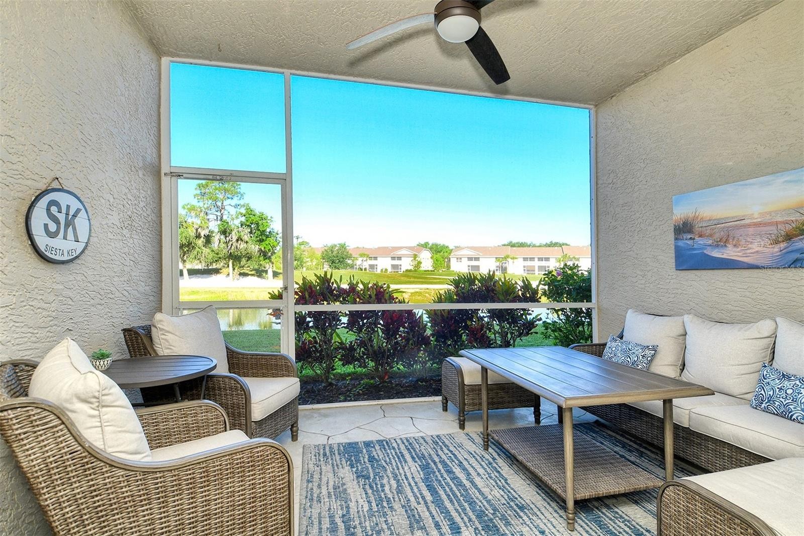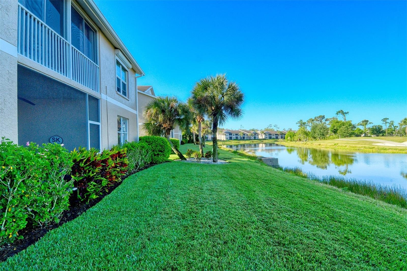 Stop, this is the property you have been waiting for. This gorgeous and highly renovated first floor "Abbey" floor plan Veranda features 2 bedrooms, 2 bathrooms, a den/study, a detached one car garage and is being sold Turn-Key Furnished. The property is perfect for a full time resident, seasonal owner, or investment property. As you walk through the front door, you'll be welcomed with many beautiful updates and an abundance of natural light making the property feel open and bright. The owners have spared no expense making the wonderful property what it is today. The kitchen has been remodeled with lovely shaker style cabinetry including additional cabinets for more storage, granite counter tops, and stainless steel appliances. Most flooring has been upgraded to a low-maintenance LVP flooring and taller base boards giving a clean and modern aesthetic. The primary suite is an absolute oasis. With a large bedroom with spectacular views and a completely revamped ensuite bathroom with a large walk-in shower and upgraded vanity with granite countertops and dual sinks, this space really feels like your own private spa. The den/study is a sizable room that can accommodate any of your needs and can be a perfect flex space for overflow guests. The A/C was replaced in 2022, and the water heater in 2021 giving years of worry-free living. Make your way onto the rear lanai space and take in the breathtaking views of water and the 14th Signature Hole of the golf course - the view is truly astonishing! In addition, an oversized washer and dryer has been installed and a functional pocket door installed to give more space when washing and preparing laundry. The owners have also repainted the interior with neutral hues giving this modern space an upgraded look. Heritage Oaks is known for its pristine 18-hole golf course, har-tru tennis courts, fitness center, 24-hour security, an impressive recently renovated clubhouse with 2 restaurants including the sensational 19th Hole Lounge, 5 heated swimming pools, and a calendar of events packed with activities. Schedule a showing on this wonderful Abbey today!