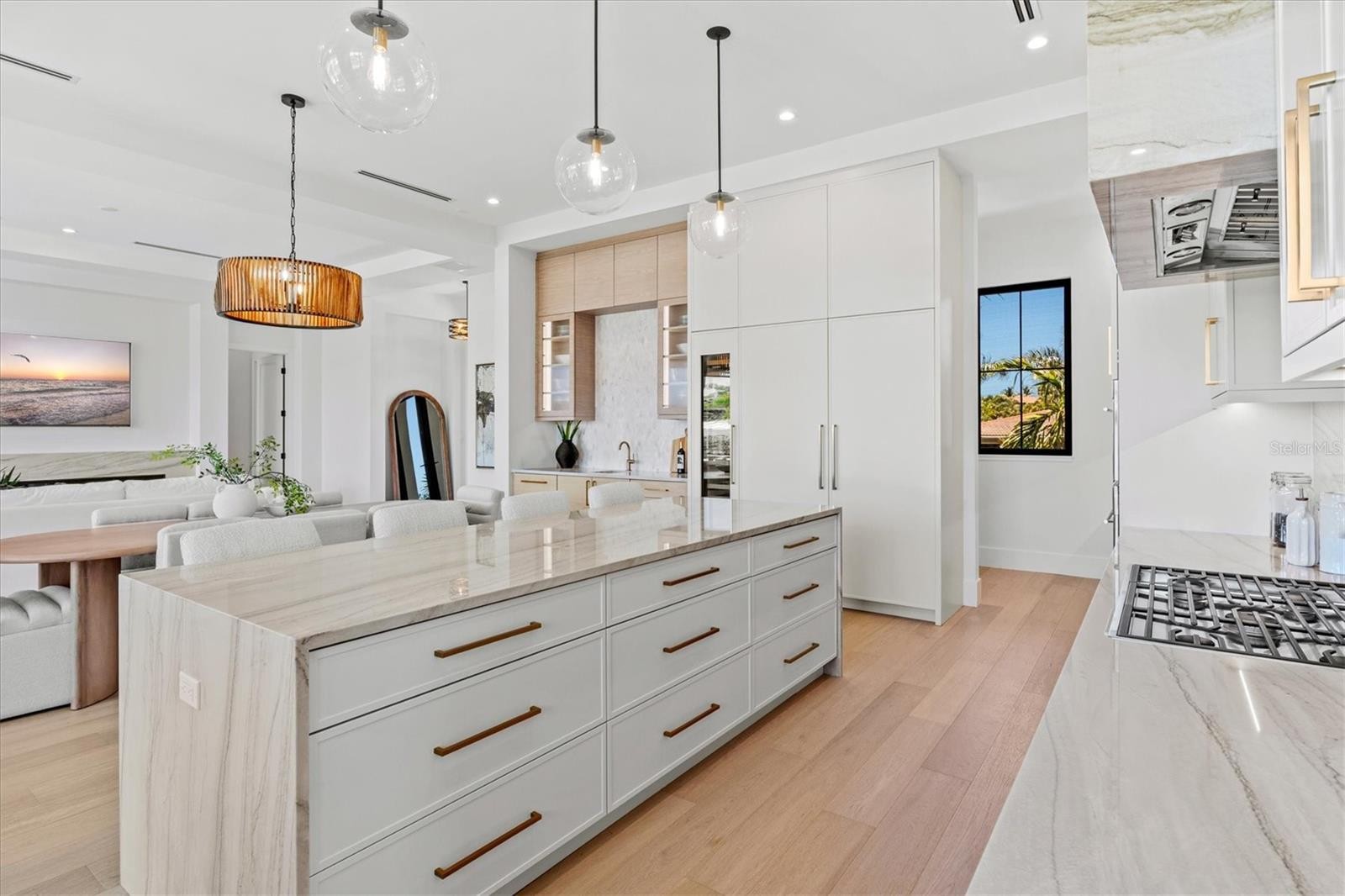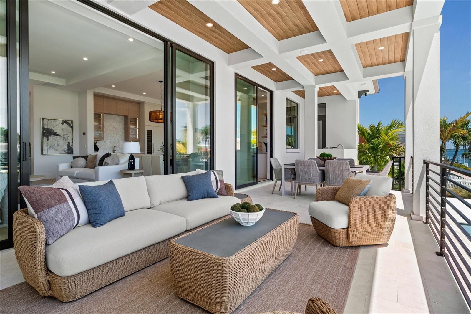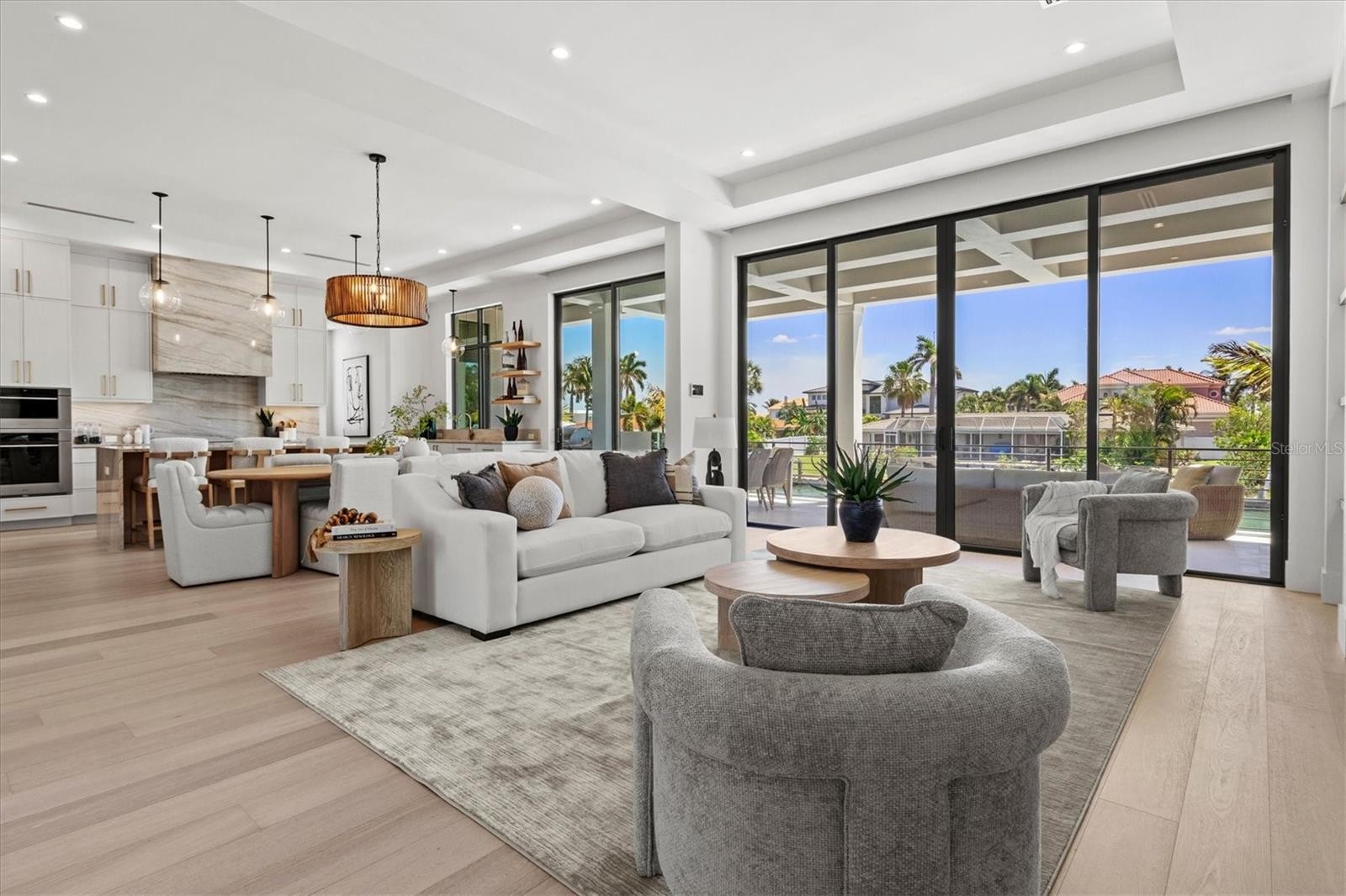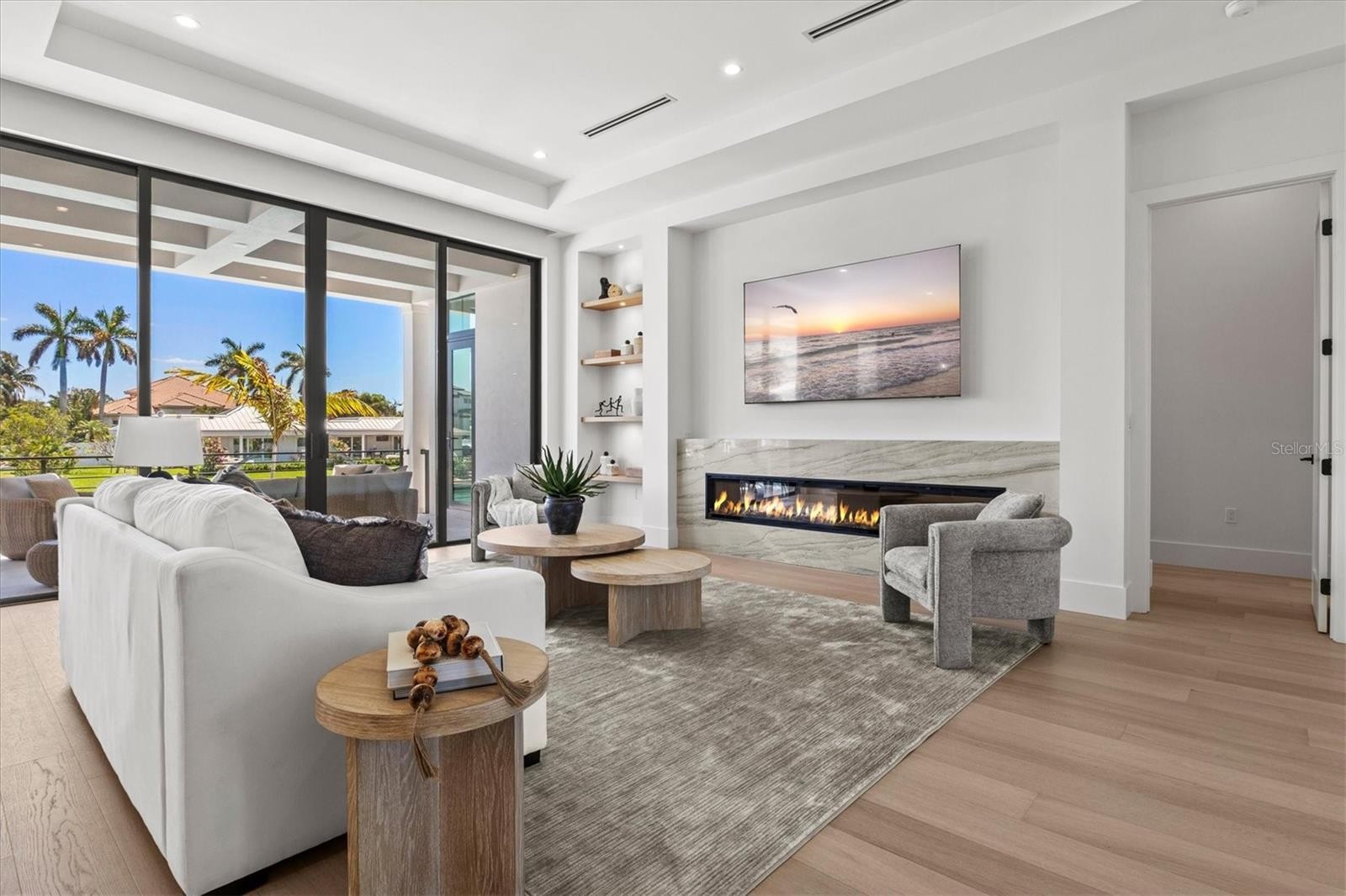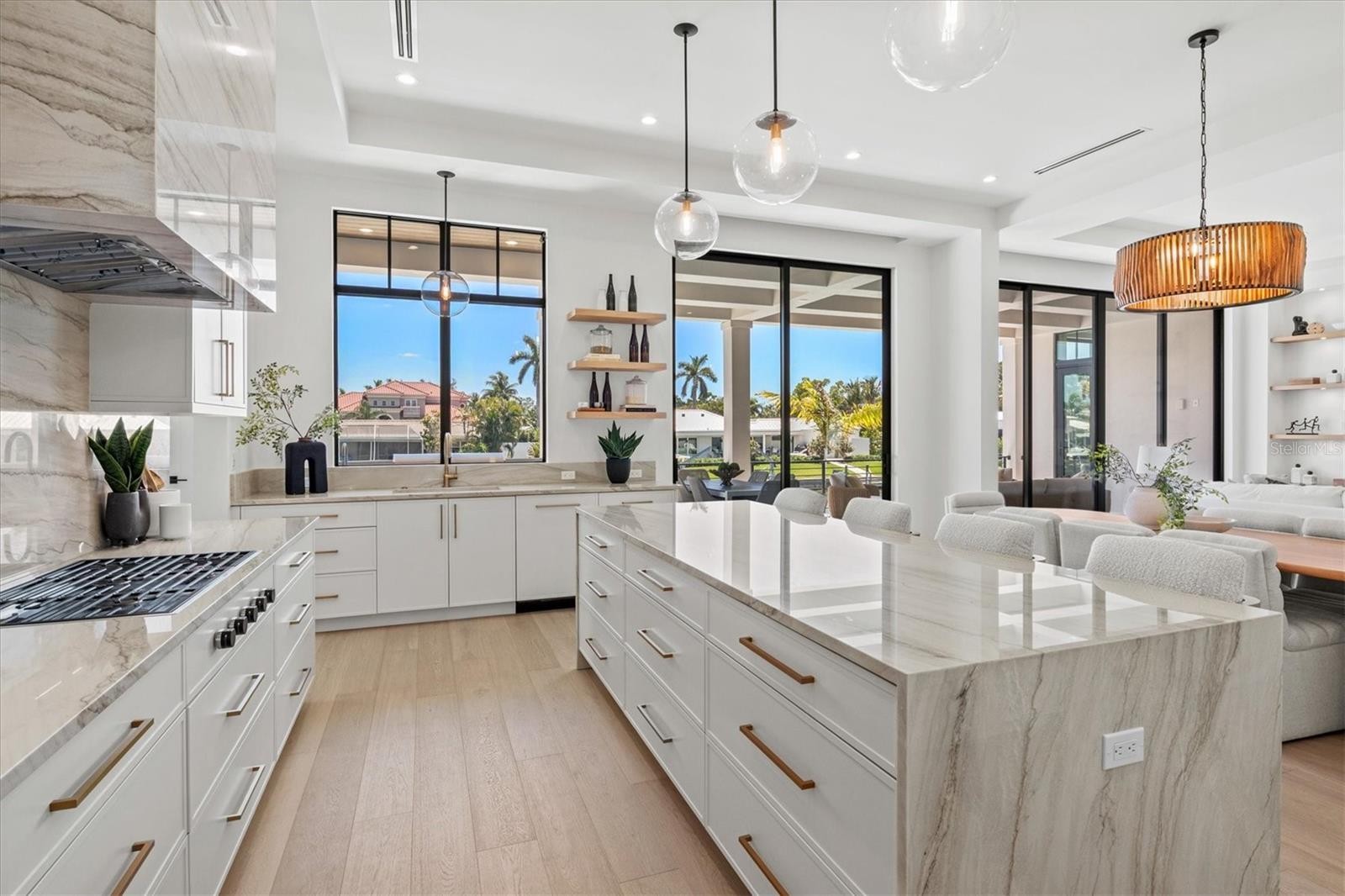 One or more photo(s) has been virtually staged. Only ONE BUYER will be the FIRST OWNER! Crafted by an award winning design team, this brand-new coastal contemporary waterfront residence awaits you in the exclusive Country Club Shores community on South Longboat Key. Designed for high performance and easy maintenance, this rock-solid, all block two-story residence with a private elevator provides peace of mind while capturing the essence of easy island living. A fluid open-concept layout is ideal for seamless indoor-outdoor waterfront entertaining. Soaring ceilings with impressive transom glass over casement windows and 10-foot tall sliding glass doors illuminate the interiors with natural light. At the heart of the home, a thoughtfully created gourmet kitchen and wet bar are a showpiece, featuring tailor made modern shaker doors and full panel rift-cut white oak cabinetry. Striking elements include the waterfall island and a dramatic ceiling-height hood, both wrapped in exotic natural Quartzite. A full suite of Wolf & Sub-Zero appliances includes twin 30" refrigerator & freezer towers, an 18" wine tower, under counter beverage centers, wall ovens and a contemporary gas cooktop. The first-floor primary suite is a serene retreat featuring a warm wood-slatted ceiling, expansive glass and a gorgeous bathroom with a freestanding soaking tub, dual vanities and textured porcelain tile accents. An inviting staircase leads to an elevated private home office with a half bathroom. The second floor features a game room with a wet bar and three en-suite guest bedrooms, offering comfort and flexibility complemented by a 30 foot covered balcony overlooking the tranquil water views. Energy-efficient features include variable speed 17 SEER HVAC systems, spray foam insulation and hurricane impact-resistant ES windows and doors. Control4 Smart Home technology provides many conveniences. A host of pre-wired systems—including sound, security, shades and EV charging—can be customized to the buyer's selections. Outside, a brand-new, 100-foot-long, extra-wide seawall protects a resort-style paradise! A four piece French patterned Crema Nova marble decking surrounds the 40-foot linear pool with in-water bench seating, a large sun shelf and a 12 foot wide spa. An elevated lanai with detailed ceilings features an outdoor kitchen, complete with Naturkast marine grade cabinetry, under counter refrigerator and a 42 inch built-in grill offering the perfect retreat for alfresco dining and poolside lounging. All this is just minutes from the extraordinary shopping and dining of St. Armands Circle, the cultural richness of downtown Sarasota, and the world-renowned Gulf beaches of Longboat Key. Seller is offering generous allowances towards custom closets and boat dock design providing an opportunity for the buyer to personalize these features to meet their sytle and preferences!