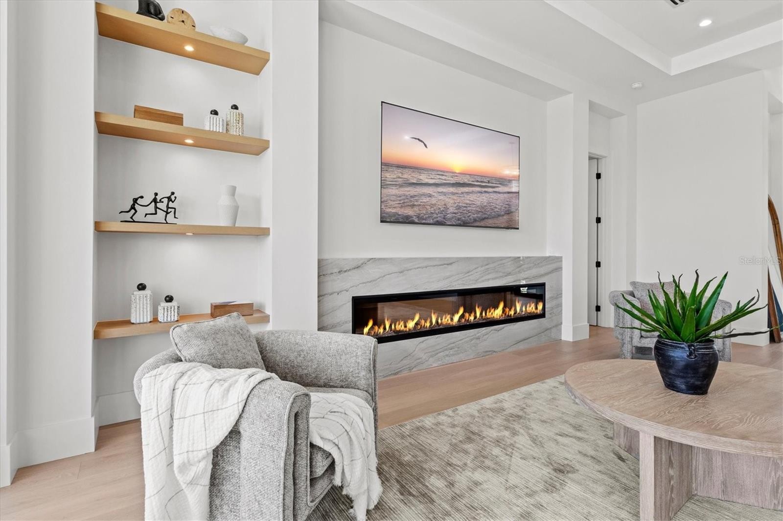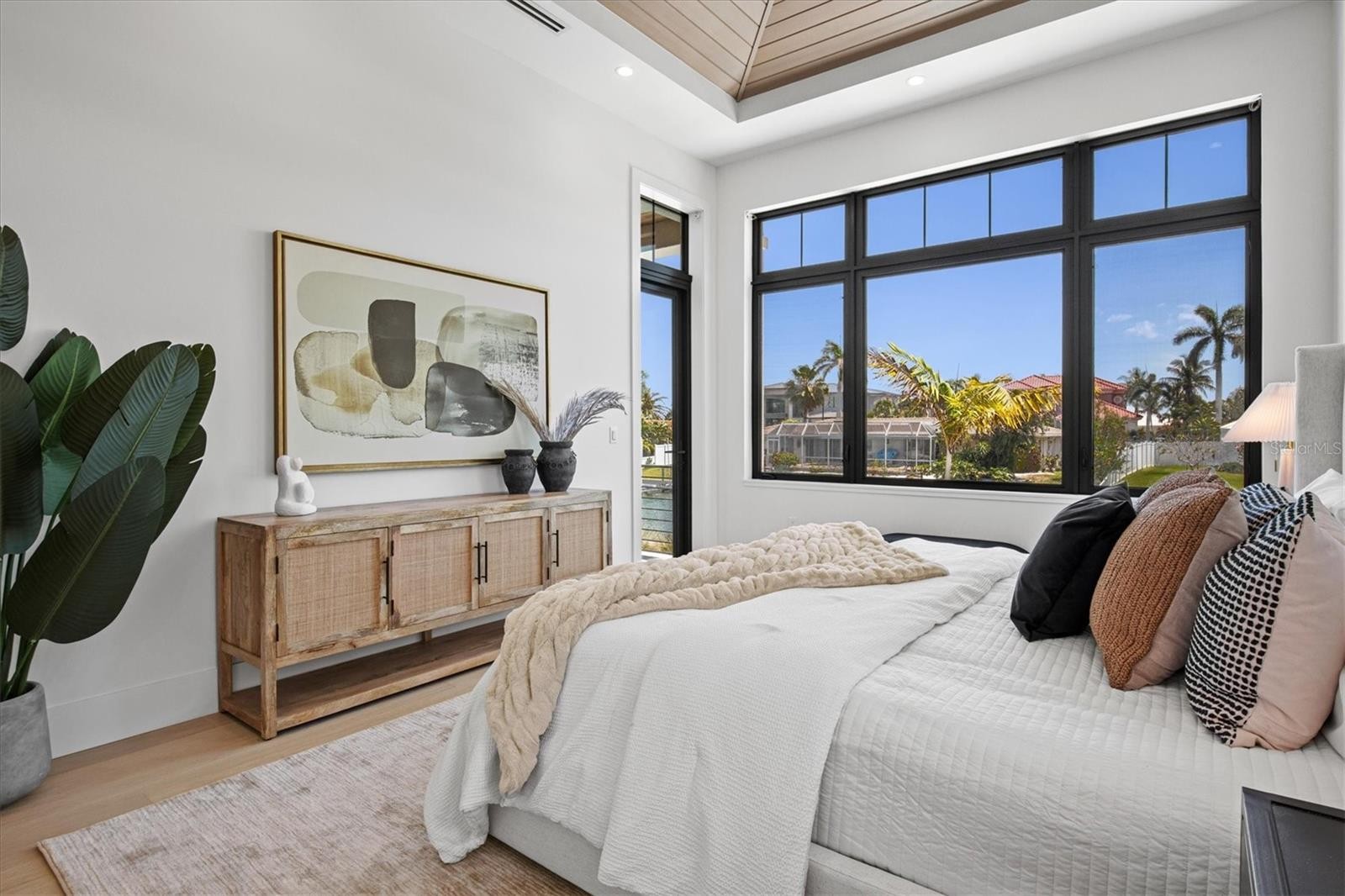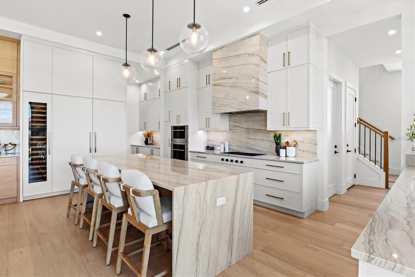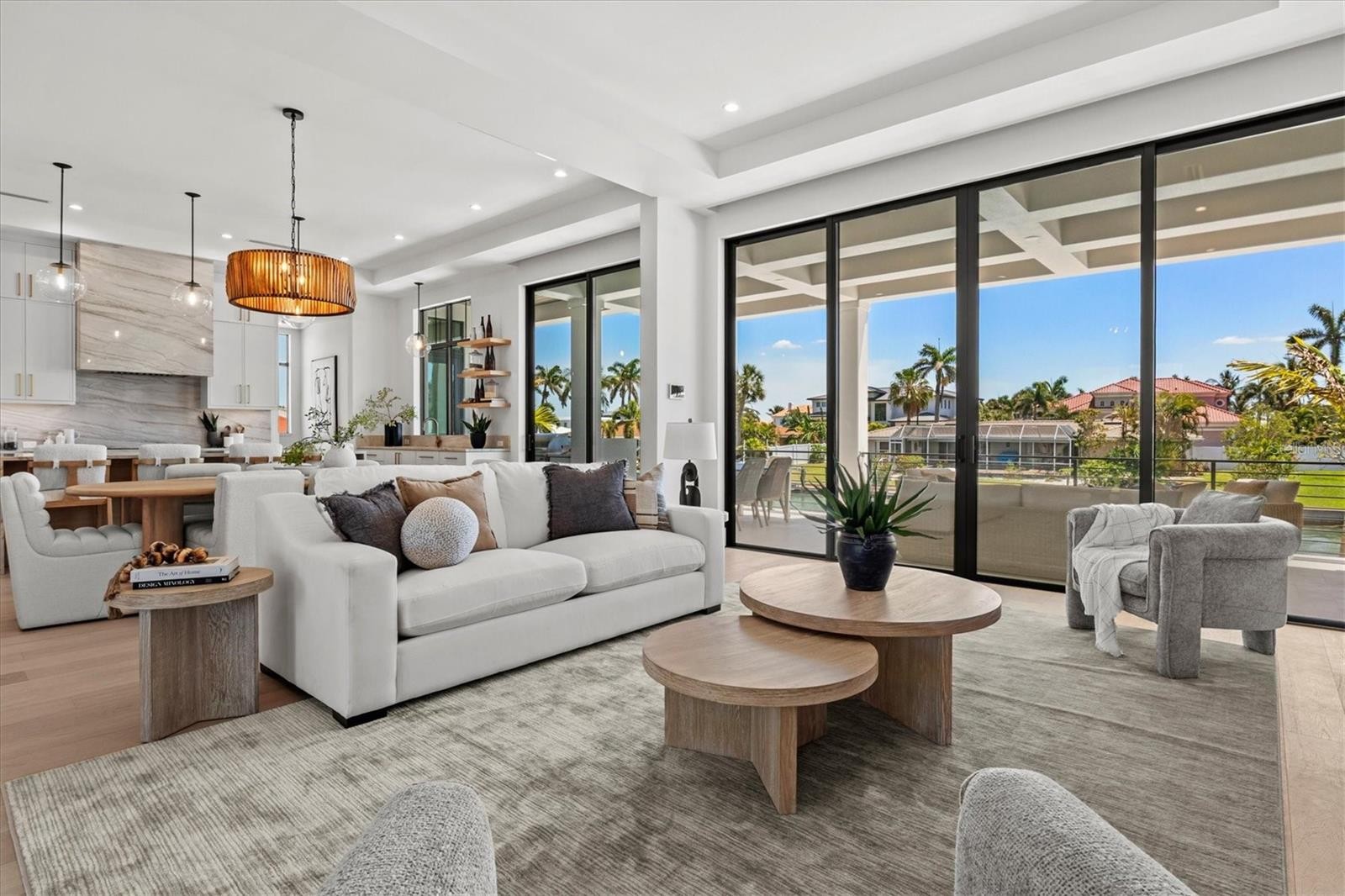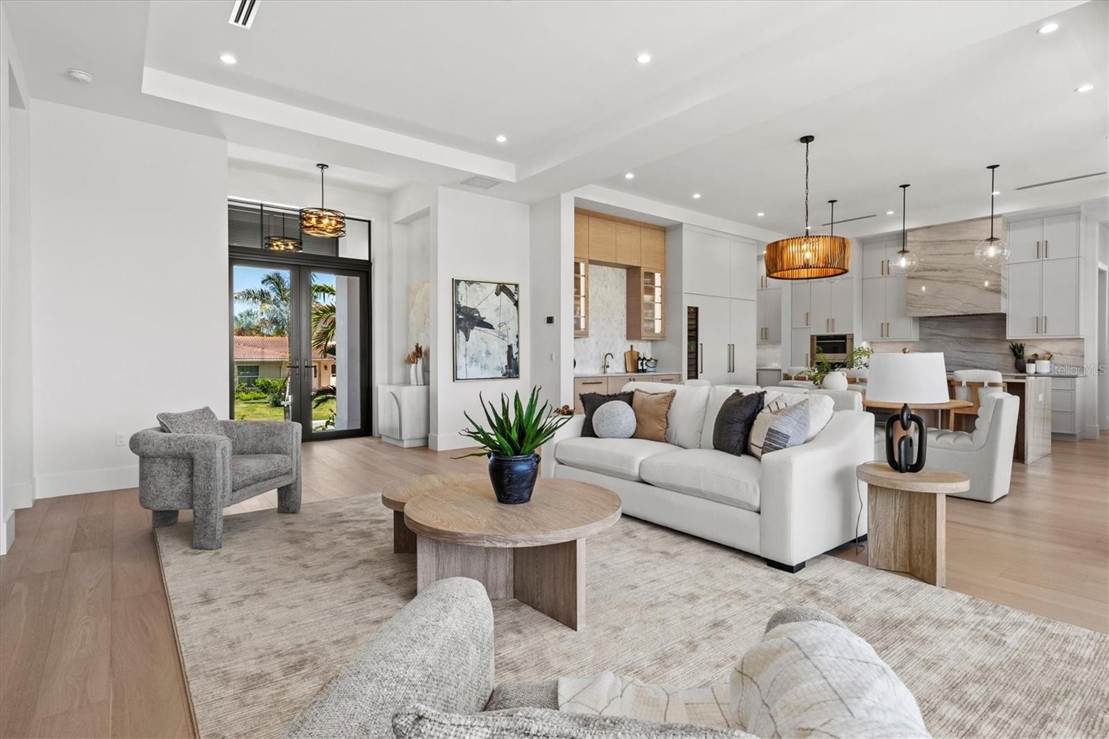 One or more photo(s) has been virtually staged. Only ONE BUYER will be the FIRST OWNER! Crafted by an award winning design team, this brand-new coastal contemporary waterfront residence awaits you in the exclusive Country Club Shores community on South Longboat Key. Designed for high performance and easy maintenance, this rock-solid, all block two-story residence with a private elevator provides peace of mind while capturing the essence of easy island living. A fluid open-concept layout is ideal for seamless indoor-outdoor waterfront entertaining. Soaring ceilings with impressive transom glass over casement windows and 10-foot tall sliding glass doors illuminate the interiors with natural light. At the heart of the home, a thoughtfully created gourmet kitchen and wet bar are a showpiece, featuring tailor made modern shaker doors and full panel rift-cut white oak cabinetry. Striking elements include the waterfall island and a dramatic ceiling-height hood, both wrapped in exotic natural Quartzite. A full suite of Wolf & Sub-Zero appliances includes twin 30" refrigerator & freezer towers, an 18" wine tower, under counter beverage centers, wall ovens and a contemporary gas cooktop. The first-floor primary suite is a serene retreat featuring a warm wood-slatted ceiling, expansive glass and a gorgeous bathroom with a freestanding soaking tub, dual vanities and textured porcelain tile accents. An inviting staircase leads to an elevated private home office with a half bathroom. The second floor features a game room with a wet bar and three en-suite guest bedrooms, offering comfort and flexibility complemented by a 30 foot covered balcony overlooking the tranquil water views. Energy-efficient features include variable speed 17 SEER HVAC systems, spray foam insulation and hurricane impact-resistant ES windows and doors. Control4 Smart Home technology provides many conveniences. A host of pre-wired systems—including sound, security, shades and EV charging—can be customized to the buyer's selections. Outside, a brand-new, 100-foot-long, extra-wide seawall protects a resort-style paradise! A four piece French patterned Crema Nova marble decking surrounds the 40-foot linear pool with in-water bench seating, a large sun shelf and a 12 foot wide spa. An elevated lanai with detailed ceilings features an outdoor kitchen, complete with Naturkast marine grade cabinetry, under counter refrigerator and a 42 inch built-in grill offering the perfect retreat for alfresco dining and poolside lounging. All this is just minutes from the extraordinary shopping and dining of St. Armands Circle, the cultural richness of downtown Sarasota, and the world-renowned Gulf beaches of Longboat Key. Seller is offering generous allowances towards custom closets and boat dock design providing an opportunity for the buyer to personalize these features to meet their sytle and preferences!