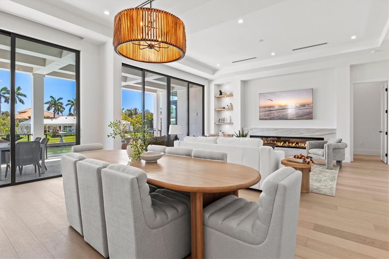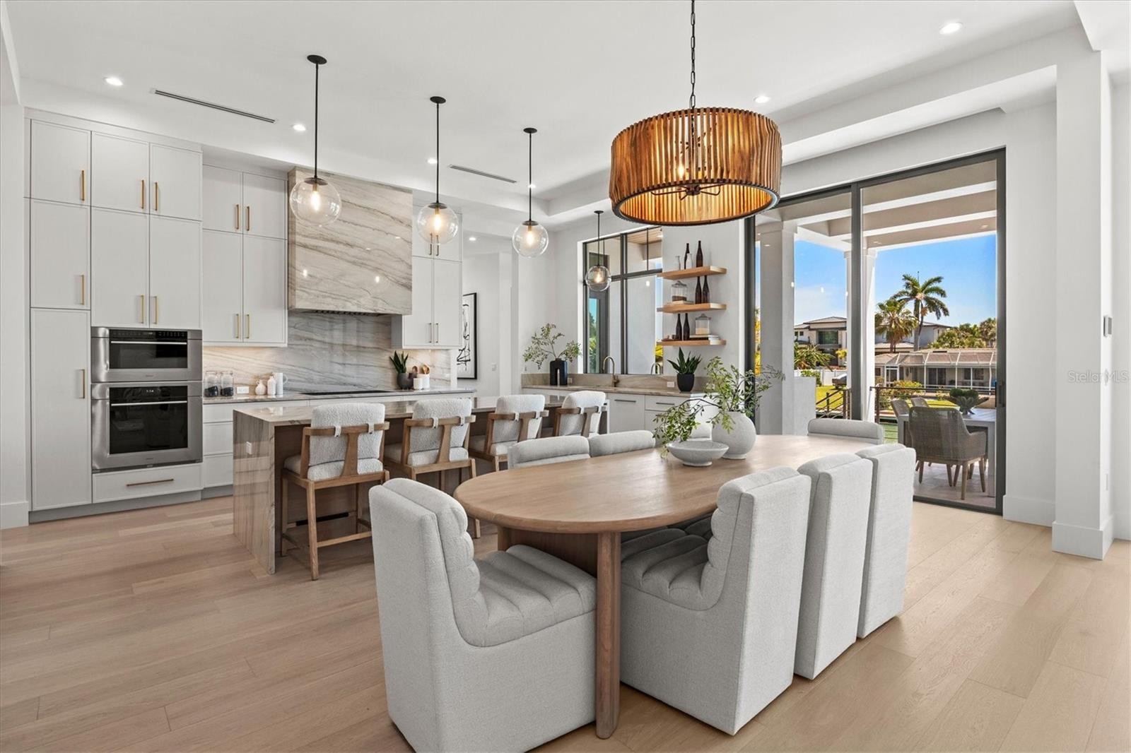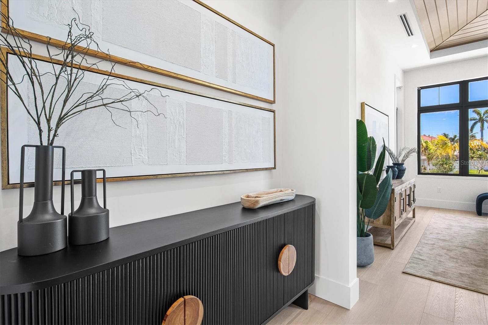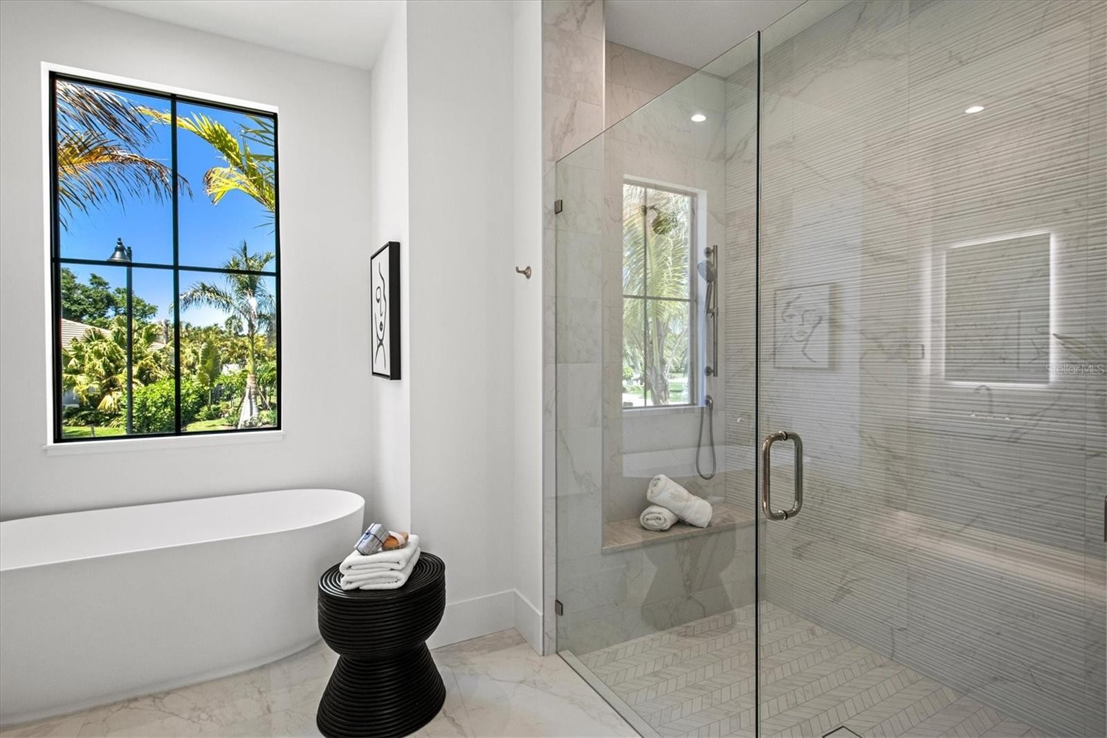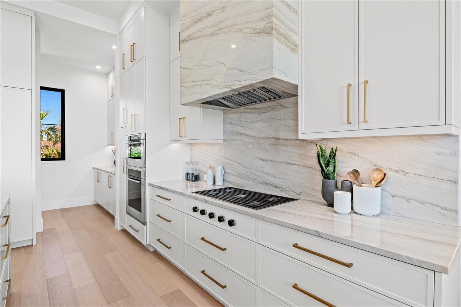 One or more photo(s) has been virtually staged. Only ONE BUYER will be the FIRST OWNER! Crafted by an award winning design team, this brand-new coastal contemporary waterfront residence awaits you in the exclusive Country Club Shores community on South Longboat Key. Designed for high performance and easy maintenance, this rock-solid, all block two-story residence with a private elevator provides peace of mind while capturing the essence of easy island living. A fluid open-concept layout is ideal for seamless indoor-outdoor waterfront entertaining. Soaring ceilings with impressive transom glass over casement windows and 10-foot tall sliding glass doors illuminate the interiors with natural light. At the heart of the home, a thoughtfully created gourmet kitchen and wet bar are a showpiece, featuring tailor made modern shaker doors and full panel rift-cut white oak cabinetry. Striking elements include the waterfall island and a dramatic ceiling-height hood, both wrapped in exotic natural Quartzite. A full suite of Wolf & Sub-Zero appliances includes twin 30" refrigerator & freezer towers, an 18" wine tower, under counter beverage centers, wall ovens and a contemporary gas cooktop. The first-floor primary suite is a serene retreat featuring a warm wood-slatted ceiling, expansive glass and a gorgeous bathroom with a freestanding soaking tub, dual vanities and textured porcelain tile accents. An inviting staircase leads to an elevated private home office with a half bathroom. The second floor features a game room with a wet bar and three en-suite guest bedrooms, offering comfort and flexibility complemented by a 30 foot covered balcony overlooking the tranquil water views. Energy-efficient features include variable speed 17 SEER HVAC systems, spray foam insulation and hurricane impact-resistant ES windows and doors. Control4 Smart Home technology provides many conveniences. A host of pre-wired systems—including sound, security, shades and EV charging—can be customized to the buyer's selections. Outside, a brand-new, 100-foot-long, extra-wide seawall protects a resort-style paradise! A four piece French patterned Crema Nova marble decking surrounds the 40-foot linear pool with in-water bench seating, a large sun shelf and a 12 foot wide spa. An elevated lanai with detailed ceilings features an outdoor kitchen, complete with Naturkast marine grade cabinetry, under counter refrigerator and a 42 inch built-in grill offering the perfect retreat for alfresco dining and poolside lounging. All this is just minutes from the extraordinary shopping and dining of St. Armands Circle, the cultural richness of downtown Sarasota, and the world-renowned Gulf beaches of Longboat Key. Seller is offering generous allowances towards custom closets and boat dock design providing an opportunity for the buyer to personalize these features to meet their sytle and preferences!