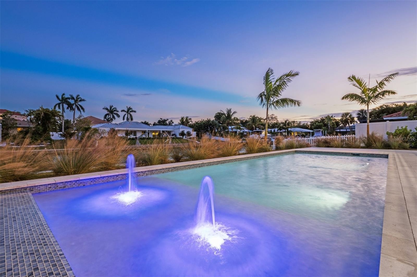 One or more photo(s) has been virtually staged. Experience the ultimate in island living in this brand-new custom built waterfront residence located within the prestigious Country Club Shores community at the south end of Longboat Key. Designed with high performance and easy maintenance in mind, this solid all-block, two-story coastal contemporary residence blends timeless island elegance with state-of-the-art finishes. Spanning nearly 3,800 square feet, the home boasts an open-concept plan offering a seamless flow for entertaining while ensuring privacy for the owners and their guests. Soaring 11 '4 " ceilings highlight the main level with 10-foot sliding glass doors and transom glass over tall casement windows that fill the interiors with natural light. At the heart of the home, a thoughtfully created gourmet kitchen and wet bar are a showpiece, featuring tailor made cabinetry in a fabulous mix of custom-painted thin shaker and rift-cut white oak materials. Mykonos, a stunning polished quartzite, accents the ceiling-height hood, waterfall island countertops, and full-length backsplashes. A luxe Wolf and Sub-Zero appliance suite including a contemporary gas cooktop, twin 30” refrigerator & freezer towers, an 18” wine tower, and an under-counter beverage center creates the perfect setting for effortless entertaining. The first-floor primary suite retreat features a wood slatted tented ceiling with expansive glass windows and direct access to the covered patio. The primary bathroom showcases large-format porcelain tile, textured ribbed wall accents, a relaxing freestanding soaking tub, dual vanities and custom lighting details. An inviting staircase leads to an elevated private study with half bathroom while on the second floor, a spacious game room with full wet bar serves the three additional guest en-suite bedrooms. Anchored along the back is a long covered balcony to enjoy sweeping water views and soft gulf breezes. Modern living is enhanced with Control4 Smart Home automation, keypad lighting, integrated window treatment controls and pre-wired for personalized sound and security systems. Comfort and efficiency are ensured with dual 17 SEER HVAC systems, spray foam insulation, natural gas tankless water heater, ES Low-E impact glass windows and doors, WiFi thermostats, and a pre-planned EV charger line option in the garage. Outside, a lush resort-inspired retreat awaits. A striking 40-foot linear pool with a 12-foot sun shelf and spa shimmers against French-pattern Crema Nova marble decking. The expansive lanai invites alfresco living with generous spaces for dining, lounging, and entertaining, complete with Naturekast outdoor kitchen cabinetry, a 42” gas grill, and an under-counter beverage center. The property is further enhanced by a brand-new seawall with a 28” concrete cap, along with a professionally designed tropical landscape package featuring vibrant plantings, soaring triple Montgomery Palms and stately Coconut Palms. This special opportunity provides an unparalleled lifestyle offering the perfect balance of luxurious modern design with effortless coastal comfort just minutes from the vibrant open-air shopping and dining of St. Armands Circle, the world-class arts and cultural events of downtown Sarasota, and, of course, the island’s spectacular Gulf beaches!
