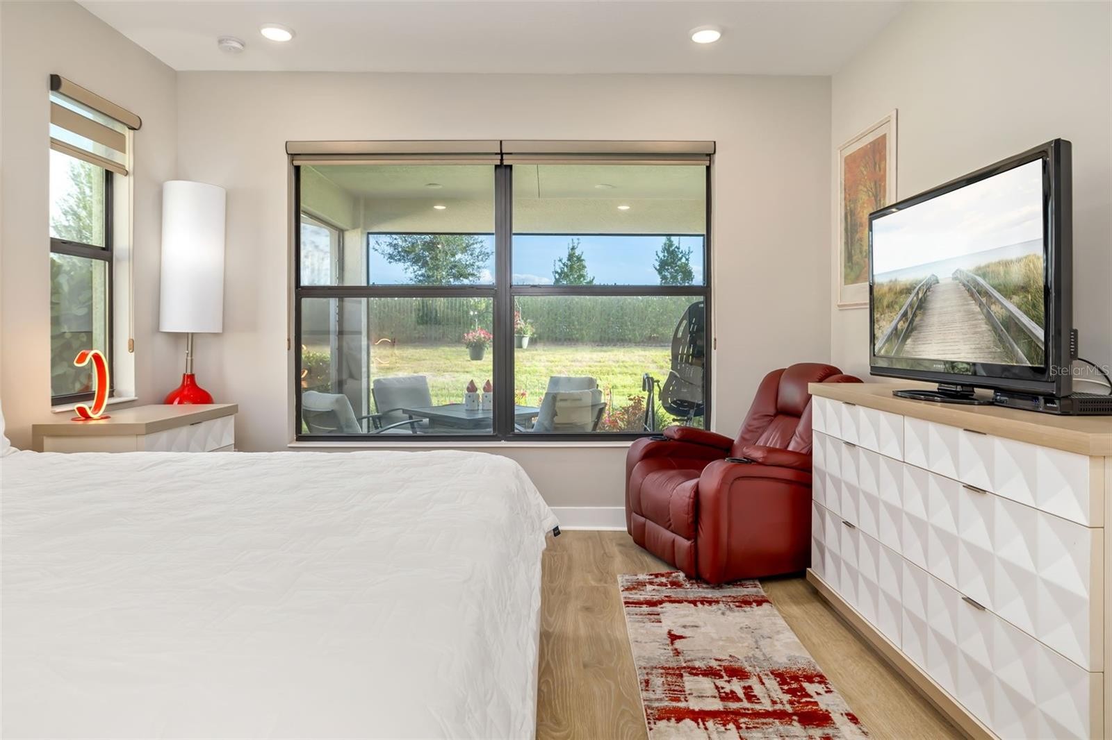 Welcome to a sleek, modern residence in Cresswind at Lakewood Ranch, a premier 55-plus community defined by clean architectural lines and sophisticated design. This 1,852-square-foot home features two bedrooms, two baths, a den, and an open floor plan that enhances functionality and style. The interior showcases a crisp palette of polished white tile and pale walls, with automated window treatments and abundant natural light throughout. The kitchen is designed for seamless integration and visual clarity, offering quartz countertops, high-gloss white cabinetry, an oversized island and a walk-in pantry. The primary suite includes a walk-in closet and a spa-style bath with a walk-in shower accented by a vertical listello. Additional highlights include a den ideal for remote work or media, and a two-car garage with epoxy flooring. Sliding glass doors connect the great room to a spacious screened lanai with stone pavers, ideal for outdoor dining and lounging. Cresswind is a vibrant, amenity-rich community that promotes connection, wellness and leisure through regular resident events, a smart fitness center, resort-style and resistance pools, tennis and pickleball courts, a dog park, and an event plaza hosting food trucks, concerts and social gatherings.