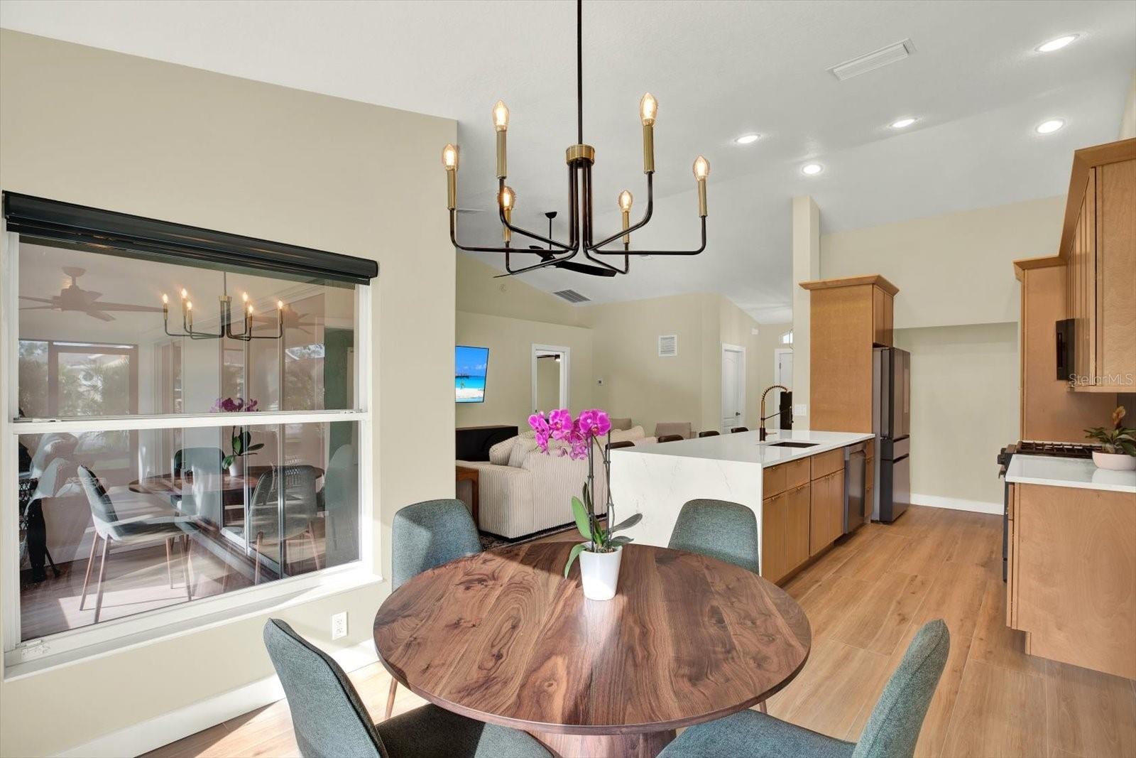 Wake up to panoramic water and fairway views from this fully remodeled 3-bedroom, 2-bath home on a spacious corner lot in a desirable low-fee golf community. Modernized from top to bottom, the residence blends style and peace of mind-every major upgrade has already been done. The 2025 renovations feature a chef-inspired kitchen with slim shaker cabinets, quartz countertops, and premium gas Samsung Bespoke appliances, along with wood plank porcelain tile flooring and two spa-like bathrooms. A new water heater, complete interior and exterior paint, upgraded lighting and fixtures, and a striking mega view lanai enclosure add to the home’s fresh appeal. Roof and AC replacements in 2021 mean buyers won’t need to worry about big-ticket items for years to come. Inside, vaulted ceilings and an open-concept layout fill the living spaces with natural light and create seamless indoor-outdoor flow. The primary suite offers a calming retreat with dual vanities, a walk-in closet, and serene views. Step outside to your covered patio overlooking the lake and golf course, perfect for both entertaining and quiet evenings. Adding to its value, the home sits on an oversized corner lot with added privacy, low HOA dues, and convenient proximity to I-75. Built by La Madison-one of the area’s most respected builders. this property delivers quality construction, thoughtful upgrades, and the lifestyle buyers are looking for.
