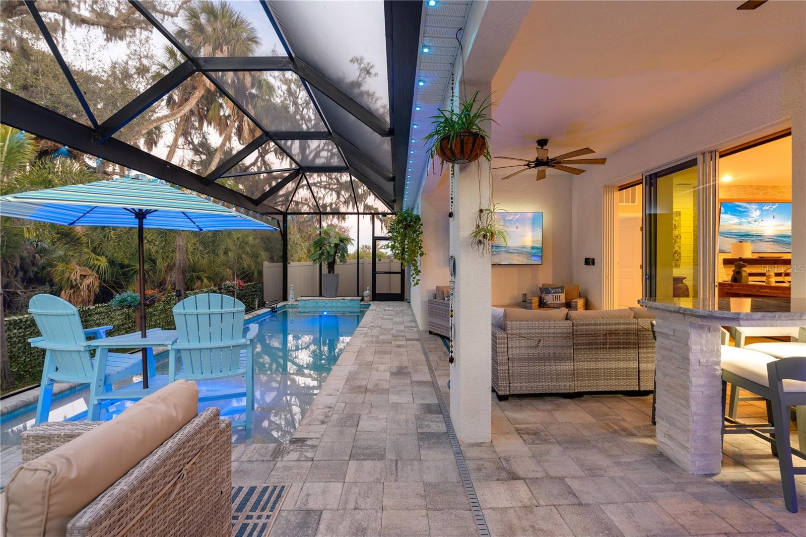 Welcome to this extensively upgraded home tucked away on a CUL-DE-SAC LOT in a NO flood zone. Featuring a popular SPLIT floor plan with HIGH CEILINGS and an open layout, this property blends thoughtful design with over $160,000 in CUSTOM UPGRADES. From the moment you step inside, you’ll notice the abundance of NATURAL light pouring through the front GLASS door and a perfect view of your HEATED SALTWATER POOL as soon as you enter. The bright, airy feel combined with custom finishes truly sets this home apart, and it shows even better in person. The kitchen is beautifully updated with stainless steel appliances, custom BACKSPLASH, and controlled LED LIGHTING above and below the cabinetry, creating the perfect ambiance day or night. The GE stainless refrigerator with interchangeable panels conveys, along with the GE front-load WASHER and DRYER (approximately 6 months new). A whole-house WATER FILTRATION SYSTEM with additional KITCHEN PURIFIER is installed for added quality. Throughout the home you’ll find LVP FLOORING in all bedrooms and closets (lifetime warranty), upgraded nickel-plated faucets and shower fixtures, smart lighting switches, CUSTOM SHOWER GLASS enclosures (no shower curtains), and a fully paid-off ALARM SYSTEM with 6 high-definition CAMERAS and dual monitors. The custom living room feature wall with ELECTRIC FIREPLACE and mantel creates a stunning focal point in the main living area. Major system upgrades include electric automatic zebra BLINDS throughout, a WHOLE-HOME ELECTRIC SURGE PROTECTOR, GUTTERS installed around the entire home, UPGRADED front door and side glass, WIDENED DRIVEWAY, overhead GARAGE CEILING STORAGE, IRRIGATION monitoring with scheduler, and a full irrigation system servicing the ENTIRE YARD. Upgraded and mature landscpaing with rocks. Now let’s talk about the true showstopper, the backyard. Designed for entertaining and year-round Florida living, this outdoor retreat features an amazing POOL with LIFETIME WARRANTY on interior pool walls, brick pavers, a HUGE PICTURE SCREEN POOL CAGE view, and 360-degree Govee LED ENTERTAINMENT LIGHTING including the pool enclosure (app controlled). The fully equipped OUTDOOR KITCHEN includes a built-in propane GRILL with flat top cooking surface, REFRIGERATOR, and BUILT-IN iISLAND SEATING making it the perfect space for hosting gatherings, weekend cookouts, or relaxing evenings outdoors. The extended paved patio, concrete side entry for pool equipment, and FULLY FENCED yard with GATES on BOTH sides provide privacy, functionality, and space to truly enjoy. Located in a friendly community with amenities including a pool, playground, and dog park, this move-in-ready home is just minutes from I-75, Ellenton Premium Outlets, Bradenton, the Skyway Bridge, and some of Florida’s best beaches. This home truly has it all.