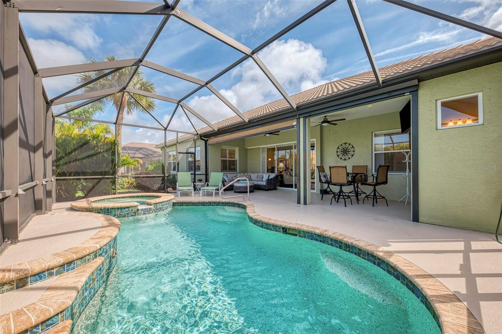 This spectacular home was once the Builder's Model and shows beautifully. There are extra features with crown moldings, trim work, wooden beams, laminated wood flooring along with a golf and lakeview. The open floor plan is lovely for entertaining with a great room opened to the kitchen and formal dining room. The spacious eat-in kitchen has an island and walk-in pantry with granite and stainless appliances. There is a study set privately with French doors for those quiet moments. The Primary Bedroom is spacious with two walk-in closets and a luxurious bath with dual sinks and tile walk-in shower. The other two bedrooms and bath are situated privately for family and guests. The inviting pool and spa along with a great sized lanai makes relaxing so wonderful. The seller has done so many improvements since ownership which includes Exterior and interior painting, a remote Kevelar storm screen on the lanai, newer HVAC and hot Water Heater, Generator Outlet, Primary Bedroom frameless shower door and plank tile flooring and so much more. Sawgrass is such a lovely community, centrally located within minutes to downtown Venice and Venice Beach along with Interstate 75 and Sarasota Memorial Hospital. This is part of the golf community of Golf in Venice which is not mandatory. The clubhouse has a wonderful community pool, fitness, pickleball courts and a great social calendar! There is no CDD and Low HOA fees. Truly a place to call home!