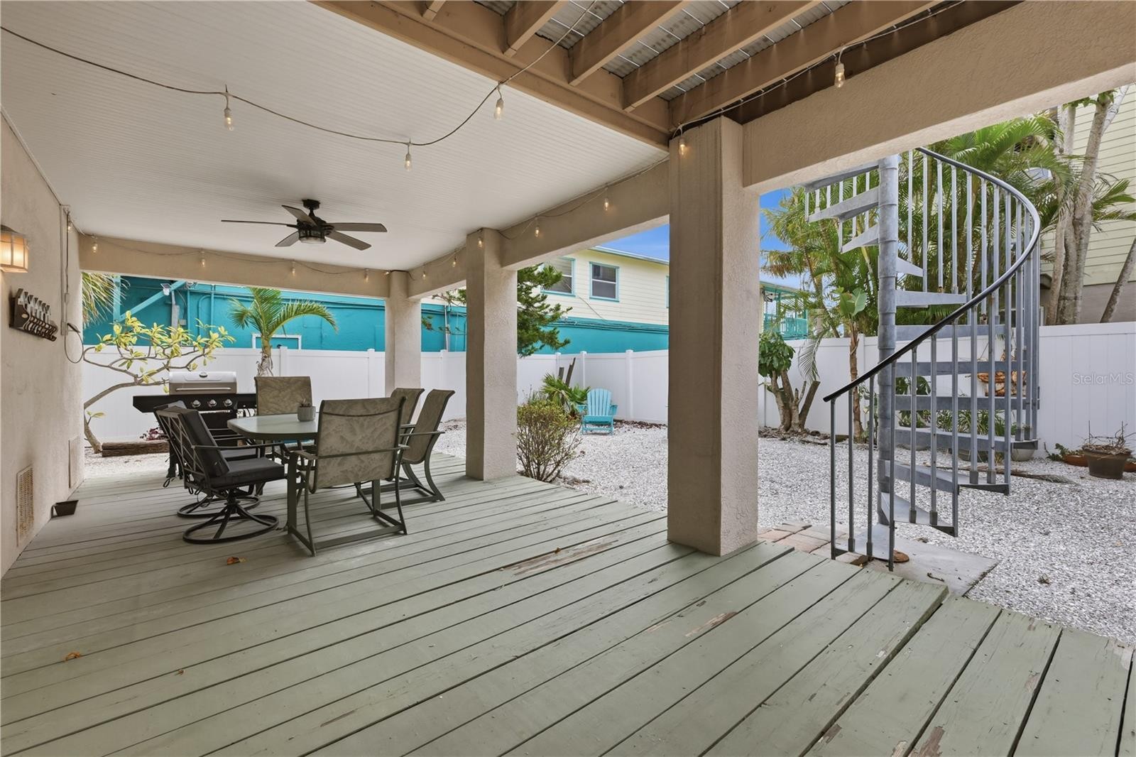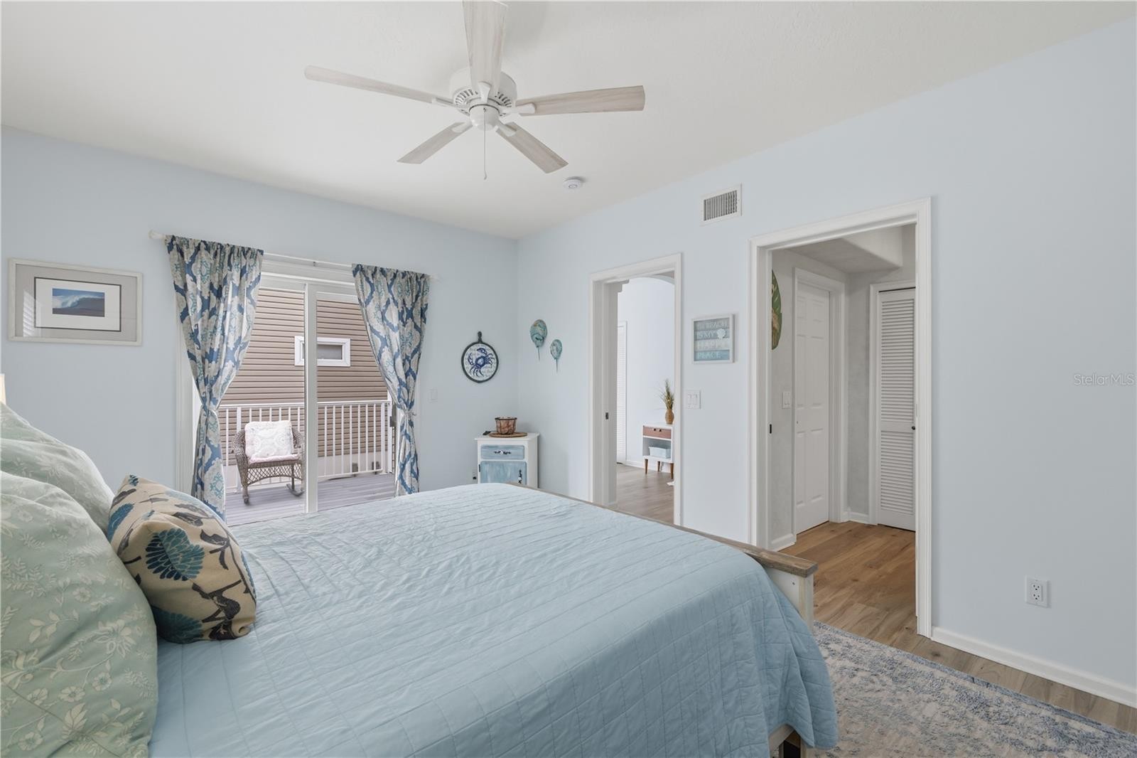 Just steps from the sugar white sands of the Gulf, this elevated coastal retreat captures the essence of relaxed beachside living with the comfort of thoughtful design. Bright, airy interiors welcome you with an open concept layout where the living area flows seamlessly into a charming kitchen featuring stainless steel appliances, beadboard cabinetry, and soft coastal hues that mirror the shoreline just beyond. The star of the home is the massive primary suite, perched privately on the top level with soaring ceilings, generous space for lounging or a reading nook, and an ensuite bath with a soaking tub and a walk-in shower. A second bedroom and a flexible den or office add versatility to the layout, easily adapting to your lifestyle needs. Step outside to a breezy balcony nestled among swaying palms, perfect for morning coffee or winding down after a day at the beach. Low maintenance tropical landscaping sets the tone for effortless island living, and the oversized garage offers ample room for all your beach gear. Whether you're seeking a full time residence, winter escape, or a dreamy vacation rental, this home delivers endless potential in an unbeatable location.