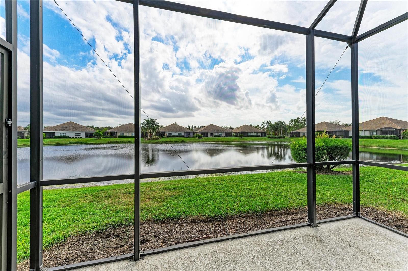 An exceptional opportunity to own a MOVE-IN ready, LAKEFRONT villa, where waterfront premium homes are rarely available. Located in the gated Fairfield community by Neal Communities, this beautifully maintained residence offers resort-style amenities including a pool, recreation center, and fitness facility just moments away. A charming covered front porch sets the tone, while the extended screened lanai captures tranquil lake views and features a gas hookup, perfect for grilling, morning coffee, or evening unwinding. Inside, the bright, open floor plan showcases tile flooring, volume ceilings, and a tray-ceiling living area enhanced by recessed lighting, a ceiling fan, and three glass sliders that blur the line between indoor and outdoor living. The kitchen offers granite countertops, a large center island with stylish pendant lighting, double-basin sink, and GE slate fingerprint-resistant appliances, including a gas range and newer dishwasher (2023), plus dining area has a new chandelier (2026). The primary suite is a peaceful retreat offering lake views, laminate flooring, a ceiling fan, dual closets, and an en-suite bath with dual vanities and a walk-in shower. A comfortable guest bedroom offers privacy towards the front of the home, laminate flooring and a walk-in closet, while the den/office, also with Engineered hardwood flooring, provides flexible space for work or relaxation. Additional features include a Culligan water softener, newer HVAC (2024), fully refreshed with all new interior paint (2026), an interior laundry room with upper storage cabinets, and front loader washer and dryer on storage pedestals are included. The 2-car garage has an overhead storage rack and built-in upper cabinets for your storage needs, and hurricane panels for all openings for added peace of mind. With a low HOA fee, no CDD fee, and maintenance assisted grounds included, this residence is ideal as a full-time home or an effortless Florida retreat. Perfectly situated just west of I-75 and south of downtown Bradenton, you’re minutes from shopping, dining, parks, golf courses, the Braden River Library, and the Gulf beaches. Offering the space and comfort of a single-family home, this twin villa features one of the largest floor plans in the community.
