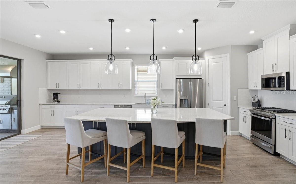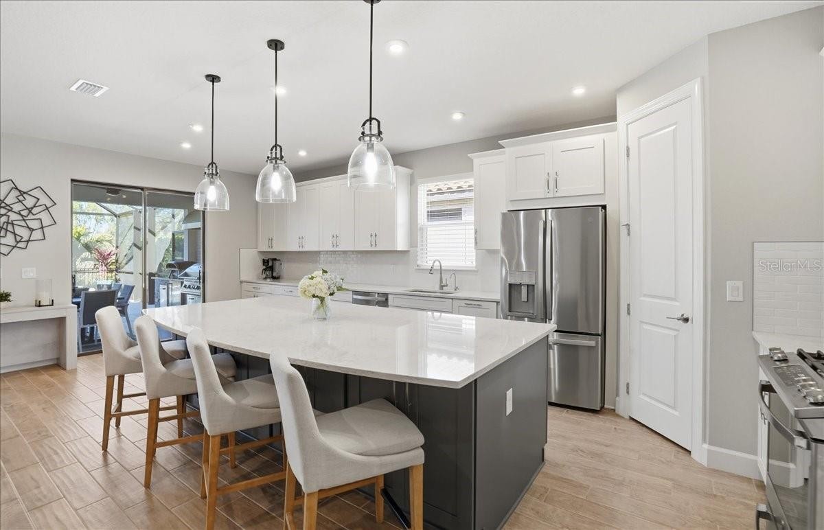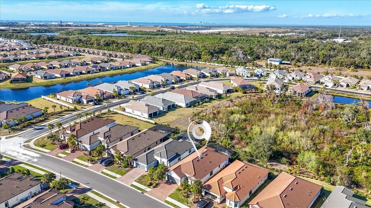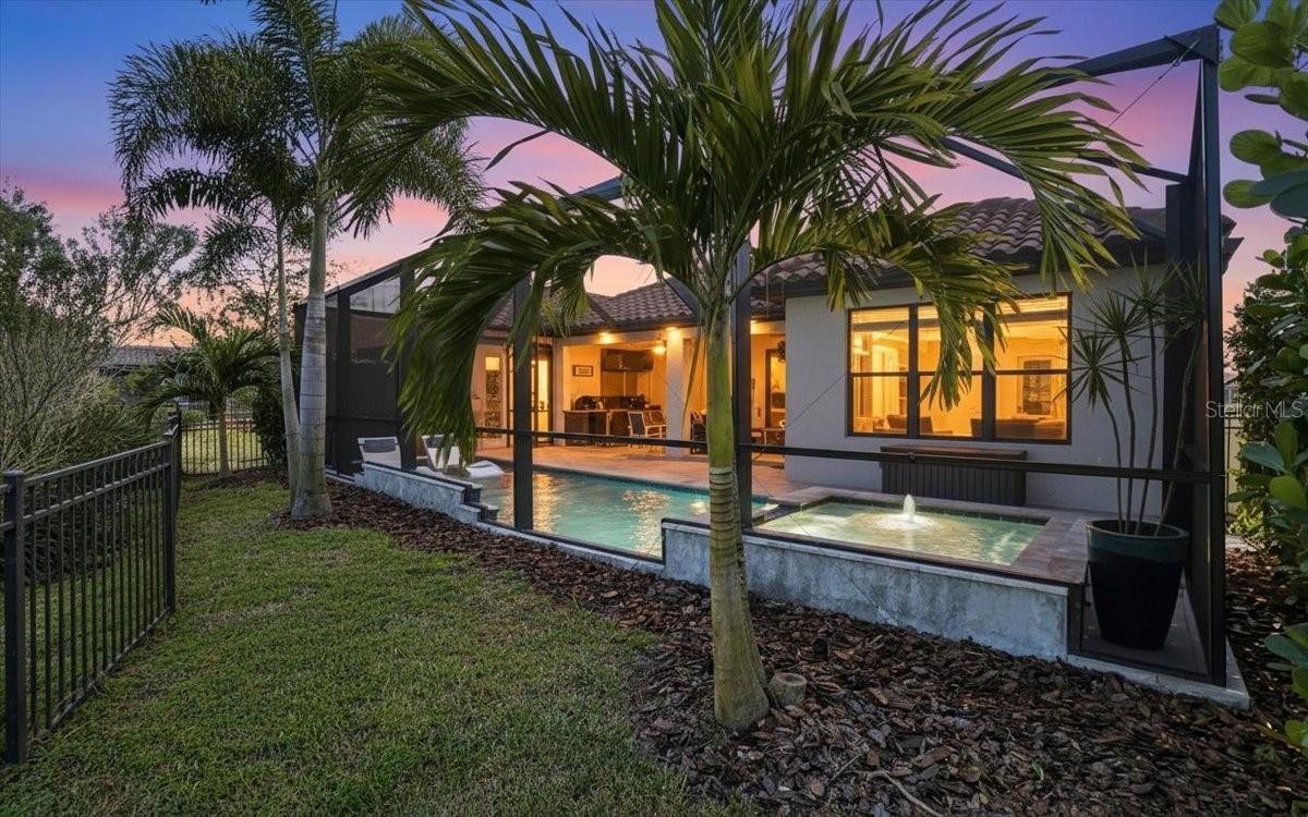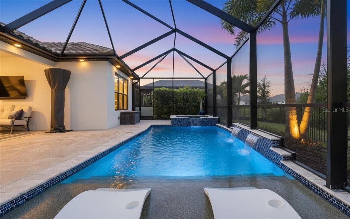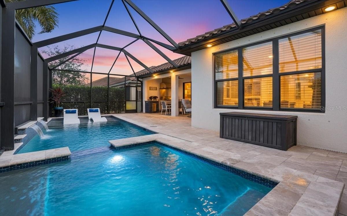 Welcome to this Taylor Morrison Lazio model (3/3 plus den) in the highly desirable Esplanade of Artisan Lakes, in north Manatee County. This spacious floor plan features 3 bedrooms, 3 bathrooms, and a den with an open-concept living area, that looks out to a large outdoor living area. The home has 10’ ceilings, 8’ doors and wood-grain tile throughout the main living areas. The expansive outdoor area features a TV viewing area, an outdoor kitchen and a pool and spa. A lush preserve beyond the lanai area complements the landscaping and creates a tranquil and private oasis. The beautiful saltwater pool and spa is heated and features twin waterfalls, a sunning shelf, changing color LED lighting, and a very durable Pebble Tec finish. The outdoor kitchen has been thoughtfully designed with a grill vented to the outside, a refrigerator, a prep sink and quartz countertops. This wonderful outdoor area has travertine pavers and is surrounded by No-see-um screening. At the heart of the home is the extended kitchen with beautiful quartz countertops and upgraded cabinetry. There is plenty of room for a kitchen table and/or you can dine at your kitchen island. There is a spacious walk-in pantry, some pull-out shelving in the cabinets and under mount lighting. The dining area features a custom built-in bar/beverage area with seating. There is a double-door wine frig, a wine rack and quartz countertops. With built-in speakers in the main living area this home really is a wonderful home for you and your guests to enjoy! The owner’s suite offers a peaceful retreat with an en-suite bathroom. The spacious walk-in closet has beautifully designed built-ins to help you stay organized! The bathroom has dual vanities, a gorgeous seamless glass walk-in shower and a private water closet. The split floor plan has two additional bedrooms located at the front of the home. Bedroom 2 is adjacent to a full bathroom that has a tub/shower. Bedroom 3 has a closet with built-ins and an en-suite bathroom with a walk-in shower. The den/office has pocket doors and a built-in queen-sized Murphy bed; perfect for your overnight guests. The laundry room has upper and lower cabinets with a sink and quartz countertops. The 2-car garage has an epoxy floor finish and the driveway has been widened to allow ample parking room for two vehicles and walking room for visitors. In addition, LED landscape lighting has been added to the front and back of the house. This home has been immaculately cared for and lovingly maintained. It is truly a move-in ready home inside and out! The Esplanade of Artisan Lakes is a gated resort community offering two pools, a resistance pool, and two hot tubs. There are two amenity centers, dog parks,, pickleball and tennis programs and classes, along with special interest groups and clubs. The wellness program includes strength and cardio equipment, fitness classes, personal training and water aerobics. Enjoy the spa services, social events, wine tastings, cooking experiences and arts and crafts. Yard maintenance, irrigation, cable and internet/wifi are also included with your HOA dues. The Esplanade is located between Hwy. 41 and I-75 from Moccasin Wallow Rd. This is a growing area with shopping, dining and a new hospital being built just a couple of miles away. Beautiful beaches at Siesta Key, Anna Maria Island and St. Petersburg can all be reached in under an hour.