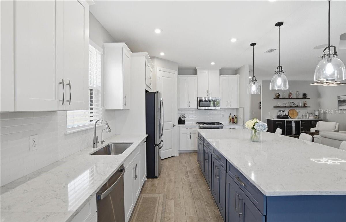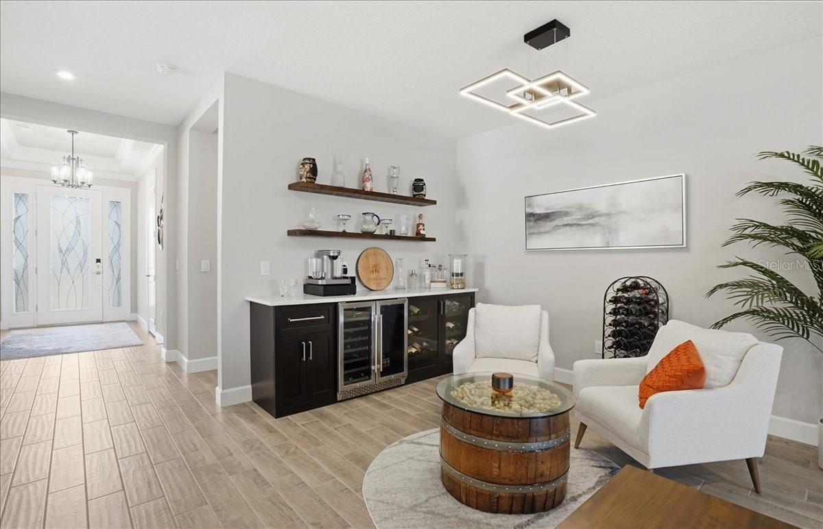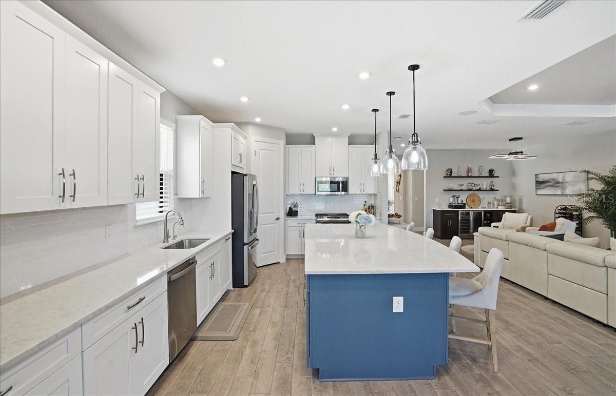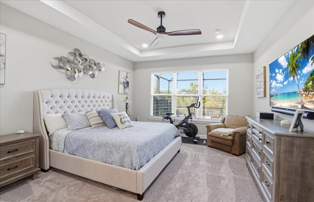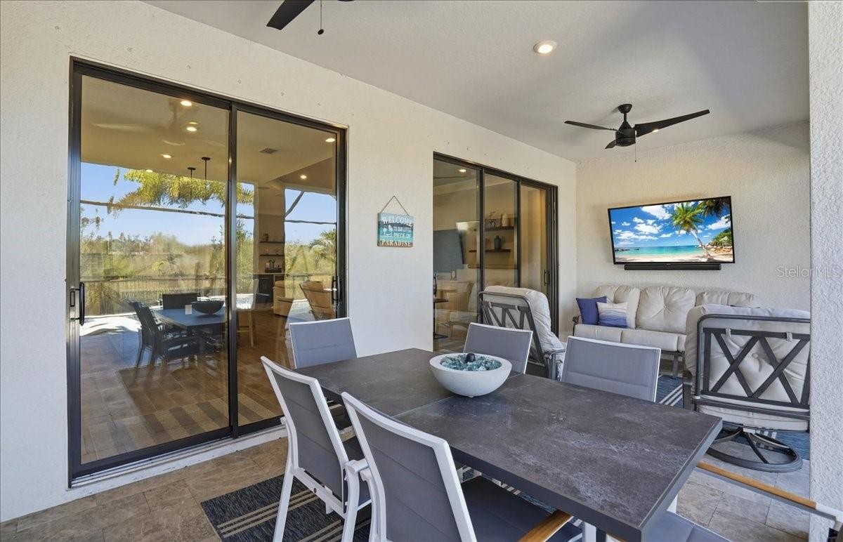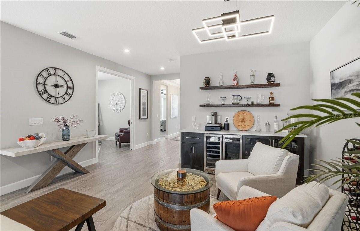Welcome to this Taylor Morrison Lazio model (3/3 plus den) in the highly desirable Esplanade of Artisan Lakes, in north Manatee County. This spacious floor plan features 3 bedrooms, 3 bathrooms, and a den with an open-concept living area, that looks out to a large outdoor living area. The home has 10’ ceilings, 8’ doors and wood-grain tile throughout the main living areas. The expansive outdoor area features a TV viewing area, an outdoor kitchen and a pool and spa. A lush preserve beyond the lanai area complements the landscaping and creates a tranquil and private oasis. The beautiful saltwater pool and spa is heated and features twin waterfalls, a sunning shelf, changing color LED lighting, and a very durable Pebble Tec finish. The outdoor kitchen has been thoughtfully designed with a grill vented to the outside, a refrigerator, a prep sink and quartz countertops. This wonderful outdoor area has travertine pavers and is surrounded by No-see-um screening. At the heart of the home is the extended kitchen with beautiful quartz countertops and upgraded cabinetry. There is plenty of room for a kitchen table and/or you can dine at your kitchen island. There is a spacious walk-in pantry, some pull-out shelving in the cabinets and under mount lighting. The dining area features a custom built-in bar/beverage area with seating. There is a double-door wine frig, a wine rack and quartz countertops. With built-in speakers in the main living area this home really is a wonderful home for you and your guests to enjoy! The owner’s suite offers a peaceful retreat with an en-suite bathroom. The spacious walk-in closet has beautifully designed built-ins to help you stay organized! The bathroom has dual vanities, a gorgeous seamless glass walk-in shower and a private water closet. The split floor plan has two additional bedrooms located at the front of the home. Bedroom 2 is adjacent to a full bathroom that has a tub/shower. Bedroom 3 has a closet with built-ins and an en-suite bathroom with a walk-in shower. The den/office has pocket doors and a built-in queen-sized Murphy bed; perfect for your overnight guests. The laundry room has upper and lower cabinets with a sink and quartz countertops. The 2-car garage has an epoxy floor finish and the driveway has been widened to allow ample parking room for two vehicles and walking room for visitors. In addition, LED landscape lighting has been added to the front and back of the house. This home has been immaculately cared for and lovingly maintained. It is truly a move-in ready home inside and out! The Esplanade of Artisan Lakes is a gated resort community offering two pools, a resistance pool, and two hot tubs. There are two amenity centers, dog parks,, pickleball and tennis programs and classes, along with special interest groups and clubs. The wellness program includes strength and cardio equipment, fitness classes, personal training and water aerobics. Enjoy the spa services, social events, wine tastings, cooking experiences and arts and crafts. Yard maintenance, irrigation, cable and internet/wifi are also included with your HOA dues. The Esplanade is located between Hwy. 41 and I-75 from Moccasin Wallow Rd. This is a growing area with shopping, dining and a new hospital being built just a couple of miles away. Beautiful beaches at Siesta Key, Anna Maria Island and St. Petersburg can all be reached in under an hour.