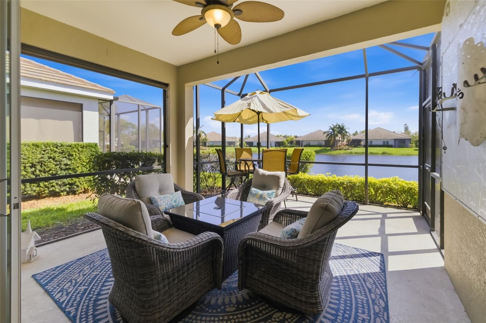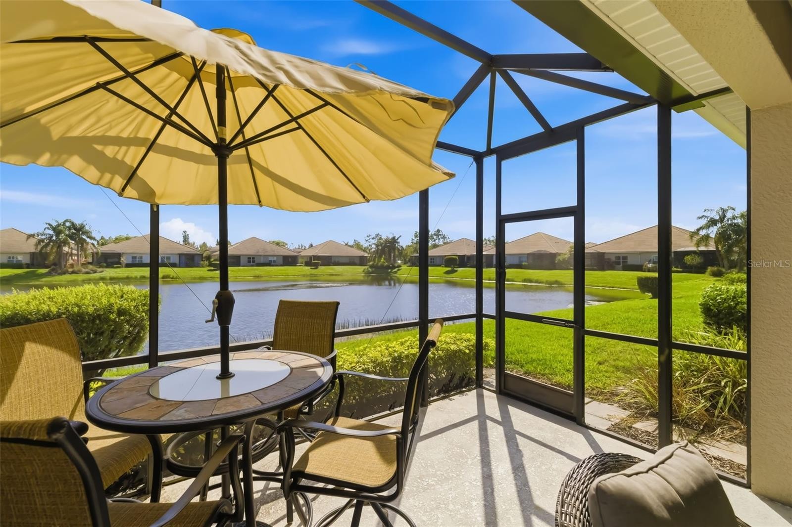 Experience low maintenance Florida living in this beautifully maintained rare lakefront villa in the desirable Fairfield community by Neal Communities in Bradenton. From the moment you step inside, the home feels bright, welcoming, and open, with an airy floor plan featuring 16” tile flooring and tray ceilings throughout. Just off the entry, a custom built-in feature wall creates an elegant focal point for what is currently used as a formal dining area, while offering flexibility to easily convert the space into a den, office, or additional living area to suit your needs. Designed for effortless Florida living, large sliding glass doors from the living area open to an extended screened lanai where peaceful lake views create the perfect backdrop for morning coffee, outdoor dining, or simply relaxing and enjoying the view. The kitchen sits at the heart of the home and is ideal for both everyday living and entertaining, offering stainless steel appliances, granite countertops, a generous center island, and abundant cabinetry. The spacious owner’s suite overlooks the tranquil lake and features walk-in closets and an en-suite bath with dual vanities, a large walk-in shower, and a private water closet. Additional highlights include a 2-car attached garage and a newer HVAC system replaced in 2024, providing comfort and peace of mind. Residents of Fairfield enjoy access to wonderful community amenities including a heated pool and spa, cabanas, and a well-equipped fitness center. The location is equally convenient, with easy access to downtown Bradenton, the Riverwalk along the Manatee River, beautiful Gulf beaches, Tampa and St. Petersburg, shopping, dining, and several championship golf courses. Schedule your private showing and experience the comfort and lifestyle this lakefront villa has to offer.