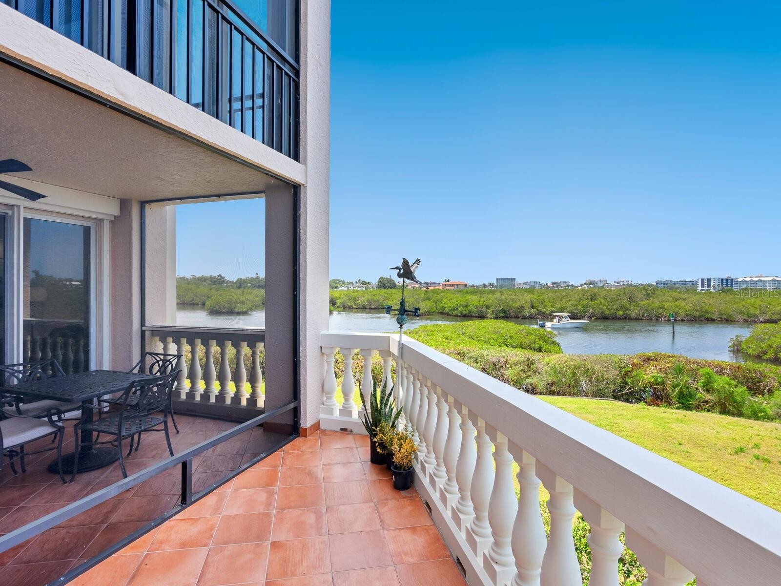 Simply the best Eagles Point location- it is all about the light and the view. Every room in this 3 bed, 2 bath condo enjoys a water view. This corner condo boasts both a southern exposure overlooking Phillippi Creek and western exposure of the Intracoastal Waterway and Siesta Key. You will easily pass your time and be captivated watching fish jump, birds dive, and boaters go by. This condo is positioned for privacy- you do not look into any nearby buildings. Reflect on your day watching the sunset- moments of pure awe with such stunning colors. The first floor condos are unique with an expanded open terrace. A portion of this terrace has been screened for added enjoyment. A rare feature for an Eagles Point condo is a second under building car spot- no need to leave your second vehicle outside in the elements. HVAC, Hot Water Tank, Washer & Dryer are new. Hurricane shutters on western facing windows The Landings is a gated community known for its well-maintained grounds, nature trail to the ICW, and desirable amenities. Eagles Point residences have their own pool and barbecue area nearby as well as membership to the Landings Racquet Club which offers a fitness center, eight har-tru tennis courts, pickle ball, pool with spa, and numerous social activities. Kayak storage with launch area for easy access to the waterway is yet another feature. Take a look- easy to show.