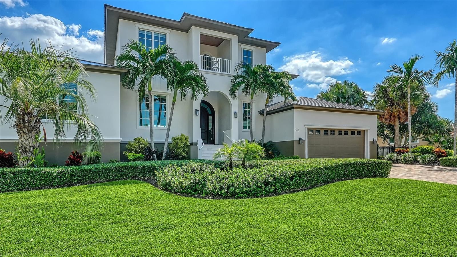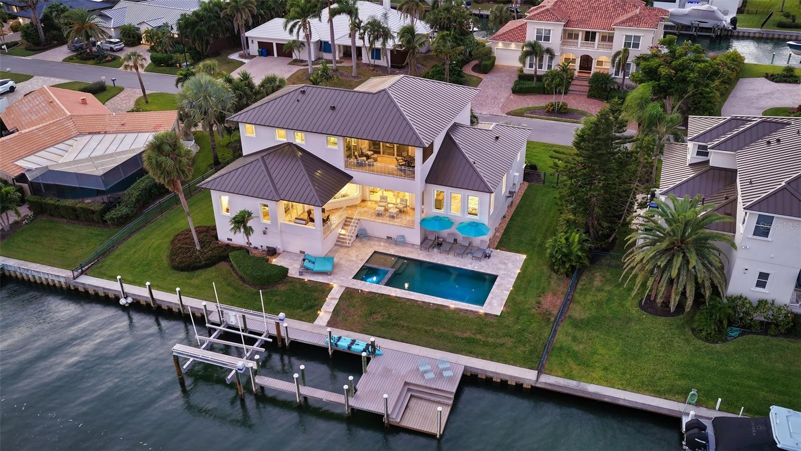This exquisite home is sure to exceed expectations! This exceptional 4 bed/5 bath canal-front estate is located in coveted Country Club Shores, where chic architecture, thoughtful craftsmanship, and effortless coastal luxury converge. Designed by DSDG architects to maximize the contemporary sightlines and southern exposure, this Voight built custom residence offers a spectacular open floor plan and is positioned just three lots from the open waters of Sarasota Bay. This extraordinary residence is better-than-new with a freshly installed metal roof, AC systems, and whole home generator and has been impeccably maintained. The home has been built to effortlessly withstand the Florida coastal environment while maintaining its magnificent beauty and clean lines. Boaters will appreciate the Trex dock equipped with a 20,000-lb boat lift, kayak and paddleboard racks, and convenient launch deck - providing quick, easy access to bay and Gulf waters. Inside, the home is both stunning and impressive with exquisite finishings and custom millwork. The first-floor owner’s suite is a luxurious retreat highlighted by soaring triple-coffered tray ceilings, tranquil views, and private pool access for a midnight swim. The spa-like bathroom is pure luxury. The chef’s kitchen is a true showpiece, featuring Viking appliances, a Sub-Zero Pro refrigerator, a walk-in pantry, expansive countertops, and a dramatic 14-foot quartz island perfect for large gatherings. The integrated dining area is framed by an aquarium window which emphasizes the tranquil water views. The family room is a natural extension of the kitchen and provides a generous area with direct access to the lanai, grille and dining areas and is perfect for enjoying movies, or just gathering with friends and family. The great room is spacious with large archways, gas fireplace, custom built-in shelving, and coffered shiplap ceilings which add to the drama of this cozy but elegant space. A wall of windows provides access to the covered lanai area and expands the feeling of openness highlighting the pool, sparkling spa, and water views. The second floor has been completely reimagined to elevate both style and function, offering three private guest suites, a versatile and spacious Florida room, wet bar, and a 300+ bottle state-of-the-art walk-in wine cellar. The enclosed upper lanai enhances ambiance and panoramic views. The Florida room provides a flexible space for enjoying sporting events or wine tastings, and includes a full bath for convenience. The 3 bedrooms on the second level are generous in size and 2 of the 3 include ensuite baths. Outdoor living is equally exceptional. The lanai with a Cypress-clad ceiling includes a new grill and dining area and pool bath, which steps down to the saltwater pool, spa, and sun deck - an ideal setting for entertaining or enjoying sunshine year-round. Additional features include a two-car garage with generous overhead storage, a rear enclosed storage compartment, and an electric vehicle charger. There is ample vertical height in the garage to add a car lift as an option. Residents of Country Club Shores enjoy private deeded beach access to the Gulf of Mexico, with optional golf and tennis memberships available at the nearby Resort at the Longboat Key Club. This is waterfront living at its finest - refined, relaxed, and designed to be enjoyed. A must-see property to fully appreciate the exceptional lifestyle, upgrades, and craftsmanship throughout.