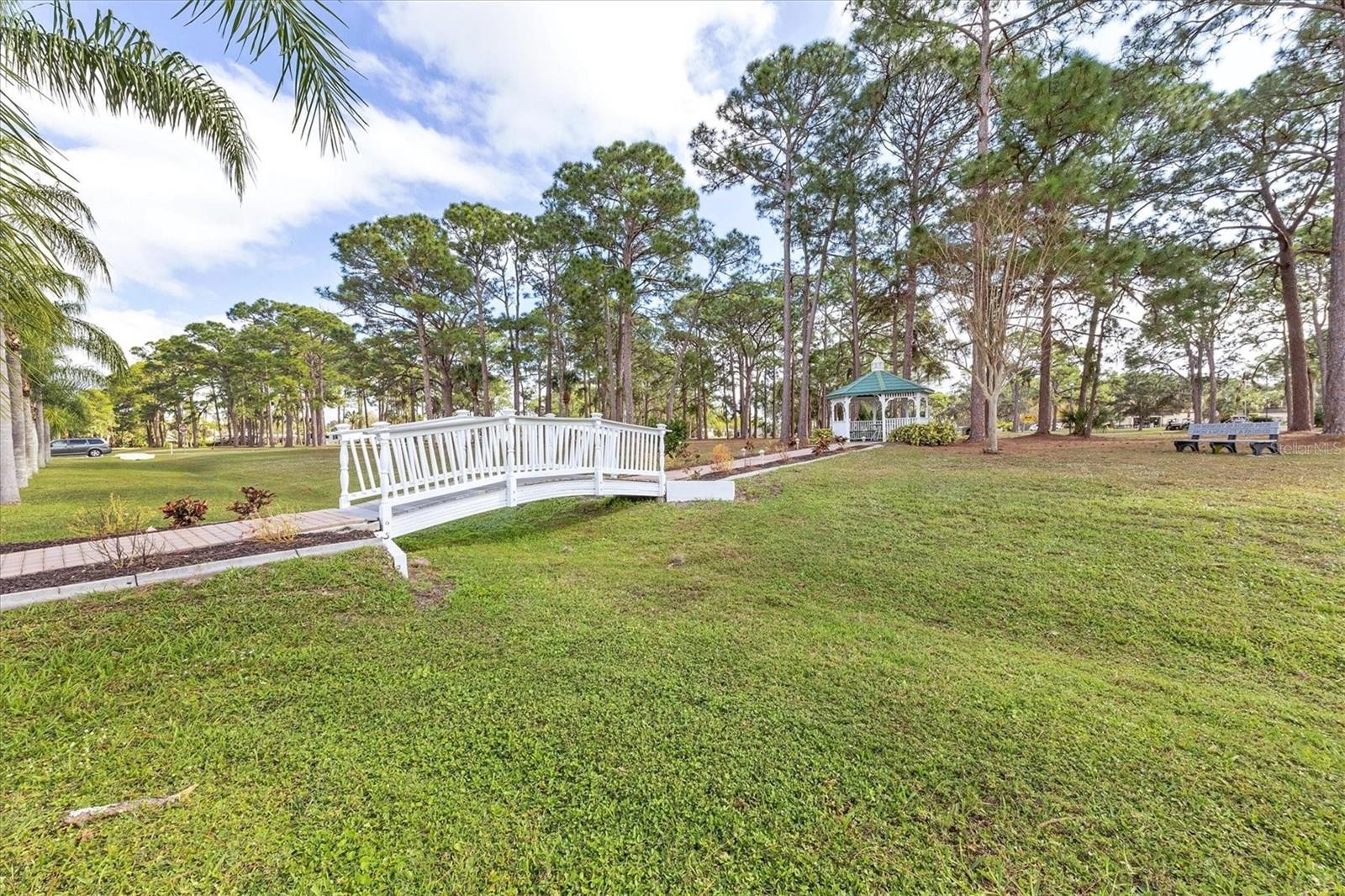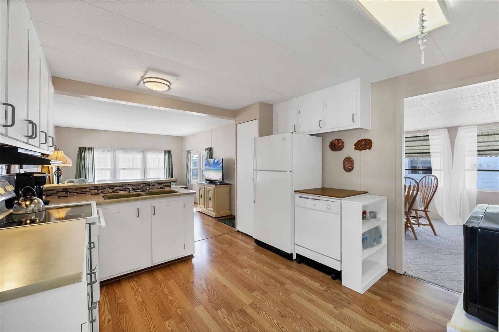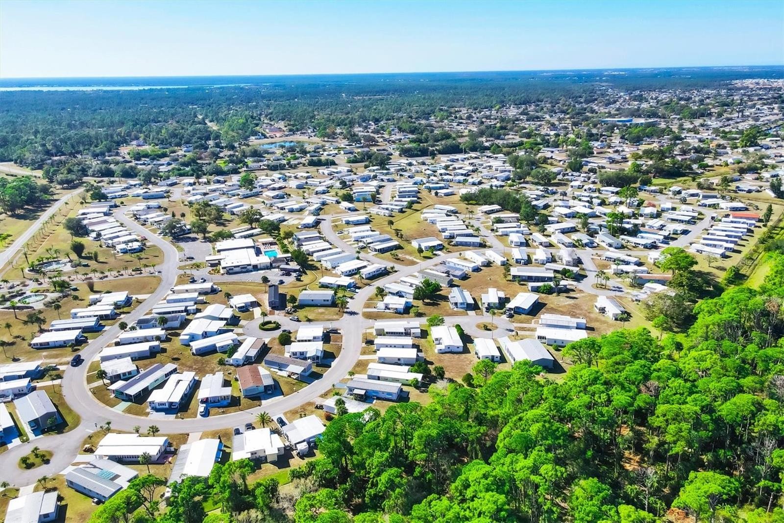 Located in Holiday Park, where you own your lot, take a look at this 2 bedroom, 2 full baths, beautifully maintained, turnkey home located in a desirable 55+ gated community. A welcoming screened lanai invites you to enjoy morning coffee, evening relaxation, or casual entertaining. Inside, you’ll find a freshly painted interior and an open-concept living and kitchen area. The bright white kitchen features oil-rubbed bronze fixtures, updated lighting, a stylish backsplash, a breakfast bar, a portable dishwasher, and a sunny garden window. The spacious primary bedroom is next to a full bath with indoor laundry, while the opposite side of the home offers a generous dining area, a flexible guest bedroom/den, and a guest bath with a walk-in shower. Abundant storage and an attached shed add convenience. This is a golf cart friendly community, with its HOA fees conveniently included in the annual tax bill, covering lawn care and trash service. Enjoy resort-style amenities including two clubhouses, two heated pools, pickleball, tennis, bocce, a fitness center, and a full calendar of social activities. Move right in and enjoy the easy, active lifestyle you’ve been waiting for in your own piece of paradise.
