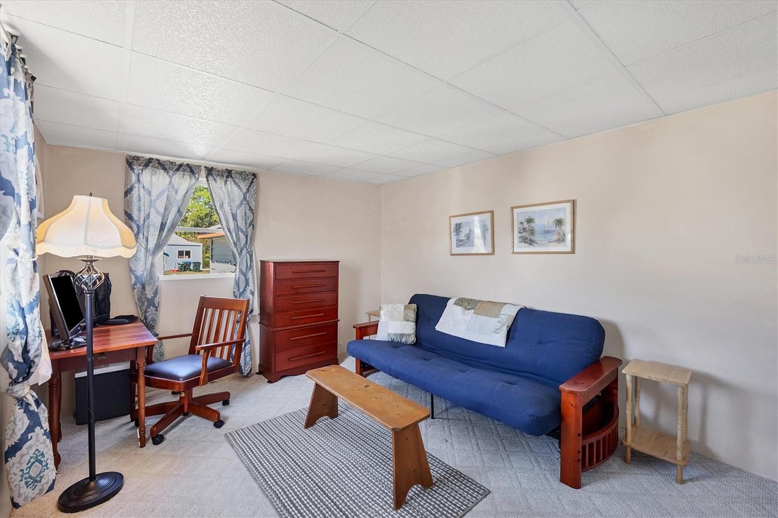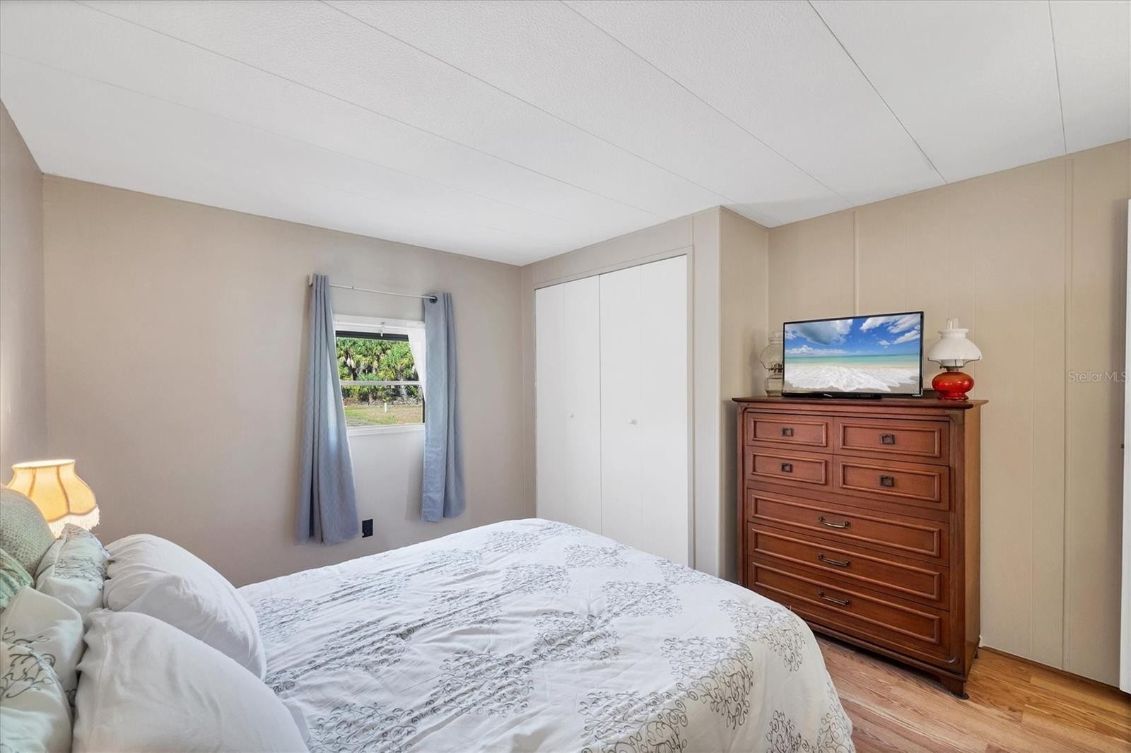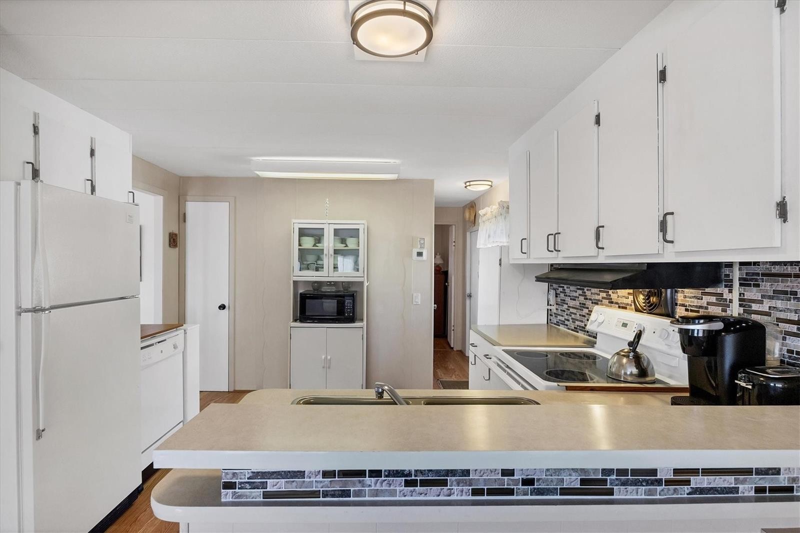 Located in Holiday Park, where you own your lot, take a look at this 2 bedroom, 2 full baths, beautifully maintained, turnkey home located in a desirable 55+ gated community. A welcoming screened lanai invites you to enjoy morning coffee, evening relaxation, or casual entertaining. Inside, you’ll find a freshly painted interior and an open-concept living and kitchen area. The bright white kitchen features oil-rubbed bronze fixtures, updated lighting, a stylish backsplash, a breakfast bar, a portable dishwasher, and a sunny garden window. The spacious primary bedroom is next to a full bath with indoor laundry, while the opposite side of the home offers a generous dining area, a flexible guest bedroom/den, and a guest bath with a walk-in shower. Abundant storage and an attached shed add convenience. This is a golf cart friendly community, with its HOA fees conveniently included in the annual tax bill, covering lawn care and trash service. Enjoy resort-style amenities including two clubhouses, two heated pools, pickleball, tennis, bocce, a fitness center, and a full calendar of social activities. Move right in and enjoy the easy, active lifestyle you’ve been waiting for in your own piece of paradise.