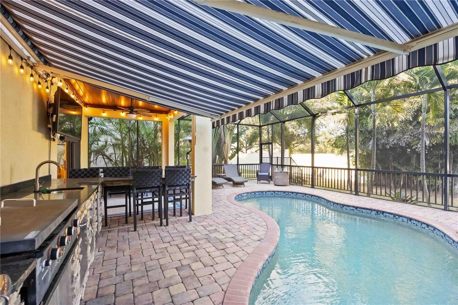 Luxury, lifestyle, and location come together in this stunningly upgraded 5-bedroom, 4.5-bath residence located in the gated community of Legends Bay. Perfectly positioned near Sarasota Bay, IMG Academy, and world-famous Gulf beaches, this home offers the ideal blend of elegance, comfort, and resort-style living. Step inside the soaring two-story foyer to discover refined interiors filled with natural light, engineered hardwood and tile flooring, and detailed craftsmanship throughout. The open-concept design features three private en-suite bedrooms—including a first-floor guest suite—a den, and a formal dining room. The gourmet kitchen is a standout, boasting a natural gas cooktop, premium Bosch & Miele appliances, upgraded fixtures, abundant cabinetry, and a built-in beverage center. The primary suite provides a luxurious retreat with a custom-designed closet and spa-inspired bath. Additional upgrades include refreshed lighting, modern ceiling fans, and a thoughtfully updated interior that feels warm, elevated, and move-in ready. Your private outdoor oasis is designed for relaxation and entertaining. Enjoy a resurfaced saltwater pool, newly added spa with remote automation, a new pool cage, and an expansive outdoor kitchen with stone accents, granite counters, bar seating, a refrigerator, Blackstone griddle, and Green Egg-style smoker—all overlooking a peaceful, private setting. Legends Bay offers premier amenities including a resort-style pool, clubhouse, and a scenic boardwalk leading to a fishing pier on Sarasota Bay. The maintenance-free lot provides lawn care and irrigation, making this a perfect lock-and-leave property. Minutes to IMG Academy, downtown Sarasota, Bradenton, and Gulf beaches—this exceptional home captures the essence of coastal luxury living.