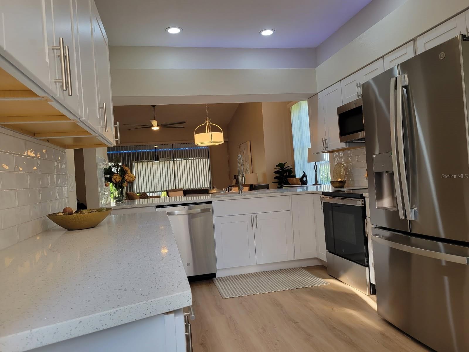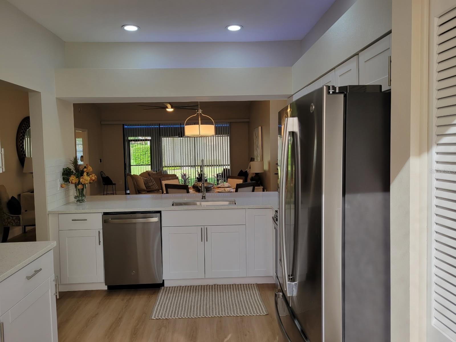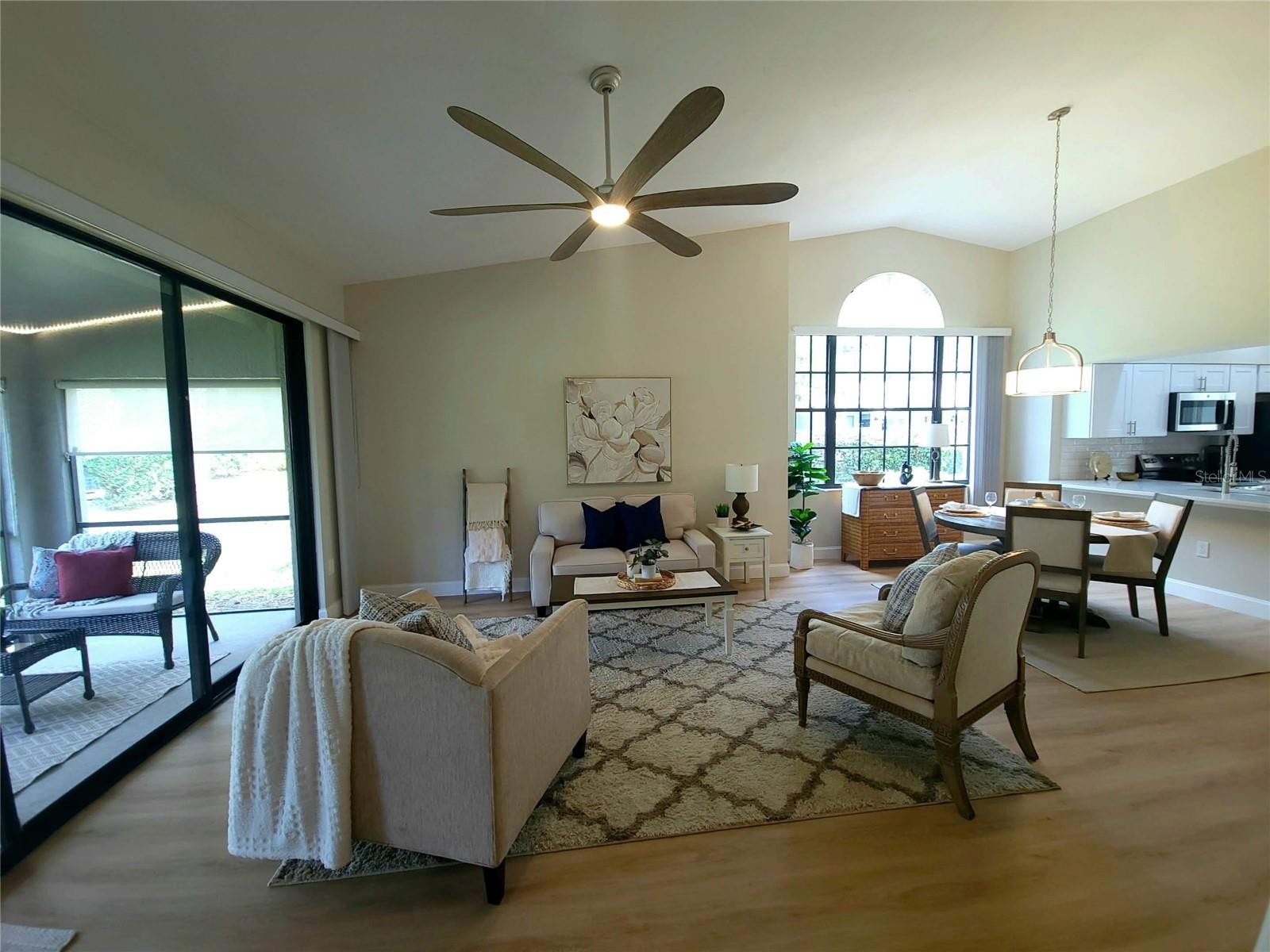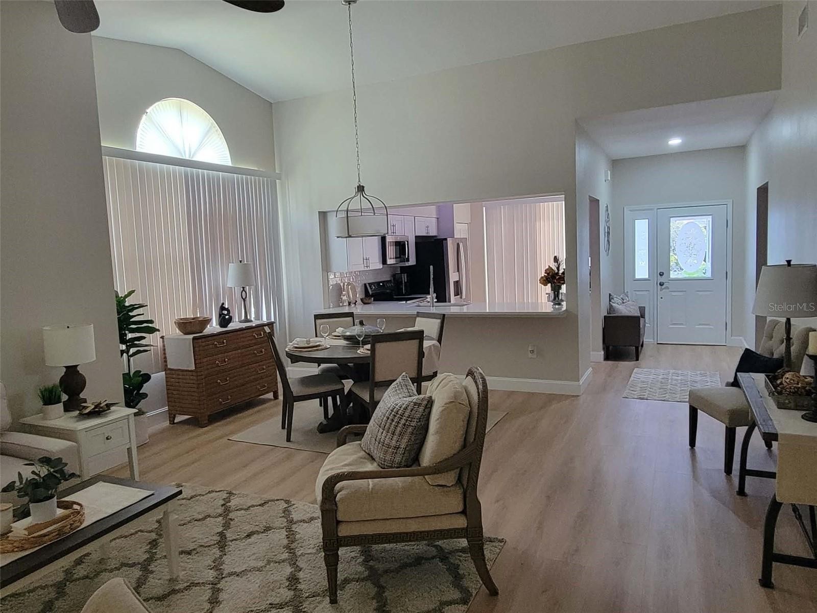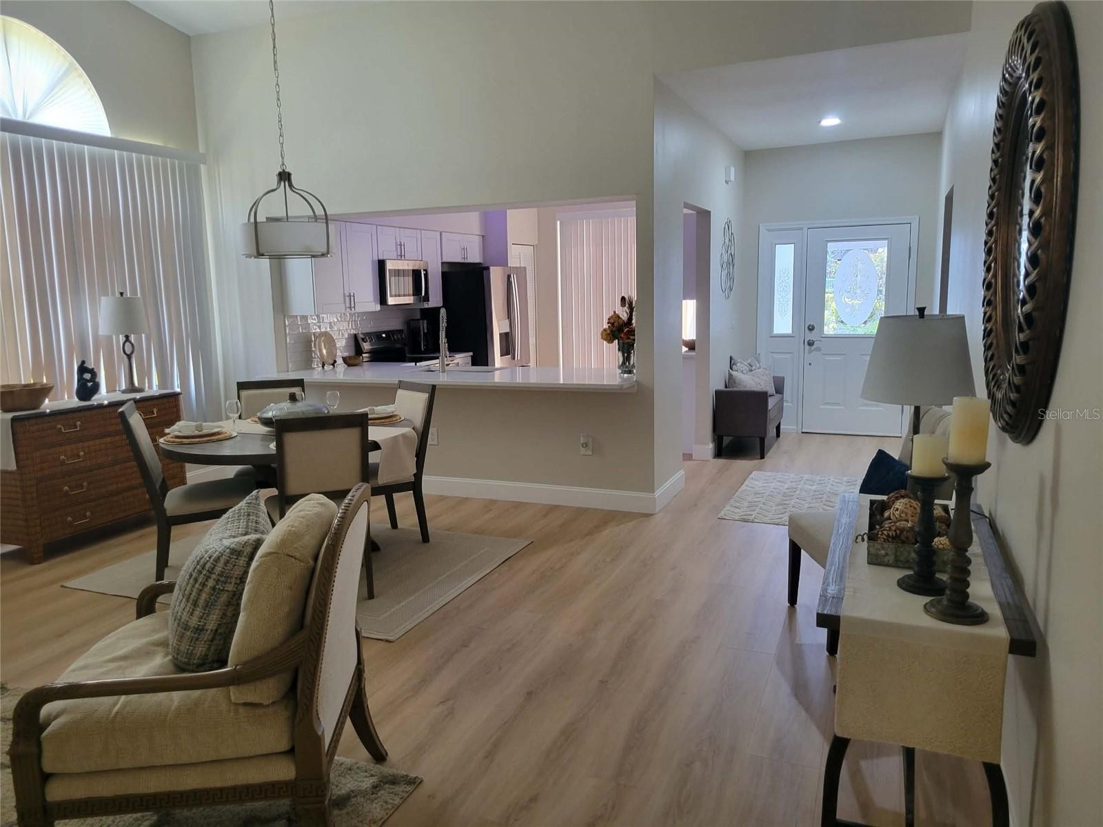 This home is "MOVE IN READY"! Recently remodeled, featuring two bedrooms and two bathrooms, blending modern finishes with classic design. As an end unit, the villa boasts soaring vaulted ceilings and abundant natural light, creating a spacious and serene atmosphere. The open layout, enhanced with luxury vinyl flooring, is ideal for entertaining. The kitchen, designed for any home chef, features new shaker-style cabinetry, white quartz countertops, stainless steel appliances, a subway tile backsplash, and a breakfast bar. Fun accent lighting in the kitchen and lanai offers dimmable, colored options to suit your mood. Designer touches abound, including modern ceiling fans, freshly painted neutral walls, new window blinds, and updated lighting throughout. Both bathrooms are bright and clean, with new vanities, sleek quartz finishes, contemporary fixtures, and updated tub and shower surrounds. The split floor plan ensures privacy in each bedroom, both offering generous closet space. This block constructed home also has a new roof installed in 2024, providing added protection and peace of mind. Hampstead Heath is characterized by tree-lined streets and mature landscaping, offering maintenance-free villa living and a friendly neighborhood atmosphere. The HOA recently installed new roofs, painted exteriors, updated courtyards, and resurfaced the heated pool, all while maintaining strong financial health. The Meadows community is centrally located has plenty of wildlife preserves, water features, and miles of nature trails. Despite its tranquil, park-like setting, it is just minutes from Benderson Park, local shops and eateries. The Meadows Country Club offers, golf, tennis, paddle ball, a pool and fitness center. It is important to emphasize that everything in this villa is brand new—unlike many listings that are merely "updated" or "renovated" over the years. The next owner will be the first to enjoy this comprehensive renovation, which includes new A/C system, new kitchen, new bathrooms, new roof and more.