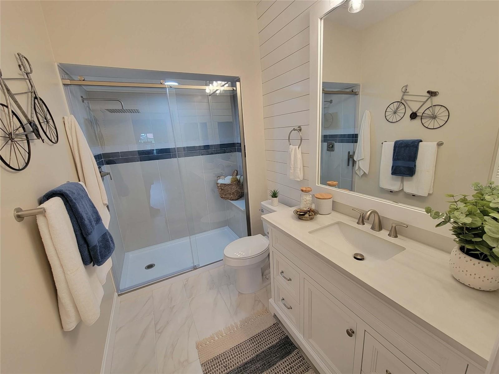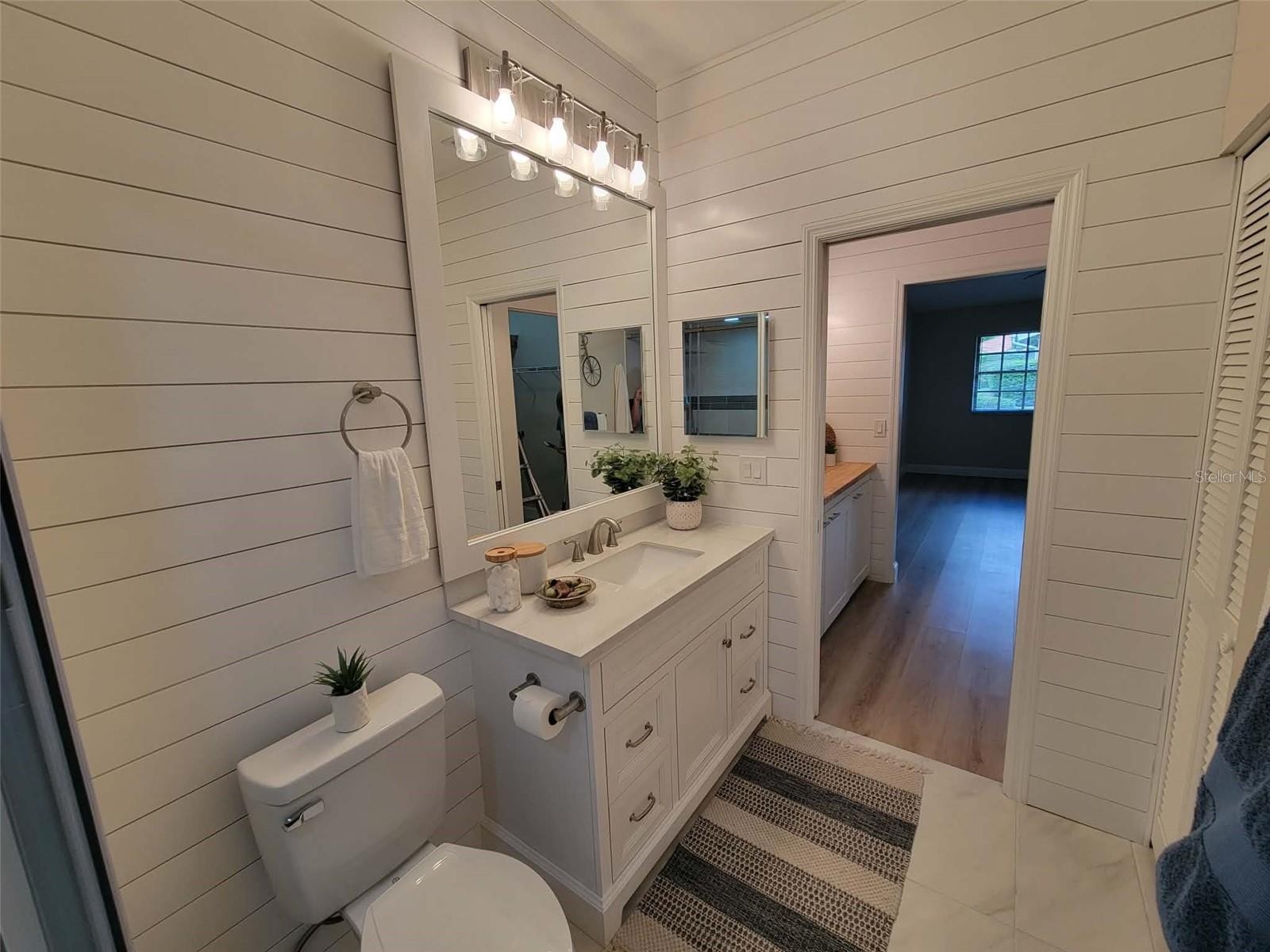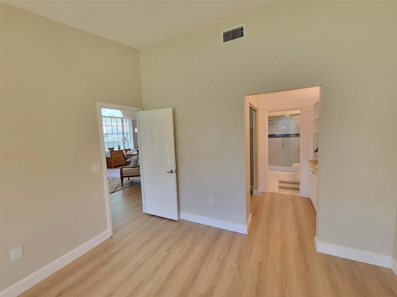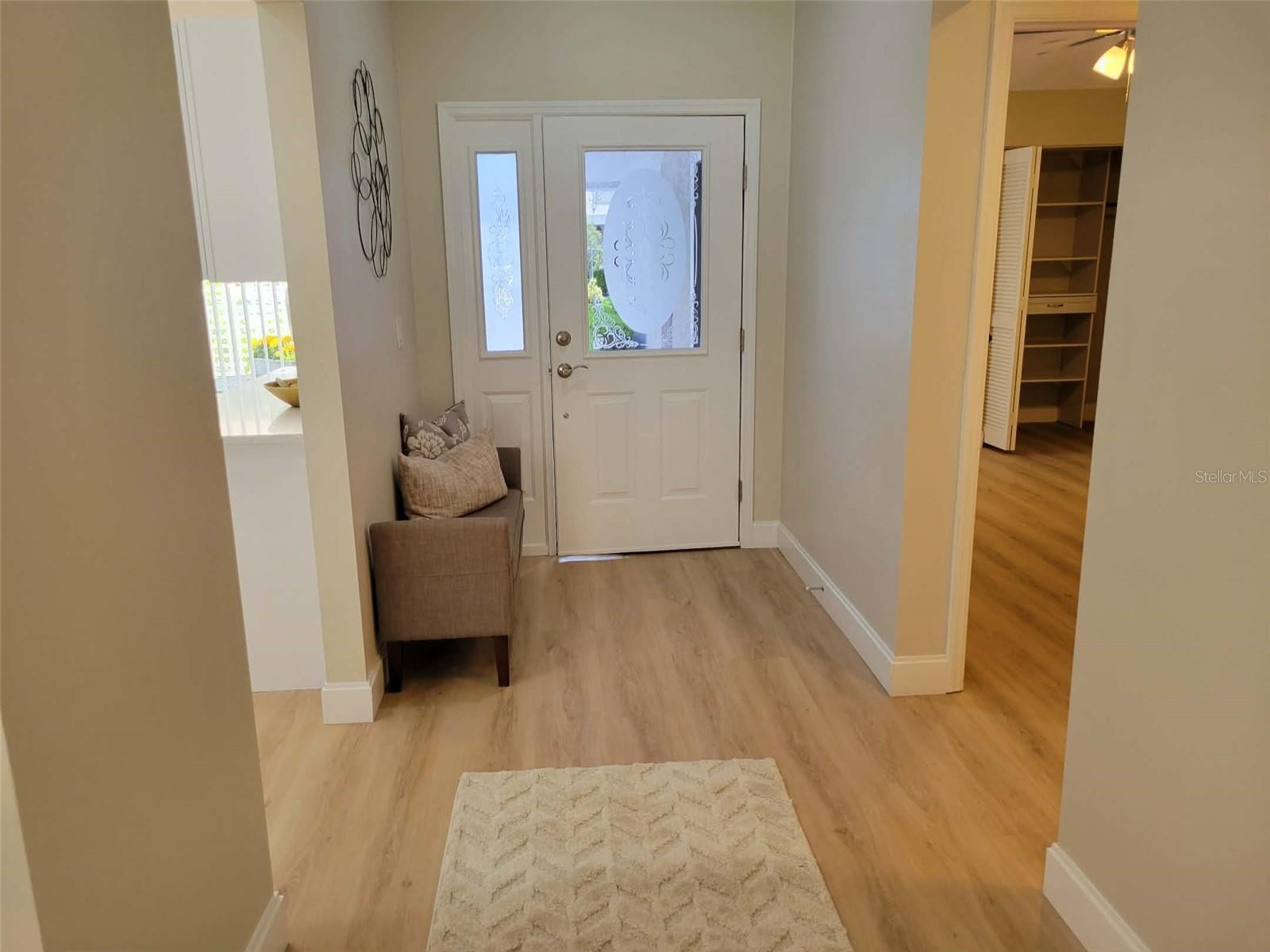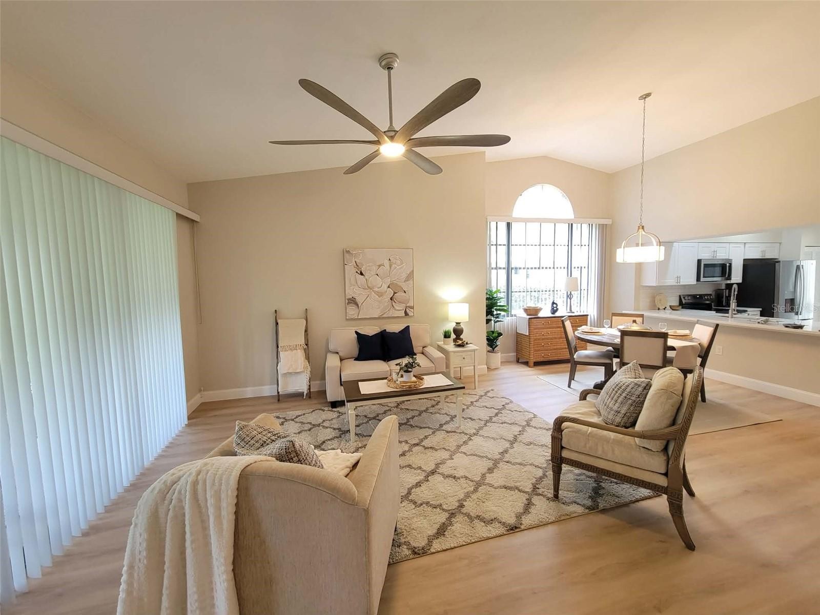 This home is "MOVE IN READY"! Recently remodeled, featuring two bedrooms and two bathrooms, blending modern finishes with classic design. As an end unit, the villa boasts soaring vaulted ceilings and abundant natural light, creating a spacious and serene atmosphere. The open layout, enhanced with luxury vinyl flooring, is ideal for entertaining. The kitchen, designed for any home chef, features new shaker-style cabinetry, white quartz countertops, stainless steel appliances, a subway tile backsplash, and a breakfast bar. Fun accent lighting in the kitchen and lanai offers dimmable, colored options to suit your mood. Designer touches abound, including modern ceiling fans, freshly painted neutral walls, new window blinds, and updated lighting throughout. Both bathrooms are bright and clean, with new vanities, sleek quartz finishes, contemporary fixtures, and updated tub and shower surrounds. The split floor plan ensures privacy in each bedroom, both offering generous closet space. This block constructed home also has a new roof installed in 2024, providing added protection and peace of mind. Hampstead Heath is characterized by tree-lined streets and mature landscaping, offering maintenance-free villa living and a friendly neighborhood atmosphere. The HOA recently installed new roofs, painted exteriors, updated courtyards, and resurfaced the heated pool, all while maintaining strong financial health. The Meadows community is centrally located has plenty of wildlife preserves, water features, and miles of nature trails. Despite its tranquil, park-like setting, it is just minutes from Benderson Park, local shops and eateries. The Meadows Country Club offers, golf, tennis, paddle ball, a pool and fitness center. It is important to emphasize that everything in this villa is brand new—unlike many listings that are merely "updated" or "renovated" over the years. The next owner will be the first to enjoy this comprehensive renovation, which includes new A/C system, new kitchen, new bathrooms, new roof and more.