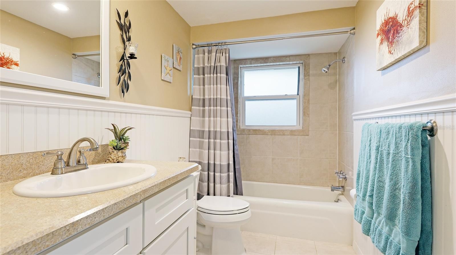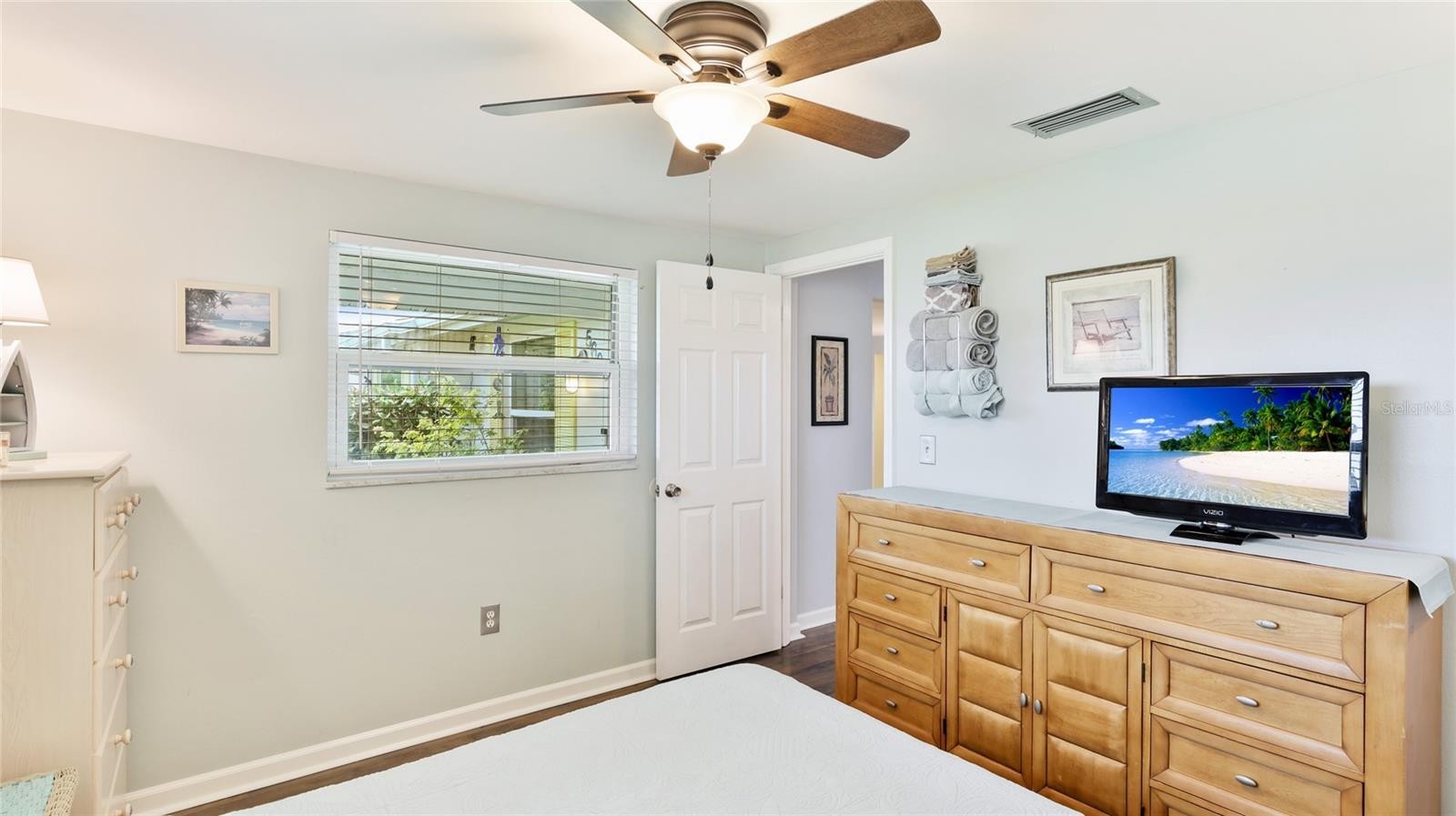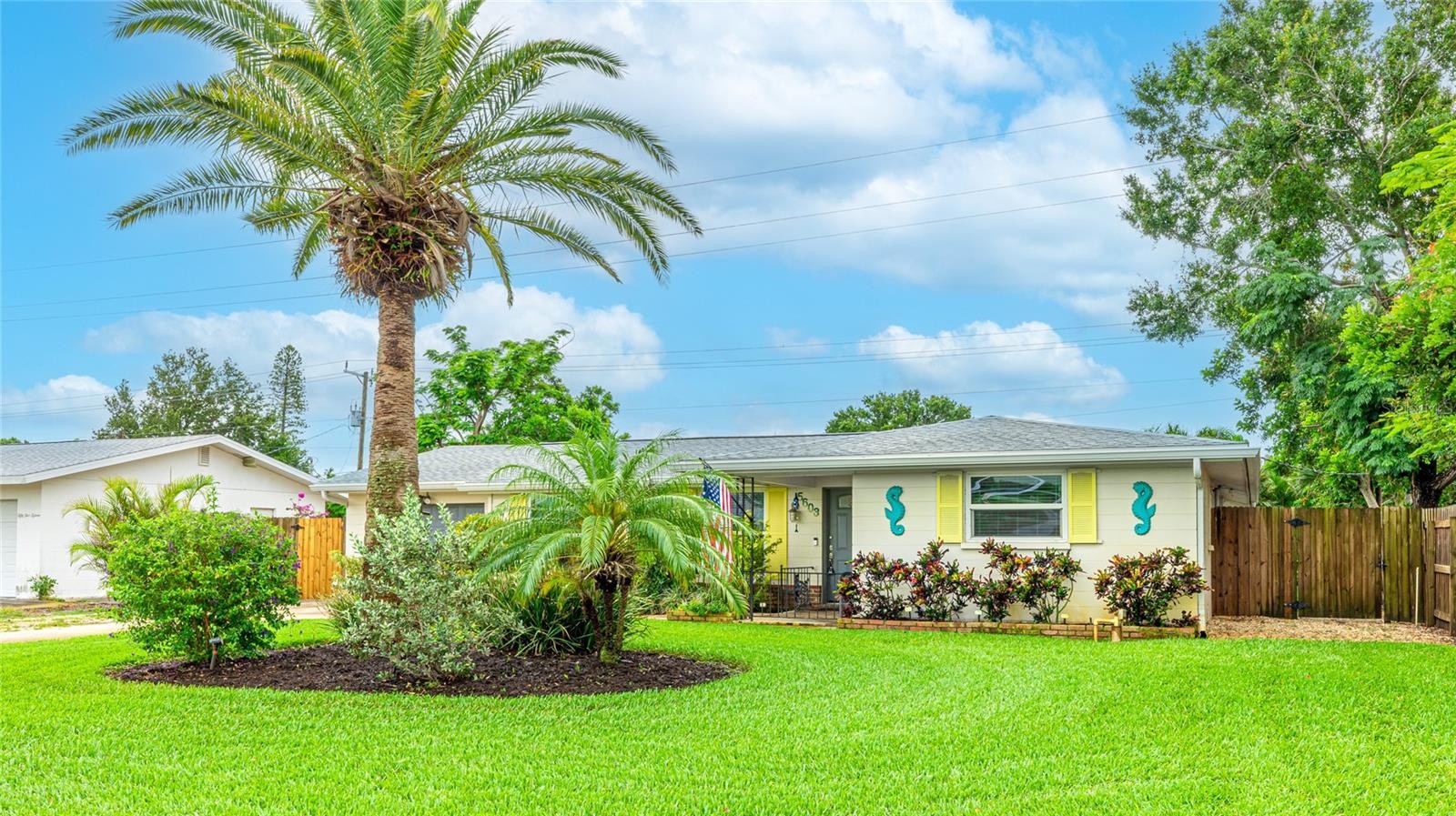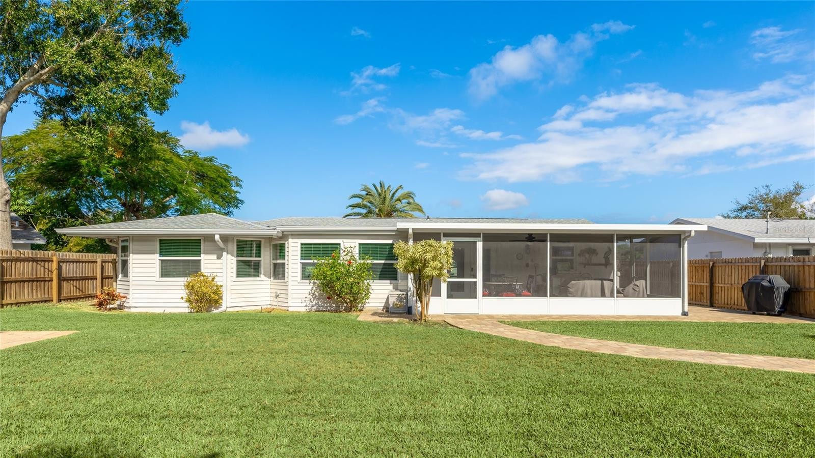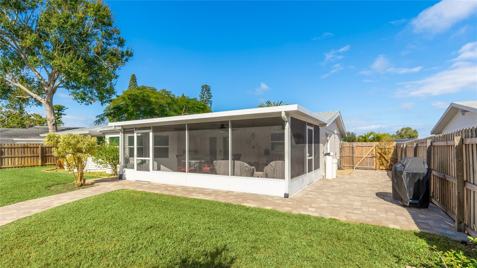 Completely UPDATED NW Bradenton Home near the beaches – Move-in ready with modern upgrades! This beautifully maintained 2-bedroom, 2-bath concrete block home with an OVERSIZED 1-car garage is located in a highly sought-after area, just minutes from stunning Anna Maria Island and the scenic trails of Robinson Preserve. Step inside to discover 1,573 sq. ft. of comfortable living space with engineered wood and ceramic tile flooring. NO carpet whatsoever. This spacious layout is light and bright and designed for easy living. This home has a modern kitchen with stainless steel appliances, a whole-house water softener and reverse osmosis system. All appliances stay including washer & dryer. Upgrades include NEW ROOF (2022), NEW A/C (2020). NEW REFRIGERATOR (2023), NEW WASHER AND DRYER (2022), NEW WATER HEATER (2019) AND UPDATED MASTER BATH (2018). All windows are IMPACT GLASS hurricane windows for peace of mind. SECURITY SYSTEM also included. Enjoy Florida living year-round in the large screened-in lanai (21x14), perfect for entertaining or relaxing. Large brick paved areas in the back and on the side of the home. The fully fenced backyard boasts lush landscaping and offers plenty of room for a pool. Spacious shed equipped with electricity. LAWN IRRIGATION SYSTEM run by a PRIVATE WELL —no metered water required! Driveway has extra spot for a second car or boat! PROPERTY HAS NEVER FLOODED, FLOOD ZONE X so lender will NOT require flood insurance. Close to top-rated schools, shopping, restaurants, fitness centers and some of the finest beaches in the world!