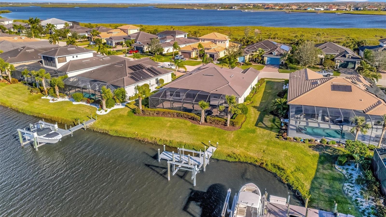 One or more photo(s) has been virtually staged. Interior Freshly painted! Seller Motivated – Offering $5,000 credit toward closing costs or buyer’s choice of use! Welcome to Tidewater Preserve, Bradenton’s premier boating community, perfectly situated along the scenic Manatee River. This stunning Boretto Model offers breathtaking waterfront views and blends luxury finishes with resort-style living in a private, guard-gated setting. Featuring 3 bedrooms plus a den, 3 baths, and a 3-car garage, this freshly painted home boasts a spacious open floor plan designed for both comfort and entertaining. The chef’s kitchen showcases wood cabinetry, quartz countertops, a large island, stainless steel appliances including a new Samsung refrigerator (2023) and dishwasher (2024), a touchless faucet, and a walk-in pantry with custom shelving. The primary suite offers maximum privacy with a spa-like bath featuring dual sinks, a soaking tub, a walk-in shower, and expansive custom his-and-her closets. Two guest bedrooms with two baths are located on the opposite side of the home for separation and comfort, while a large den provides the perfect office or flex space. Set on a 110-foot waterfront lot with a 12,000 lb boat lift and Trex dock, the outdoor oasis is designed for year-round enjoyment. The oversized salt-generated Pebble Tec pool and spa feature LED lighting, a dramatic waterfall with firewall, and a new rapid heater, all enclosed by a no-see-um screen for comfort. Entertain with a fully equipped outdoor kitchen, relax around the gas firepit with cozy seating, or unwind under the remote-controlled awning and privacy screens. Additional features include a dedicated pool bath, whole-house Kinetico water softener, smart thermostat, Ring doorbell, tankless water heater, custom closets, premium surround sound system inside and out, and extended driveways. Recent updates in 2024 include freshly painted interior and exterior, roof cleaned and sealed, and HVAC and ductwork serviced. Tidewater Preserve offers a true Florida lifestyle with 24-hour guard security, three resort-style pools, two fitness centers, tennis courts, clubhouse, riverfront nature trails, a dog park, playground, kayak launch, and marina—all with no CDD fees. Boating enthusiasts will love the community boat lift with direct access to the Manatee River, perfect for reaching your favorite waterfront restaurant, Anna Maria Island, or Egmont Key. End each day with breathtaking sunsets from your private dock and embrace the ultimate waterfront lifestyle in Bradenton’s most sought-after community.