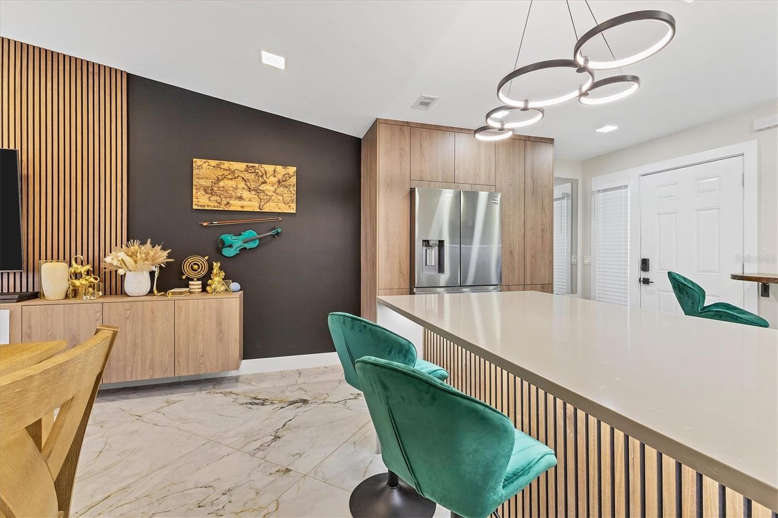 Monthly rate advertised subject to length and 3+ months off season lease. October and later in season rate of $4750 and up to $7000 for December January and February. Subject to change and other terms of the lease contract. pricing inquiries. Prices are subject to change due to availability, duration of stay and months chosen. This fully furnished 2-bedroom, 2-bathroom condo invites you to stay longer, with its meticulously decorated, contemporary design featuring touches of luxury. Recently remodeled with premium materials, it offers an open-concept kitchen and living area with plenty of space to relax. The living area seamlessly connects to a screened balcony, creating even more open space when the electric folding zebra blinds are raised, allowing easy access through sliding doors. These blinds not only provide privacy when needed but also help create a light, airy feel when fully opened. The kitchen is designed for style and functionality, with 42” custom European cabinets, level 4 quartz countertops, a built-in counter-depth fridge, induction cooktop, convection microwave oven (Bosh), ultra-quiet dishwasher, water filtration system, and a custom wine bar corner that doubles as a work area. Exceptional sound insulation enhances privacy, with concrete block walls between units and an acoustic-paneled wall in the living room. Floating cabinets with a built-in fireplace bring unique charm and a cozy ambiance to the space. LED lighting throughout ensures every corner is well-lit. Both bathrooms are fully remodeled to match the condo's distinct design, each featuring spa-like rainfall shower systems with handheld wands. The guest bathroom also includes a bidet. The master bedroom features a sturdy king-size bed, while the guest bedroom has a full-over-queen bunk bed. The in-unit laundry includes a smart and quiet washer and dryer. In addition, the community offers a refreshing 8.5-foot-deep pool. Perfectly located just a short drive from the beach and ample shopping options, this unit sits at the rear of the complex, away from the main road, offering enhanced privacy and a lounge-like feel on your private screened balcony.